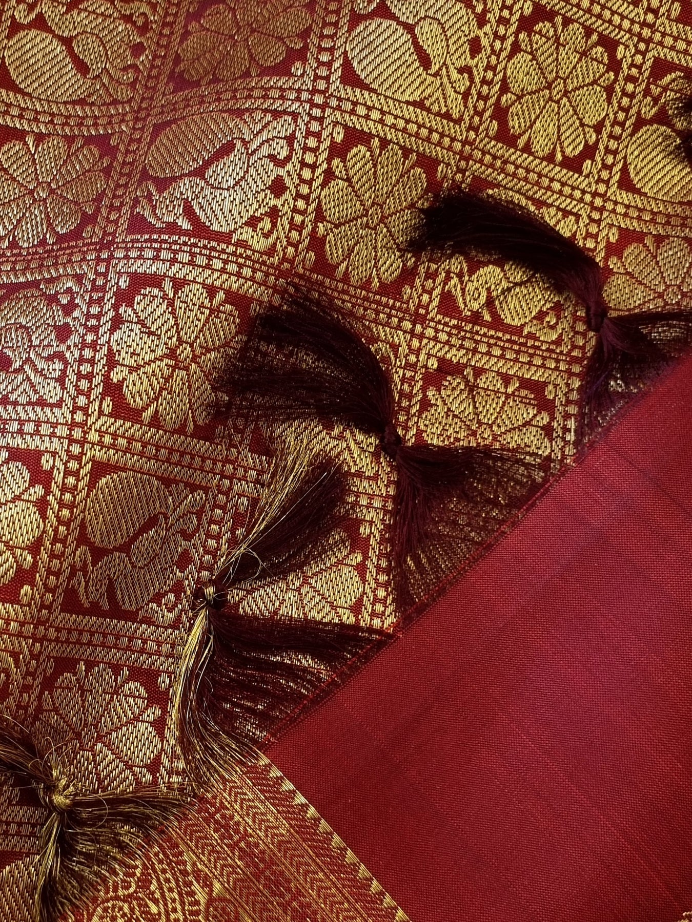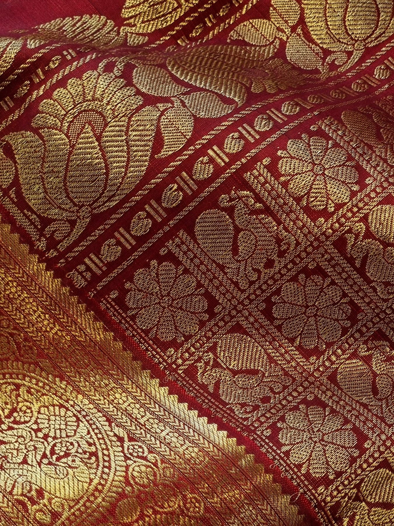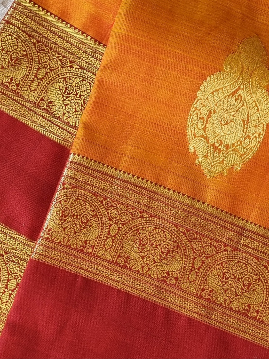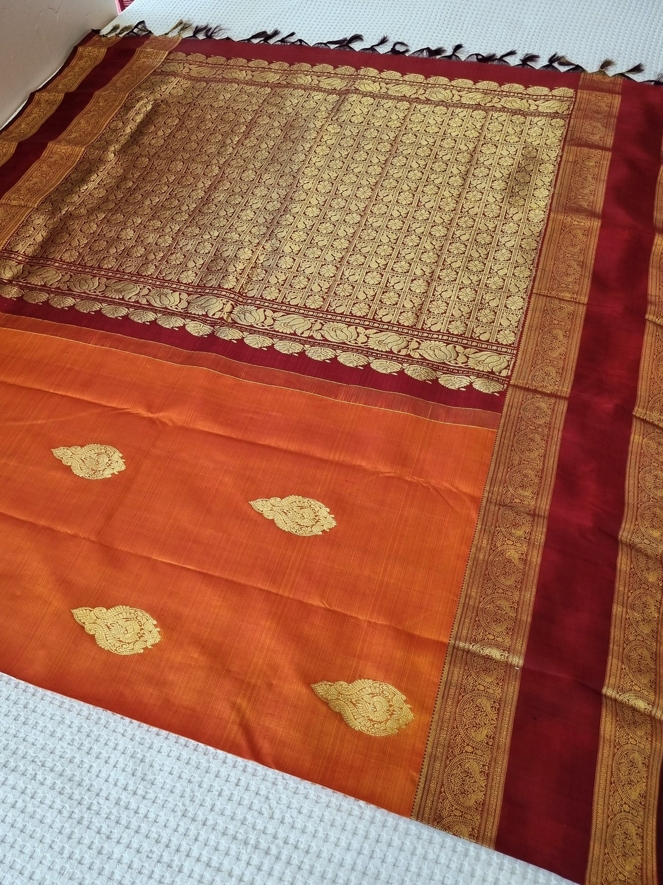 An elegant Kanjivaram Pure Silk Saree with Contrast borders and Gold Motifs on the Body and Pallu.