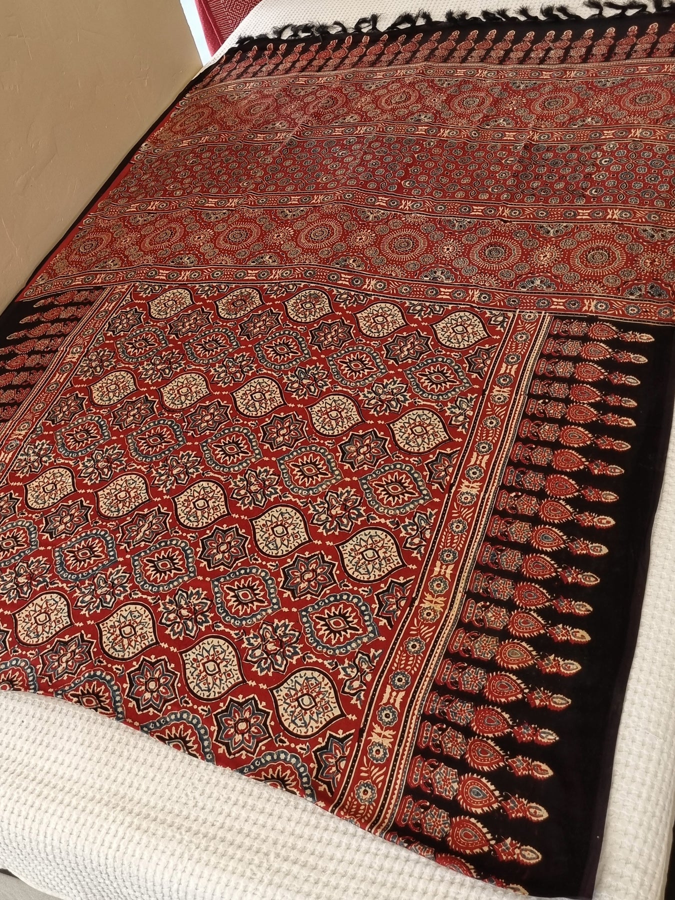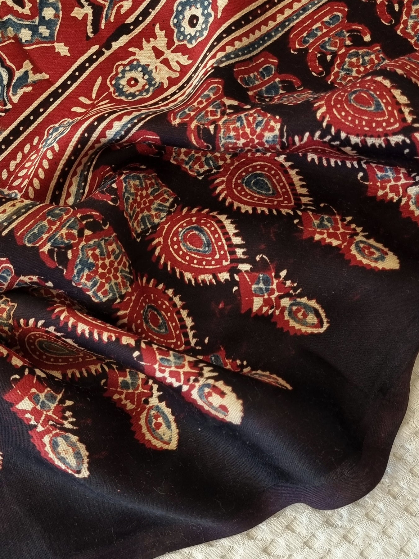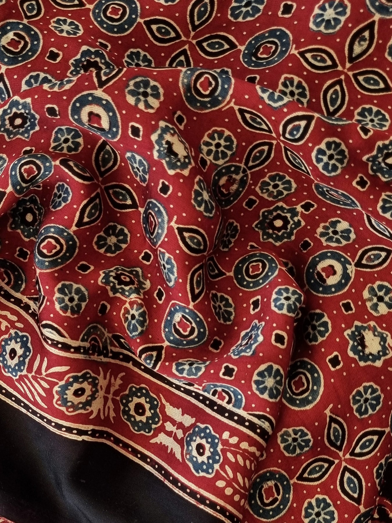 • Ajrakh block printed modal silk saree, made using natural dyes through traditional ajrakh technique of hand block printing practised by the artisans in Kutch region of Gujarat.