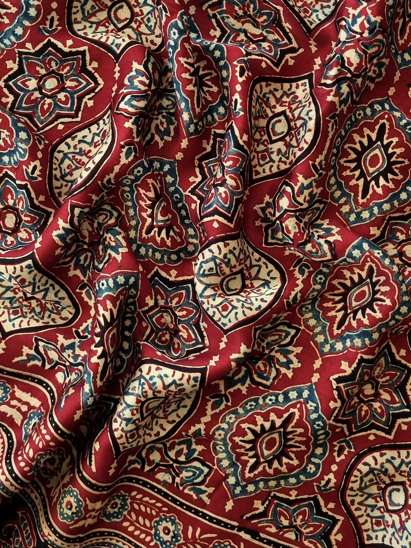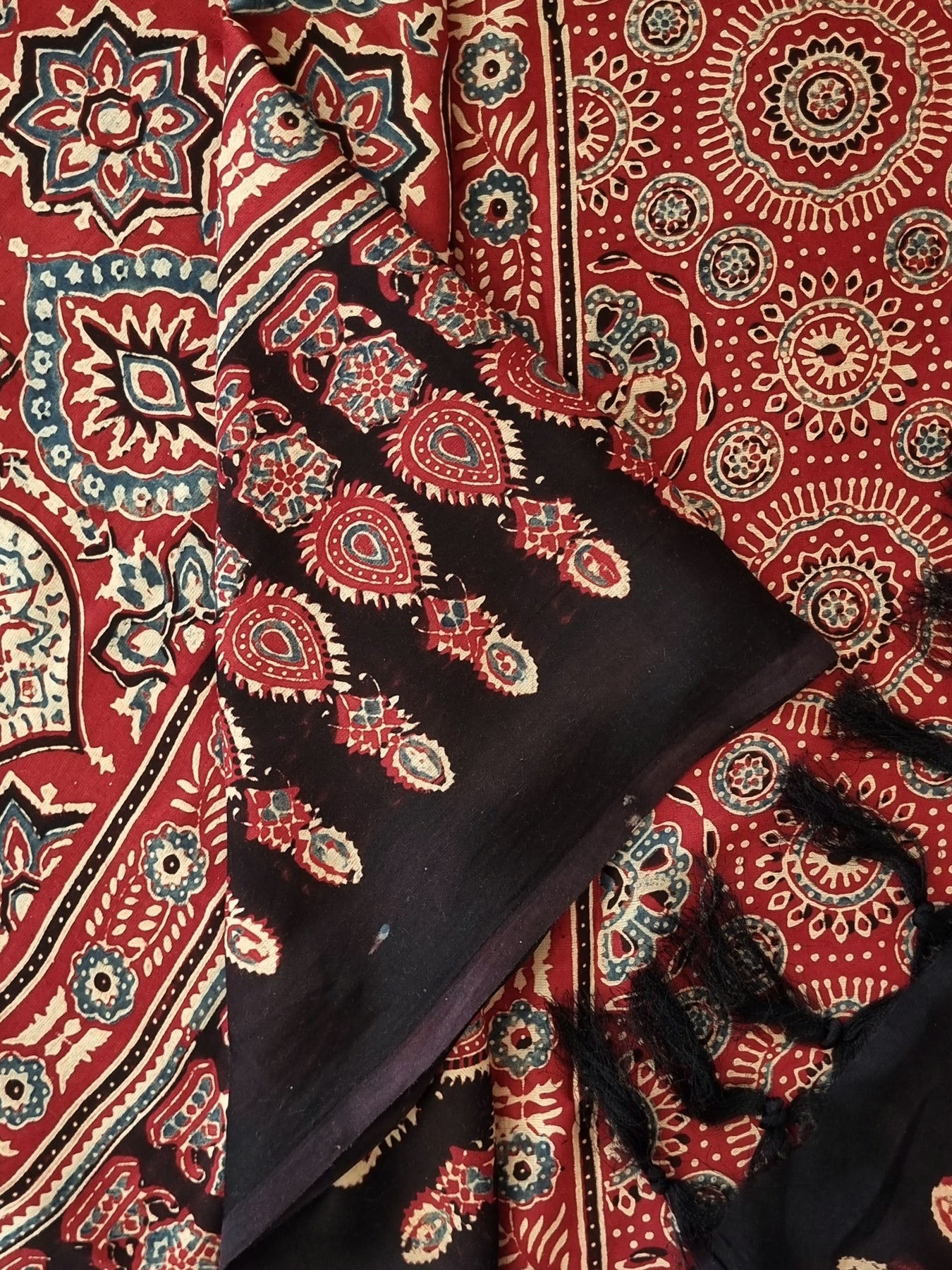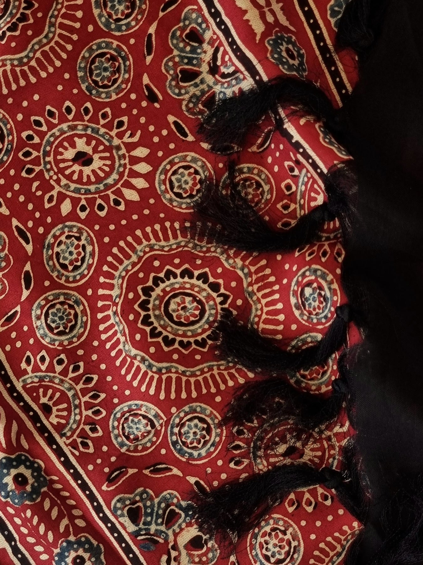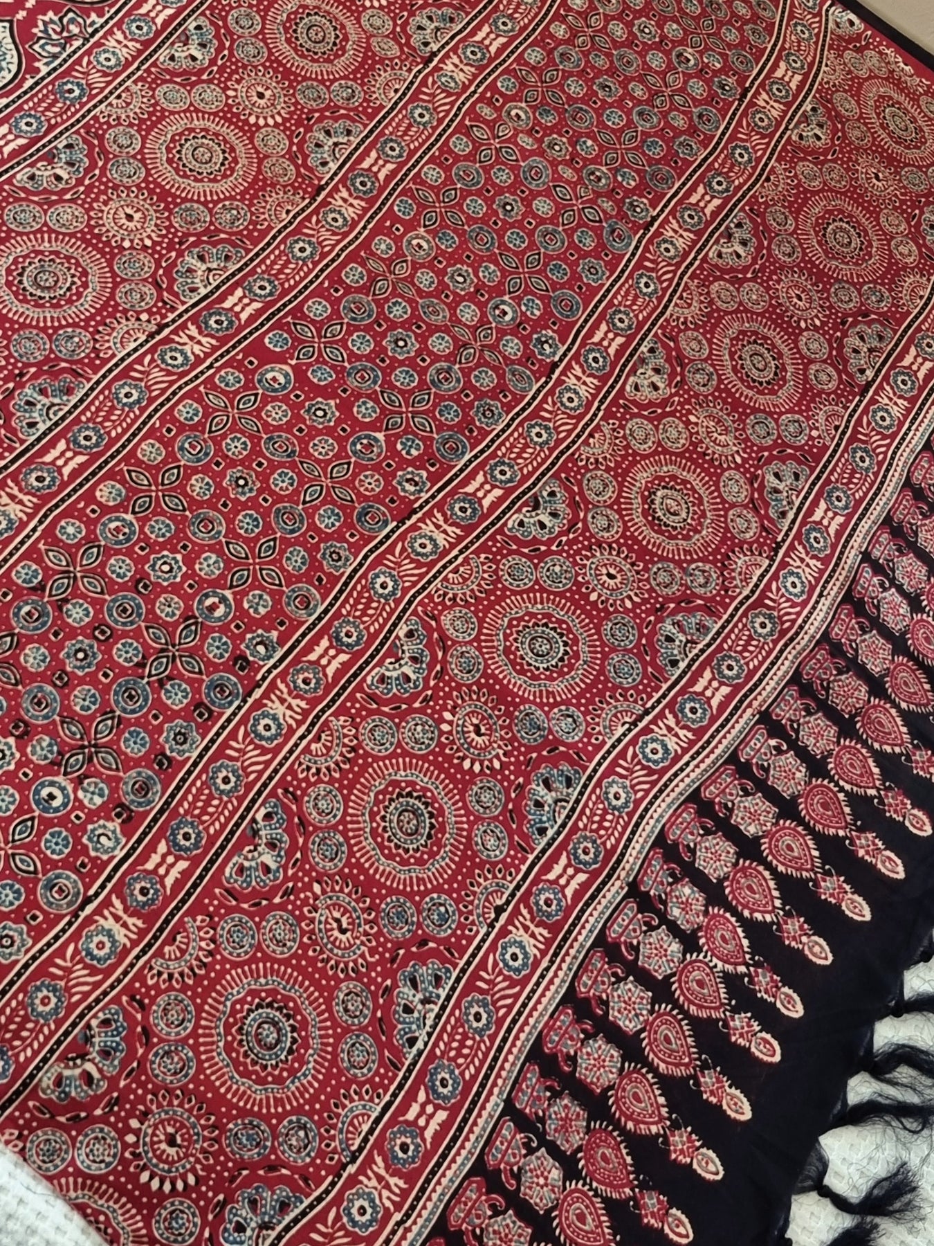 • Ajrakh block printed modal silk saree, made using natural dyes through traditional ajrakh technique of hand block printing practised by the artisans in Kutch region of Gujarat.