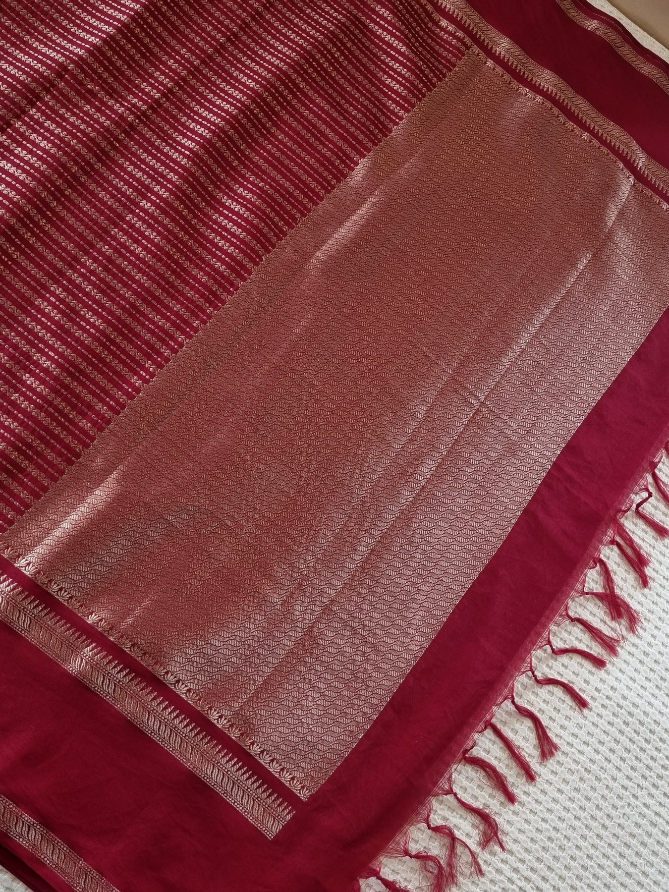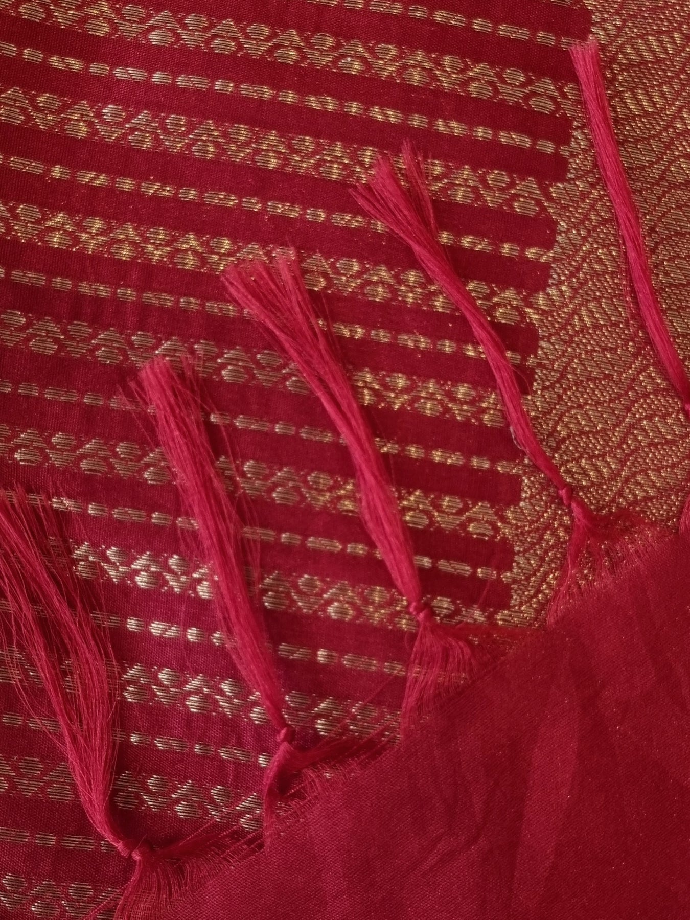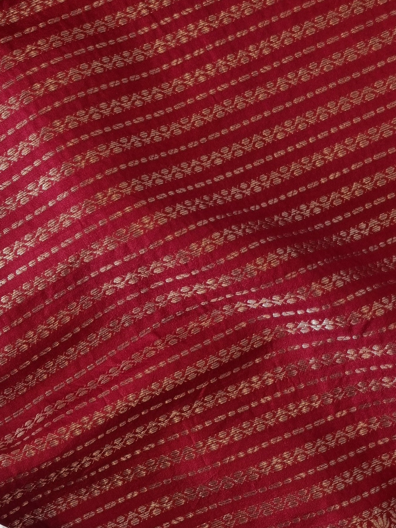 • Red Striped Semi Silk Saree, with gold borders, paired with a Semi Silk Blouse fabric