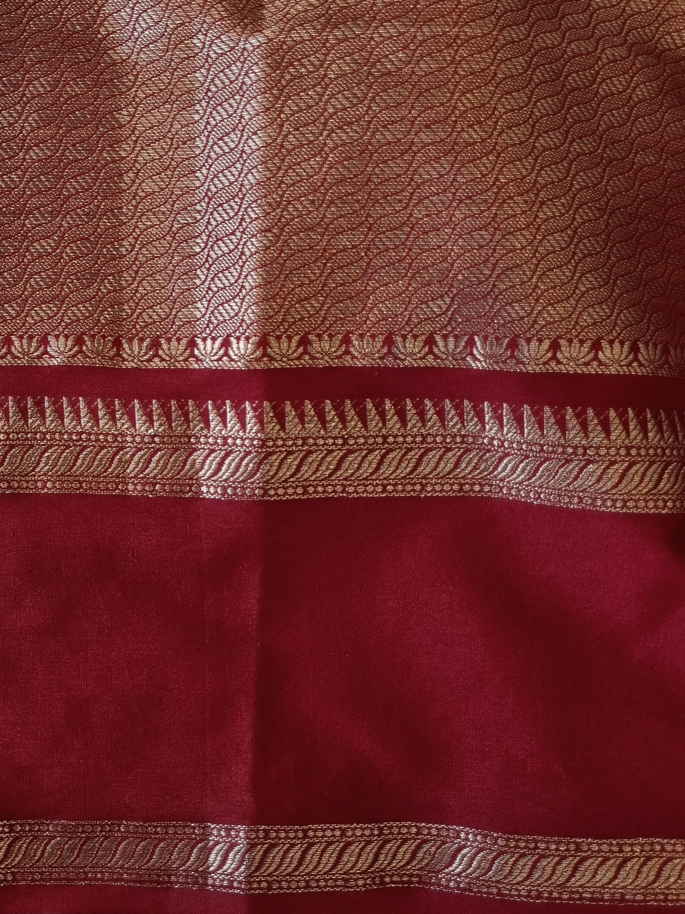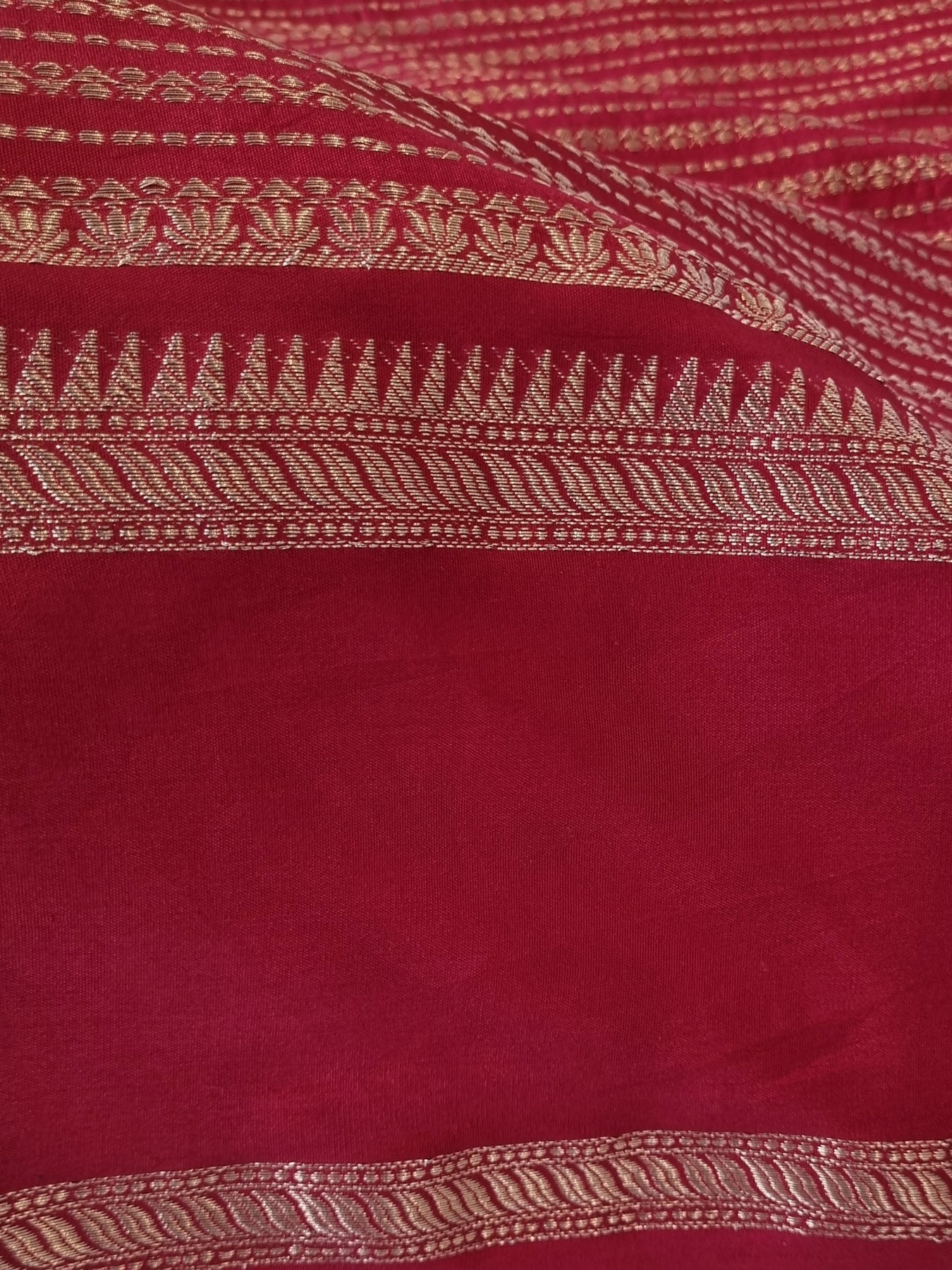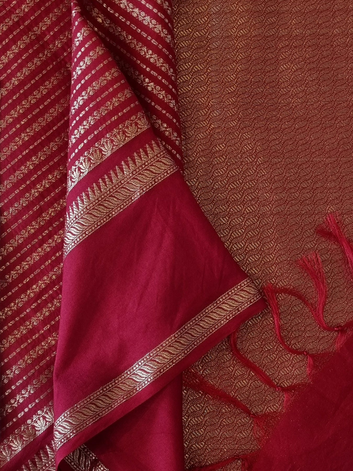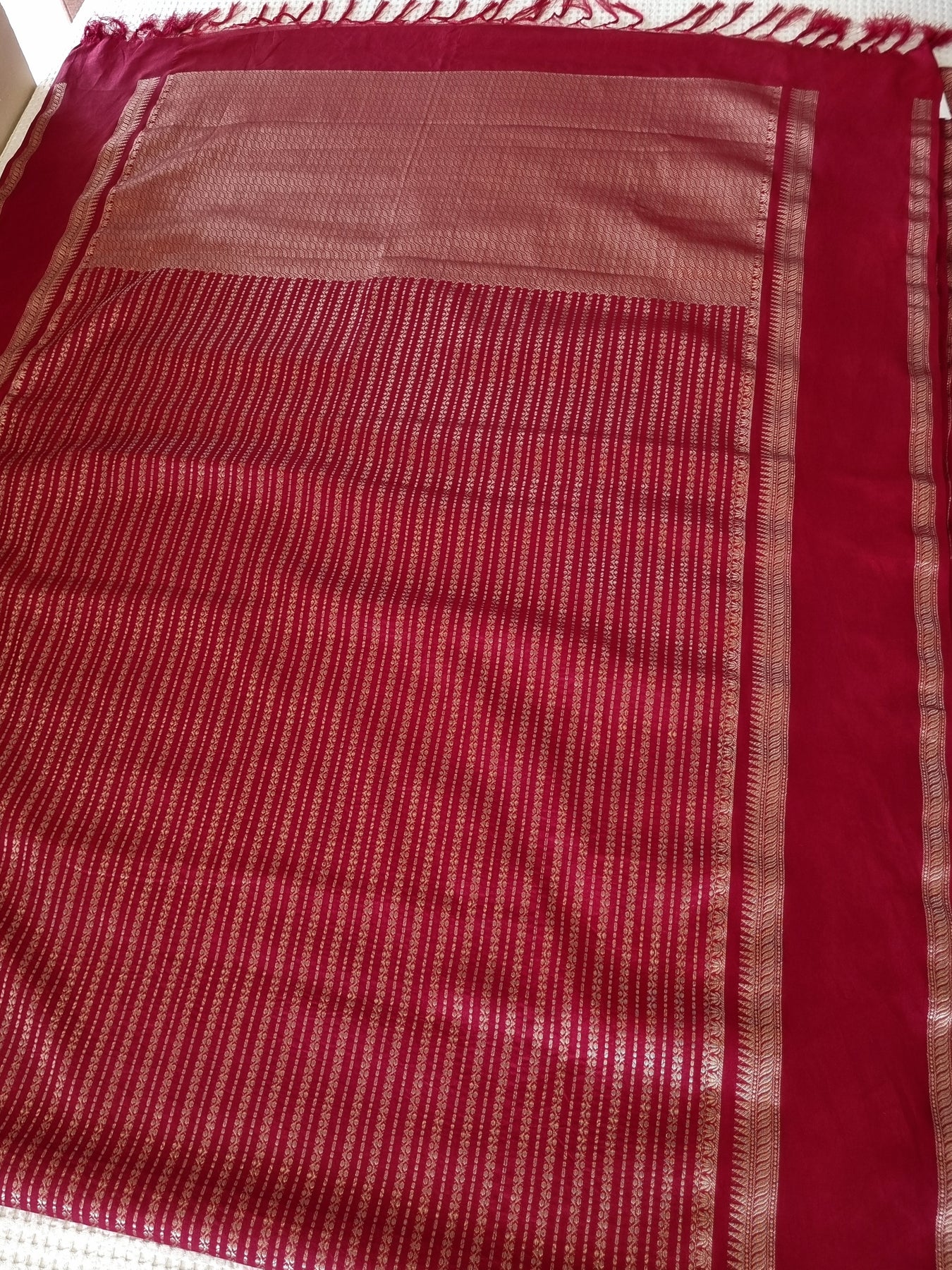 • Red Striped Semi Silk Saree, with gold borders, paired with a Semi Silk Blouse fabric