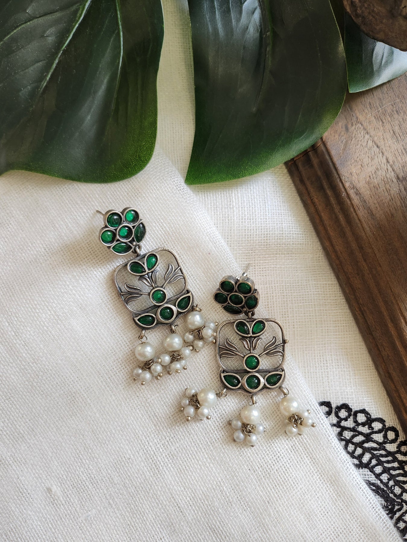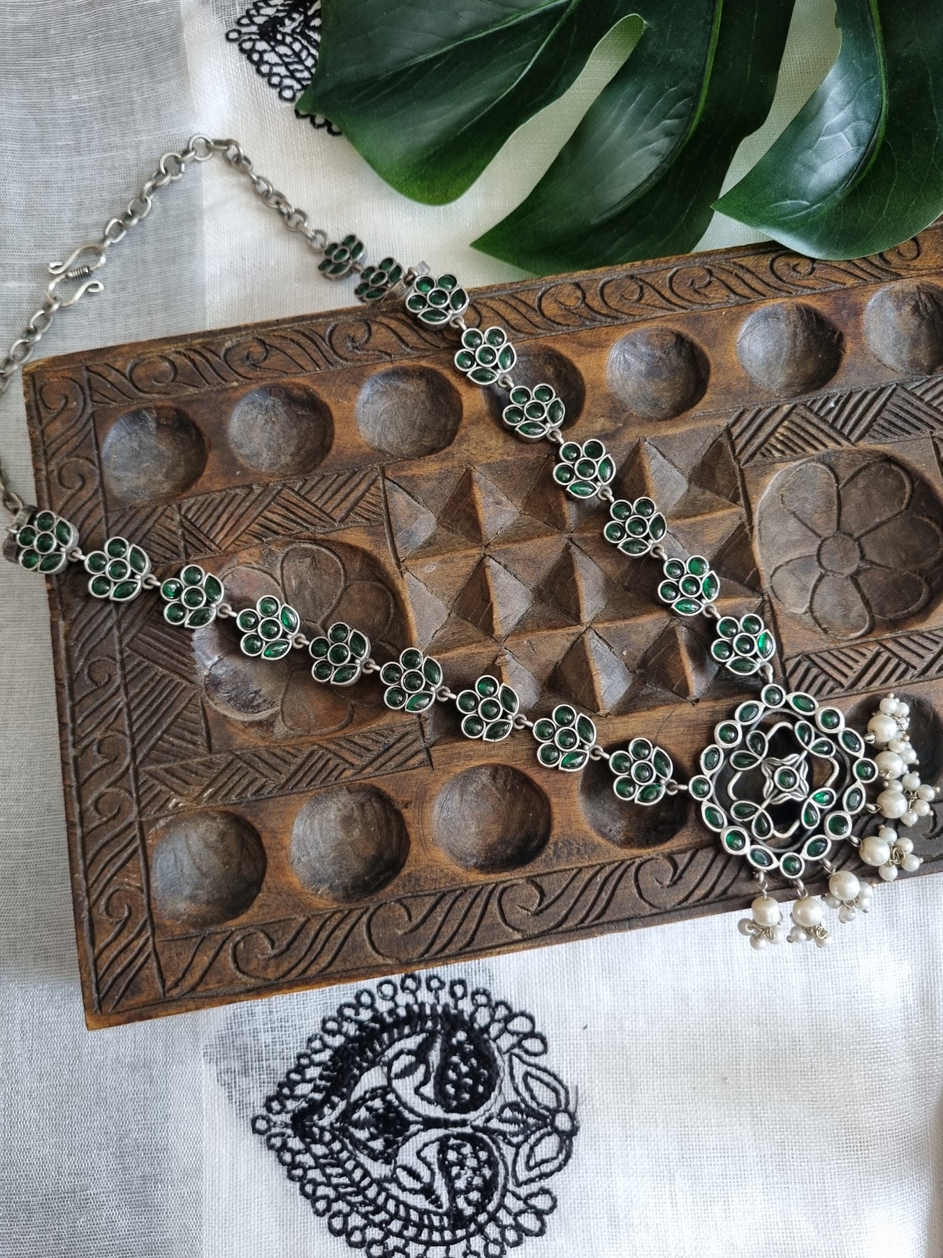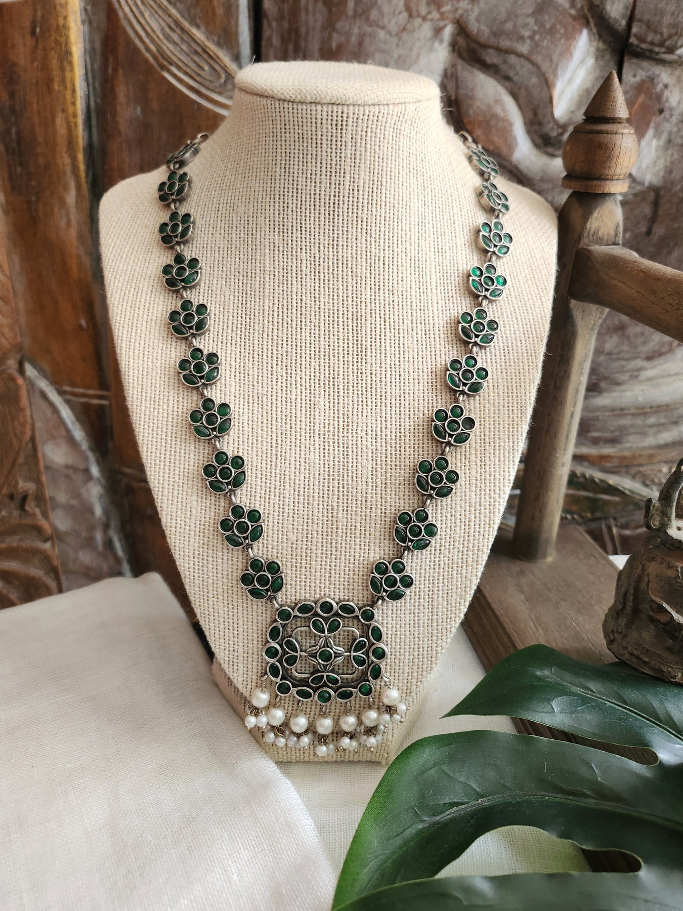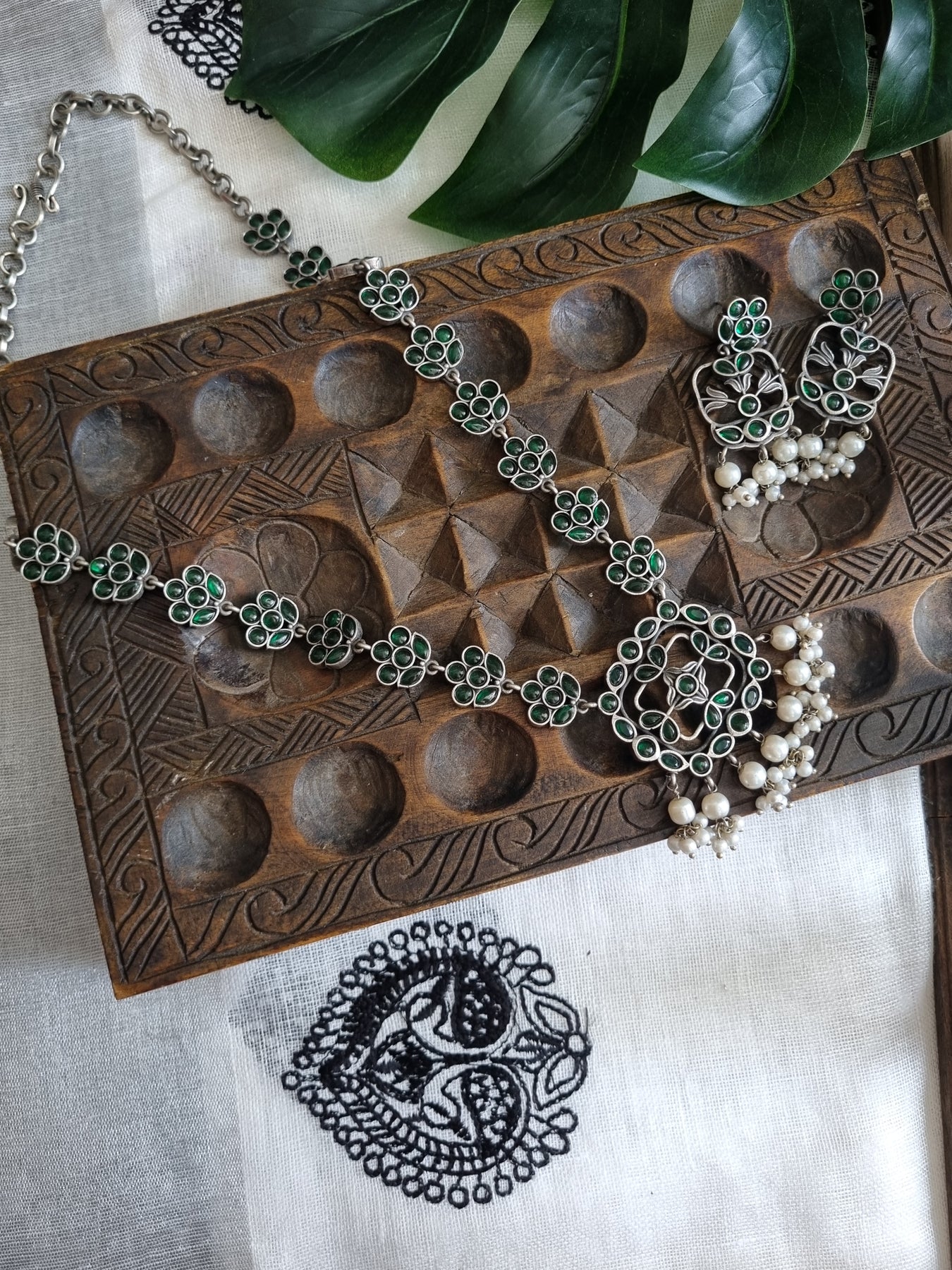 Oxidised Silver Necklace with Green Stones and pearls paired with matching Earrings