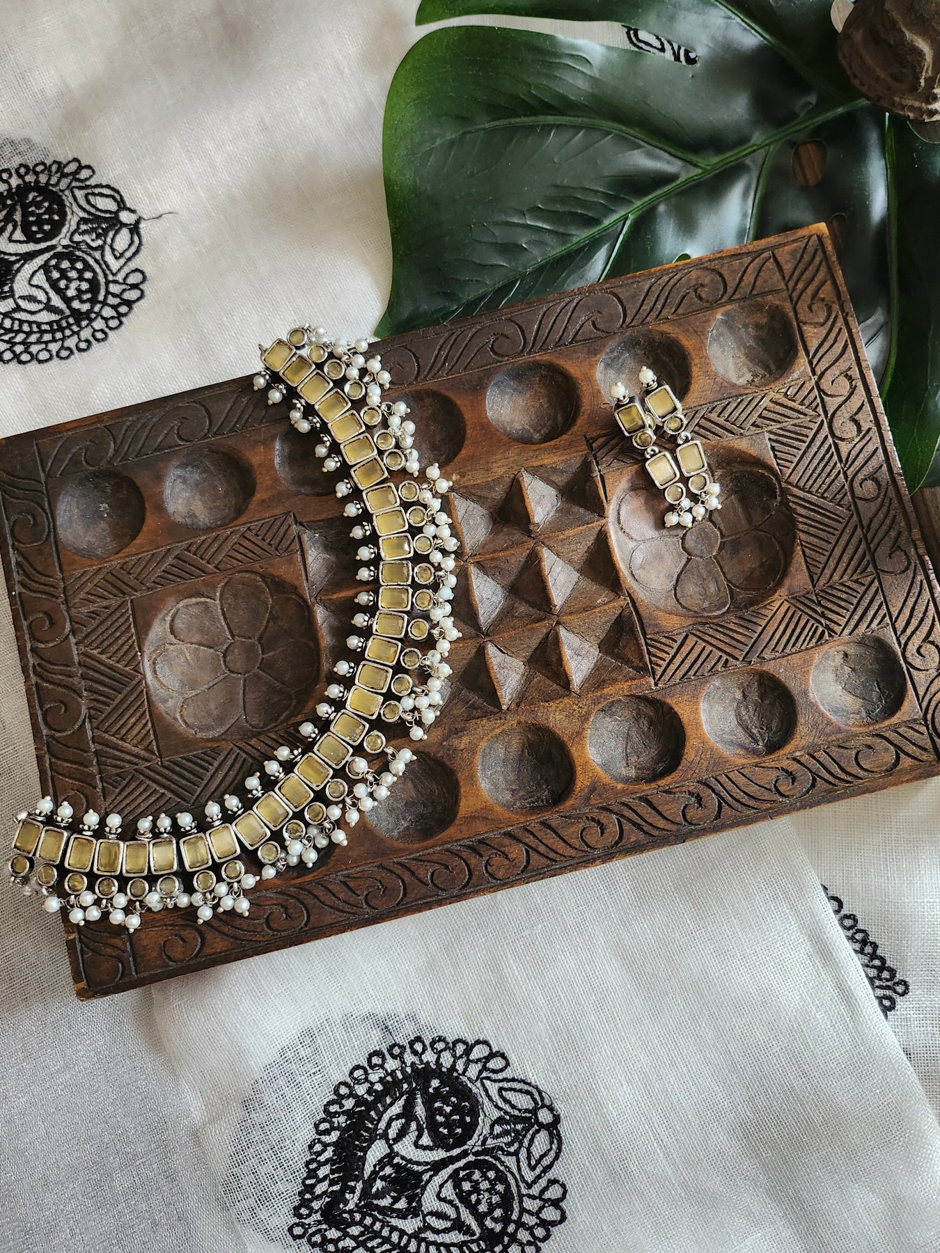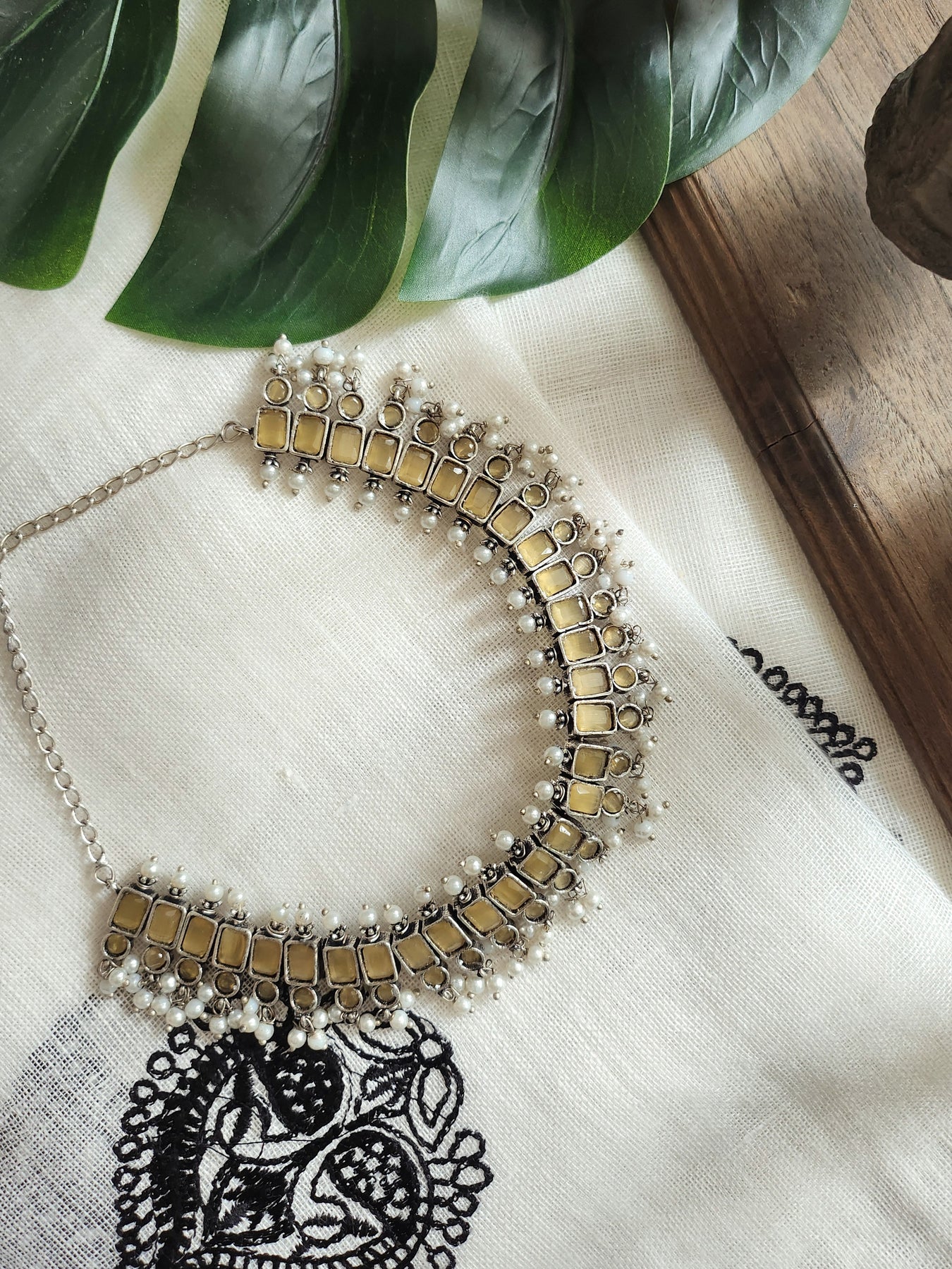 Oxidised Silver Stone Necklace with Yellow Stones paired with matching Earrings