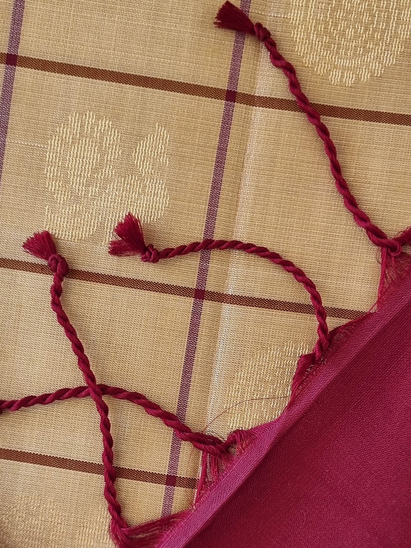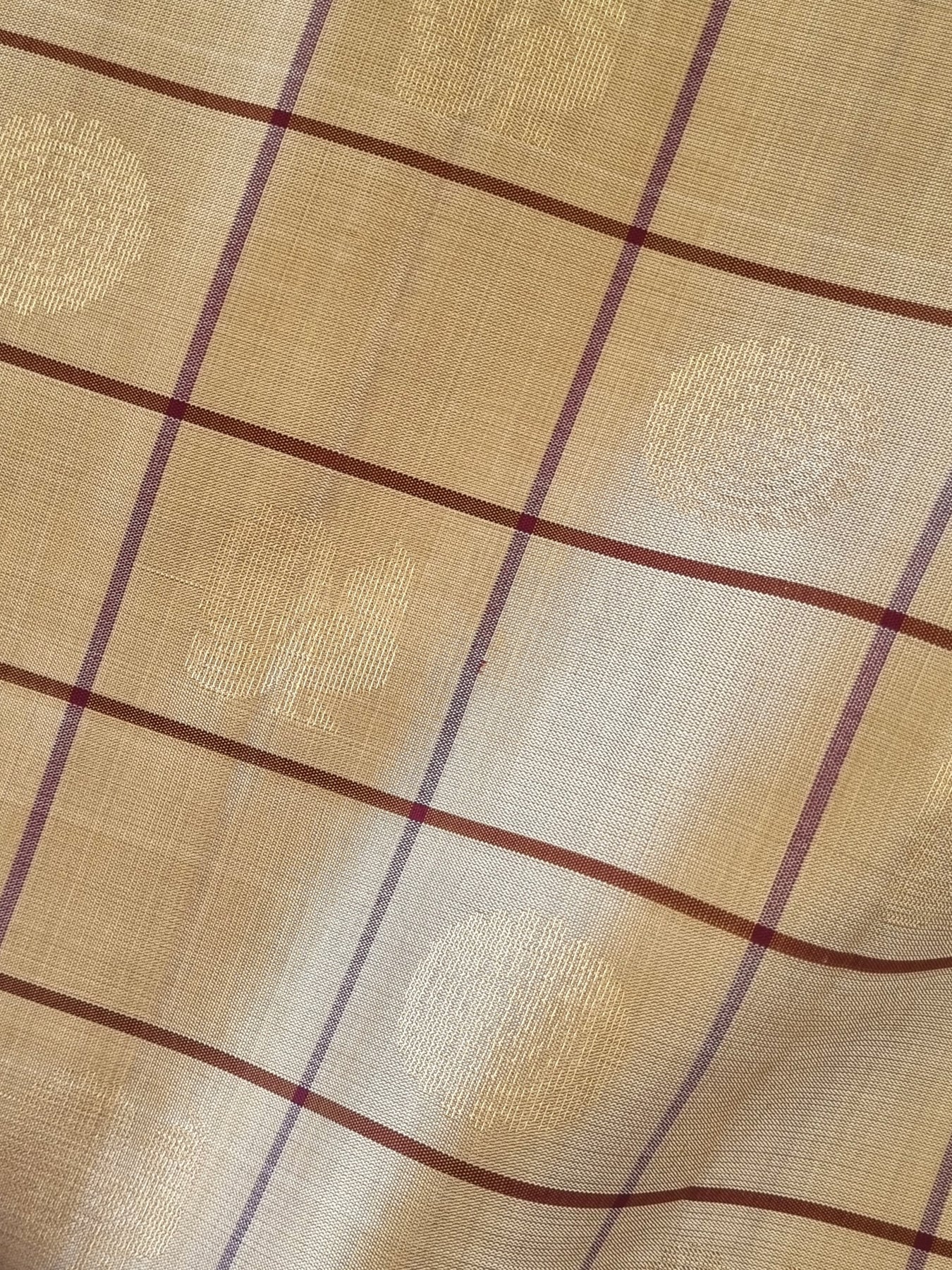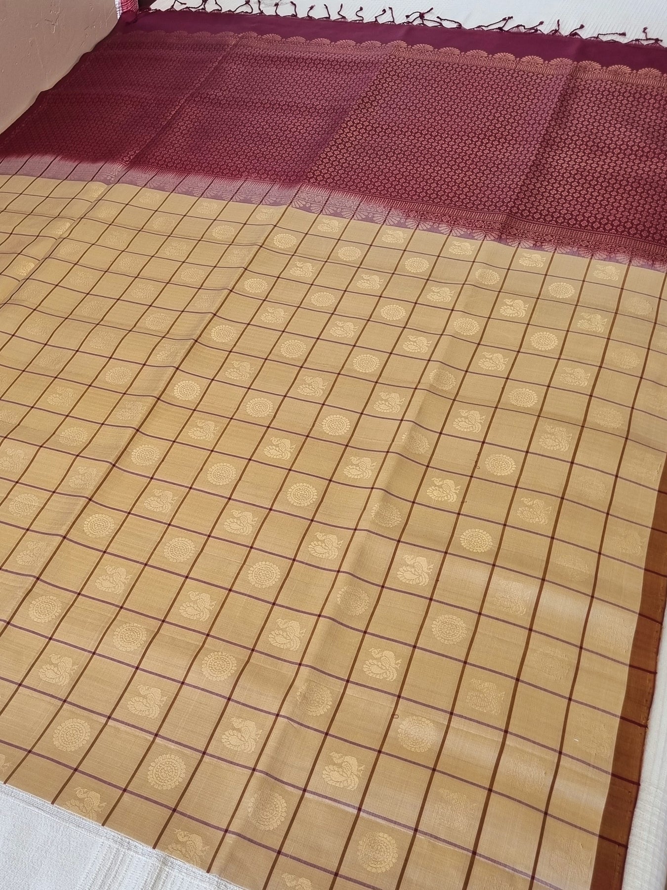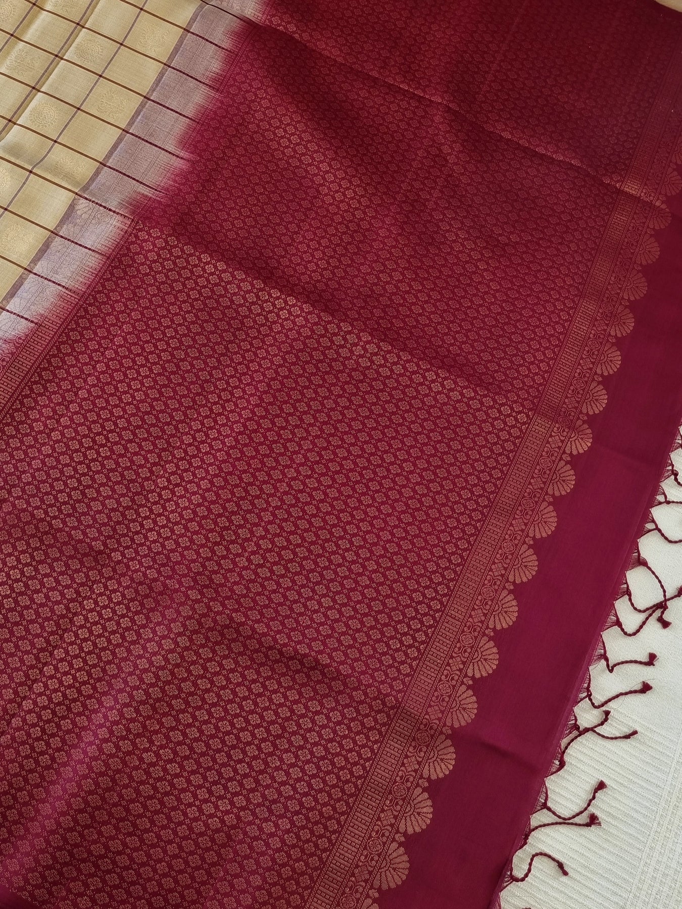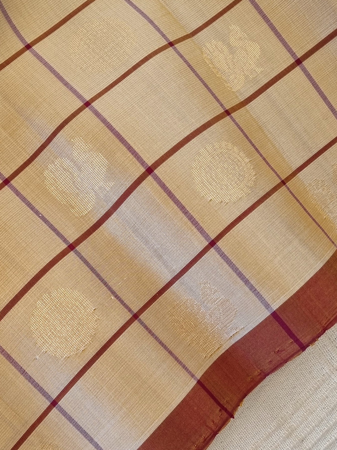 Beautiful Handwoven Soft Silk Saree with an elegant checked body and intricately woven gold motifs on the body and a rich contrast pallu