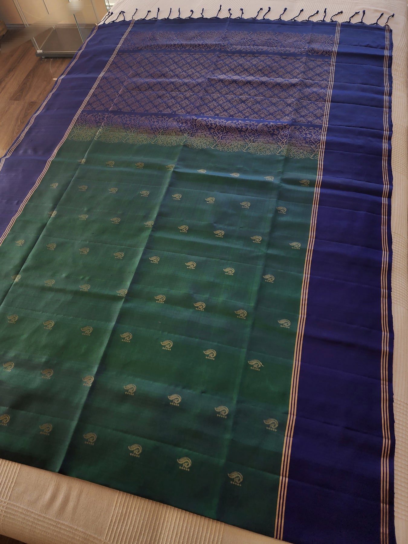 Beautiful Handwoven Soft Silk Saree with a contrast edgings and intricately woven gold motifs on the body and a rich woven pallu
