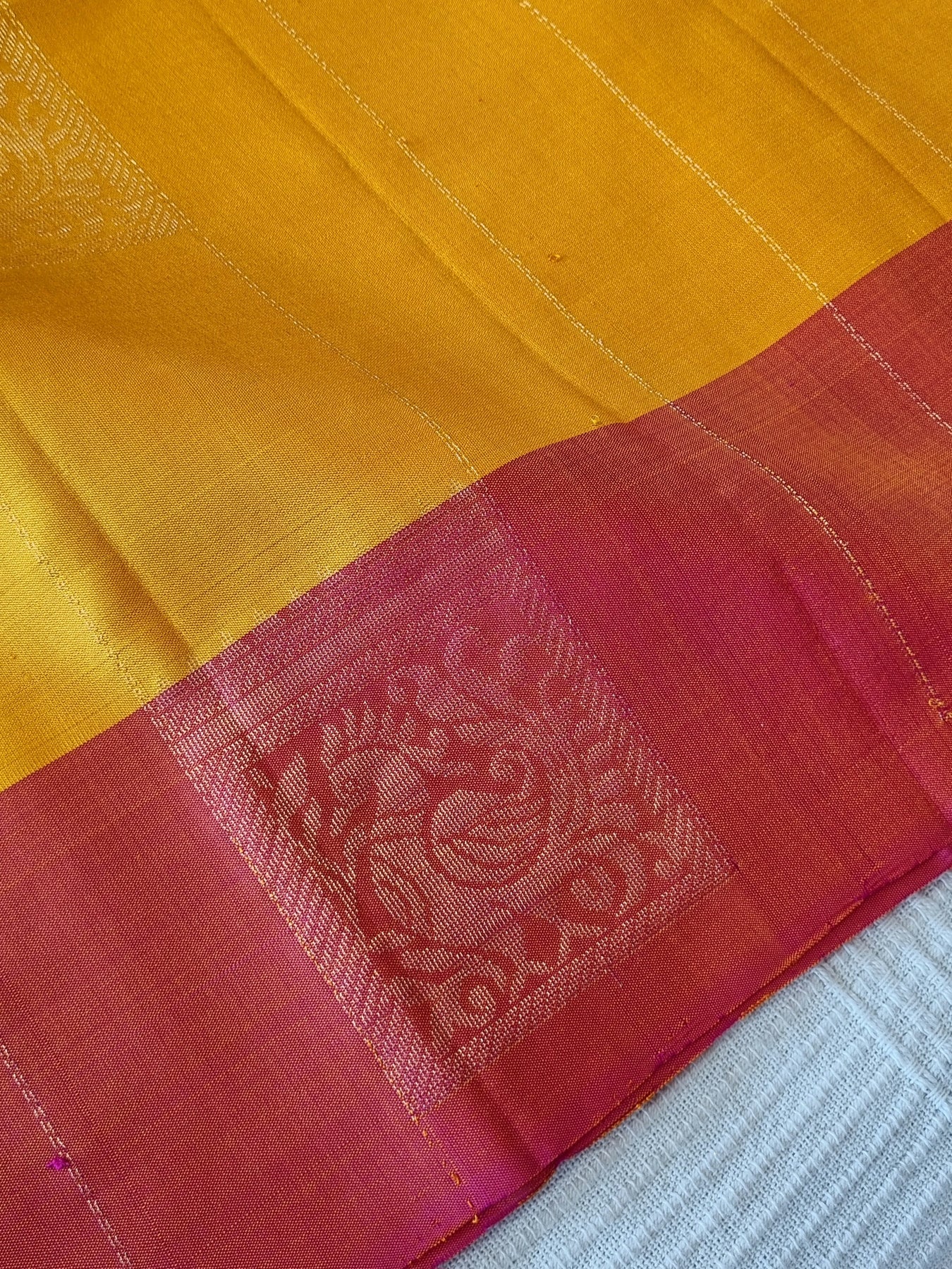 Beautiful Handwoven Soft Silk Saree with a contrast edgings and intricately woven gold motifs on the body and a rich woven pallu