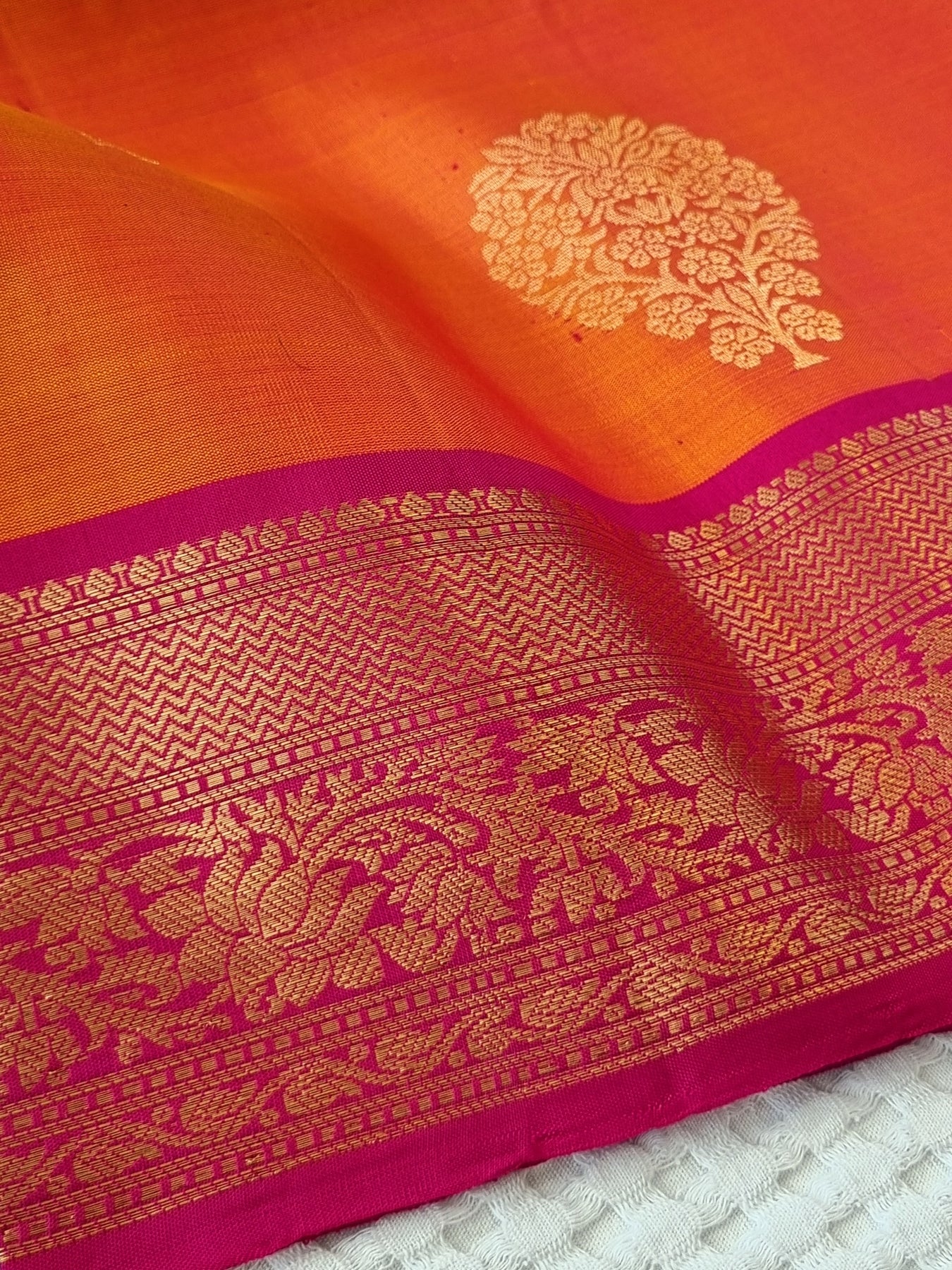 Beautiful Handwoven Soft Silk Saree with a contrast edgings and intricately woven gold motifs on the body and a rich woven pallu