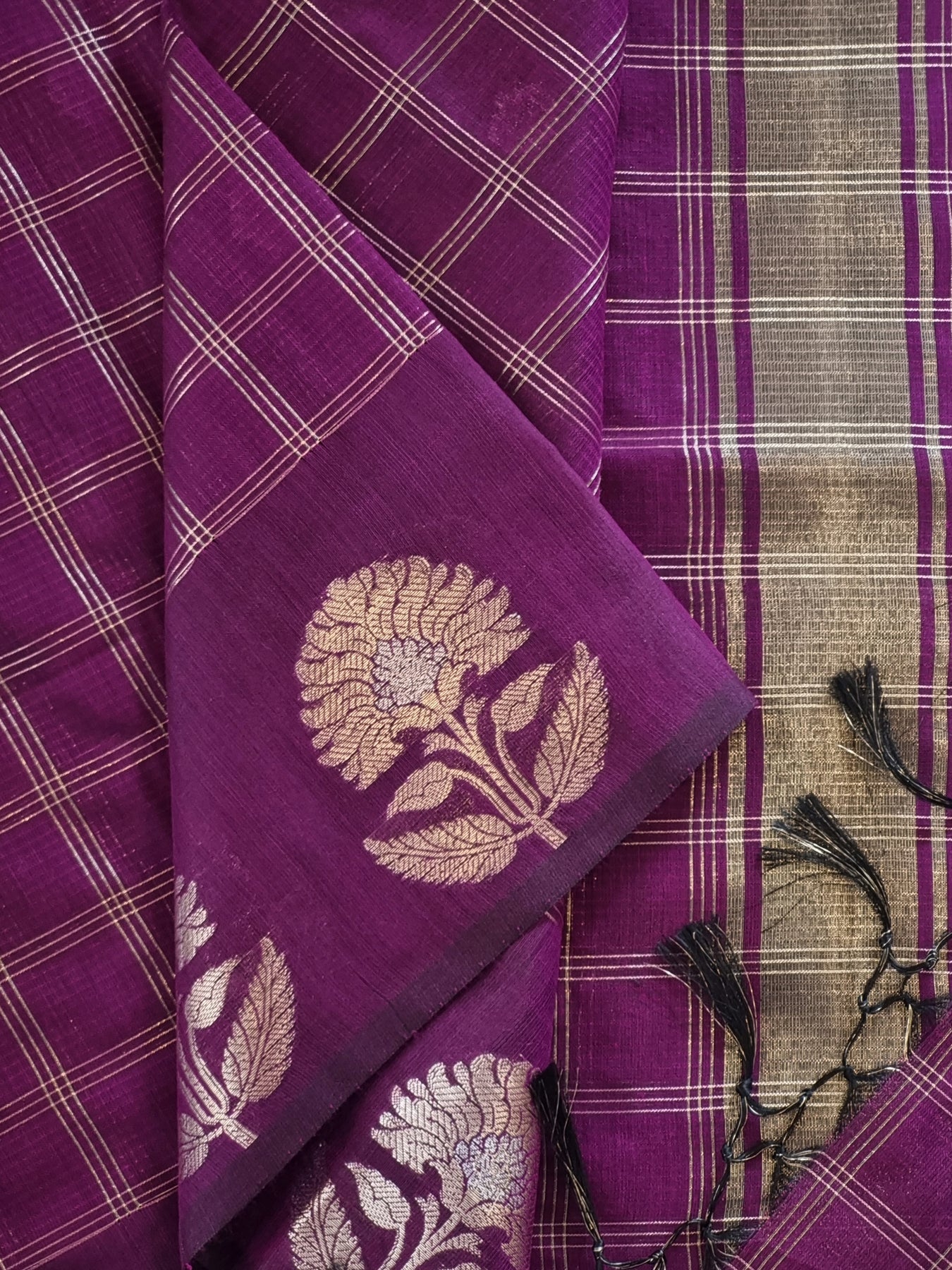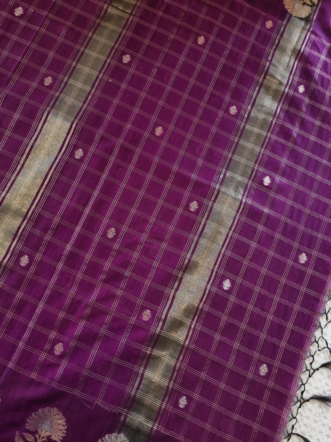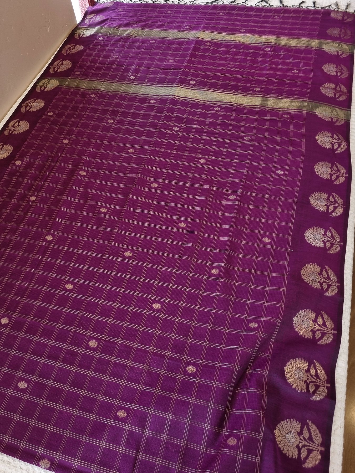 Purple Checked Silk Cotton Saree with Woven Motifs