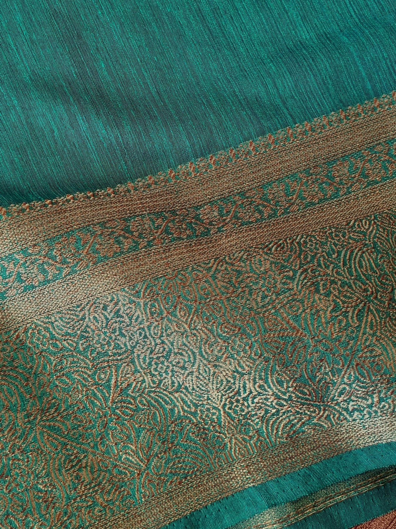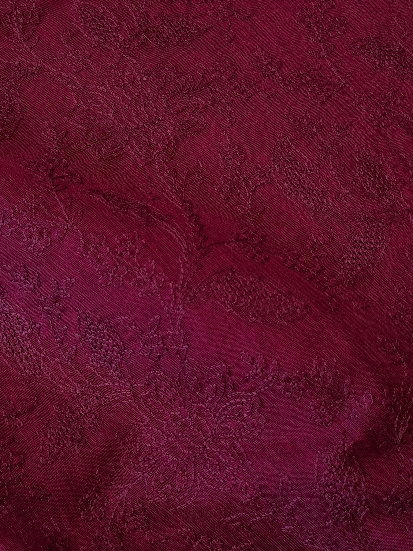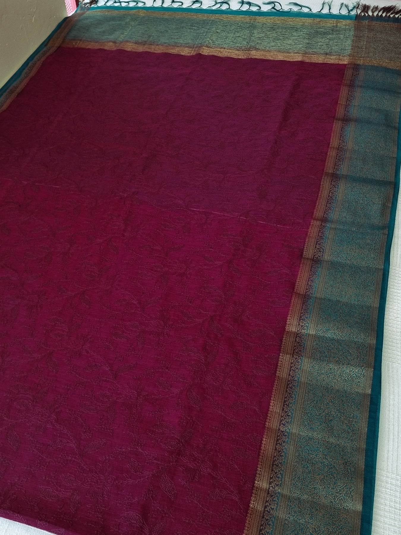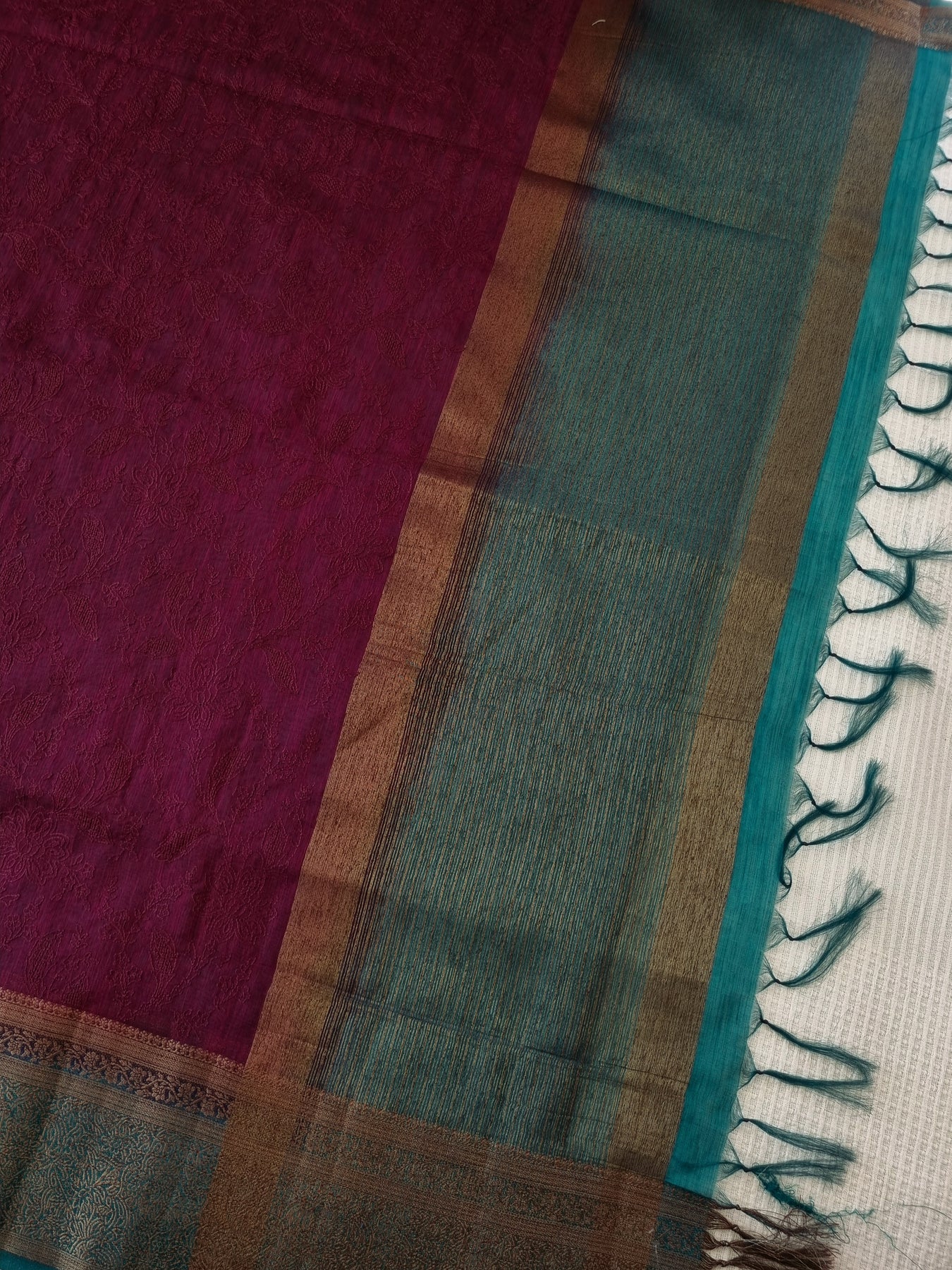 An elegant Semi Raw Silk Saree with floral embroidery designs on the body
