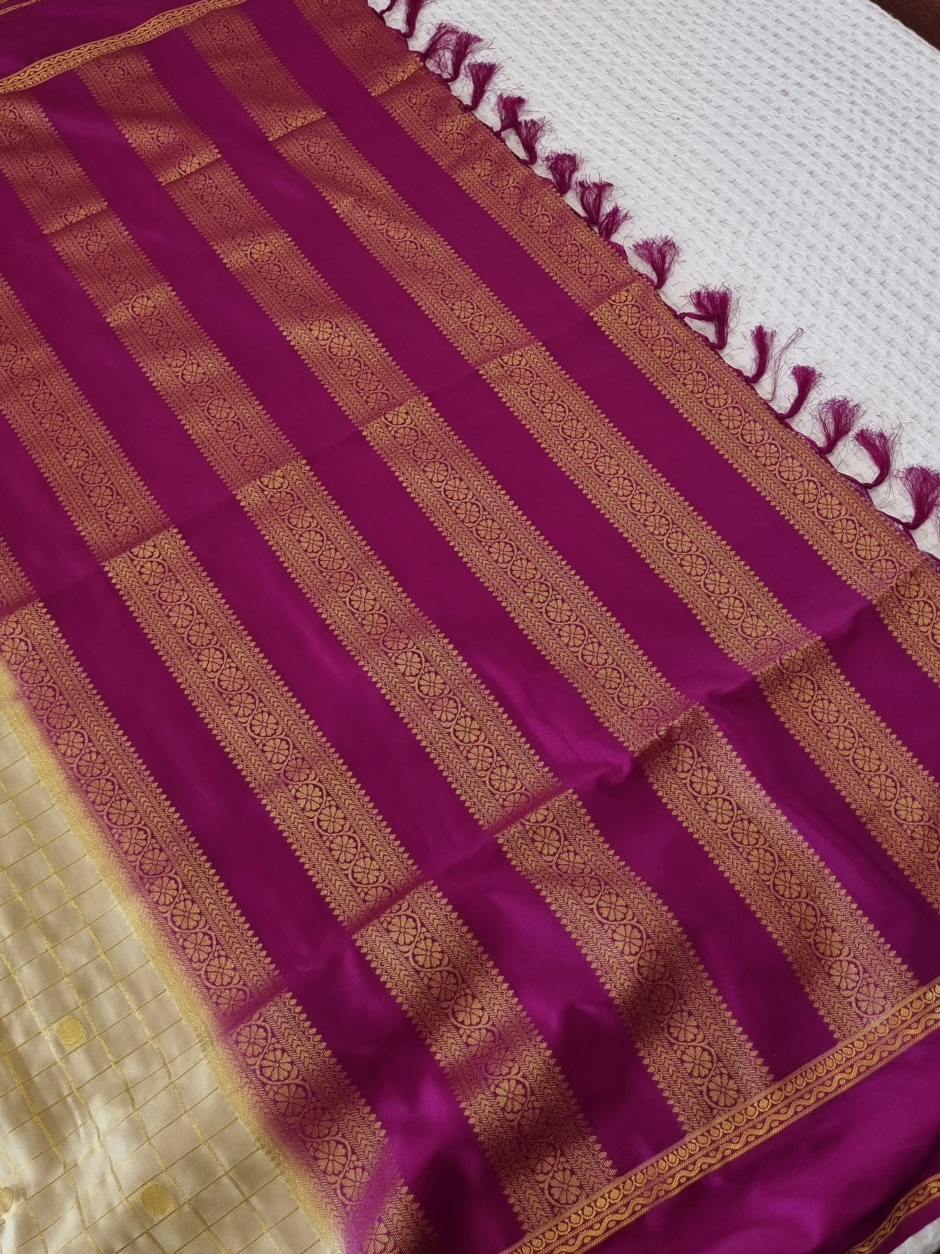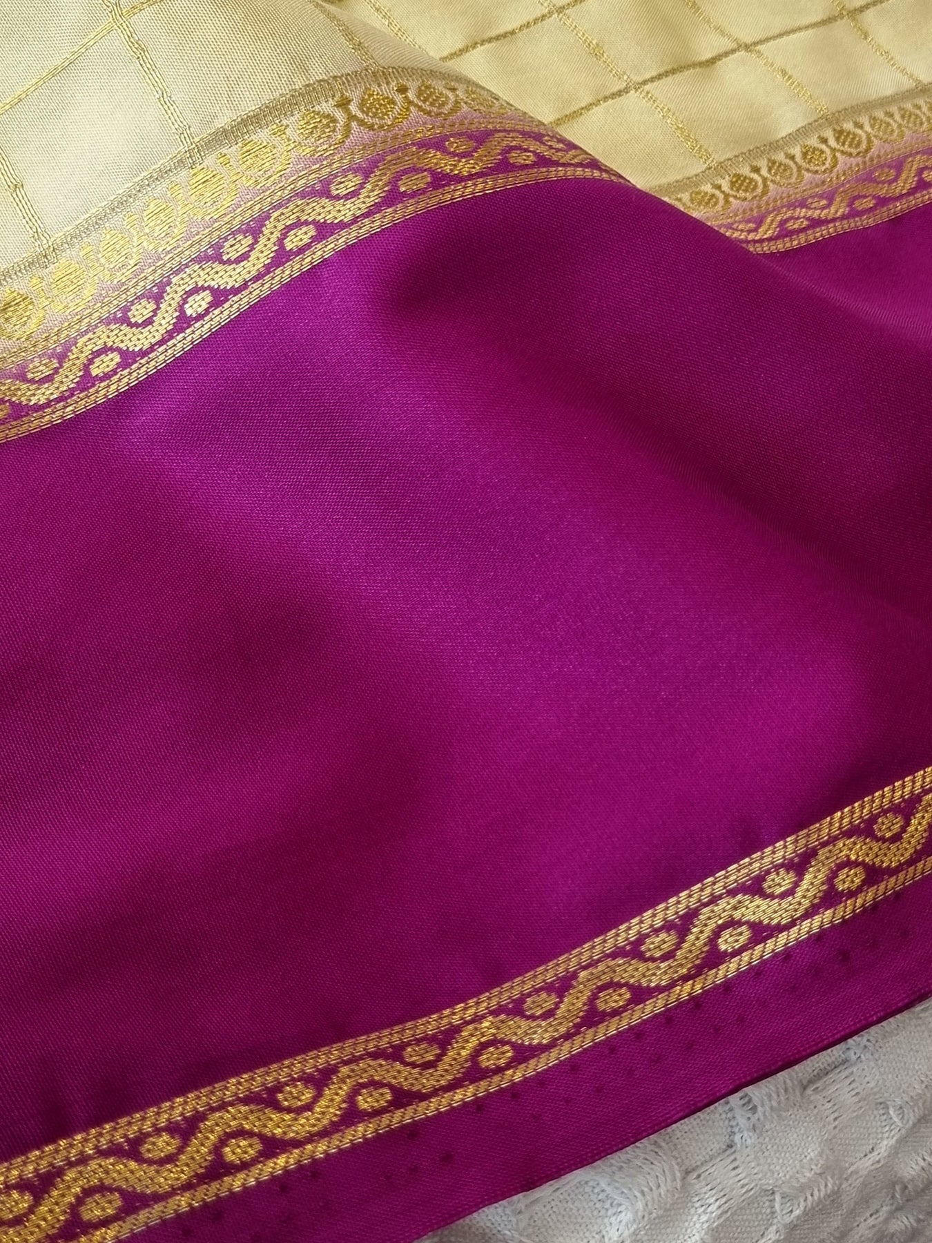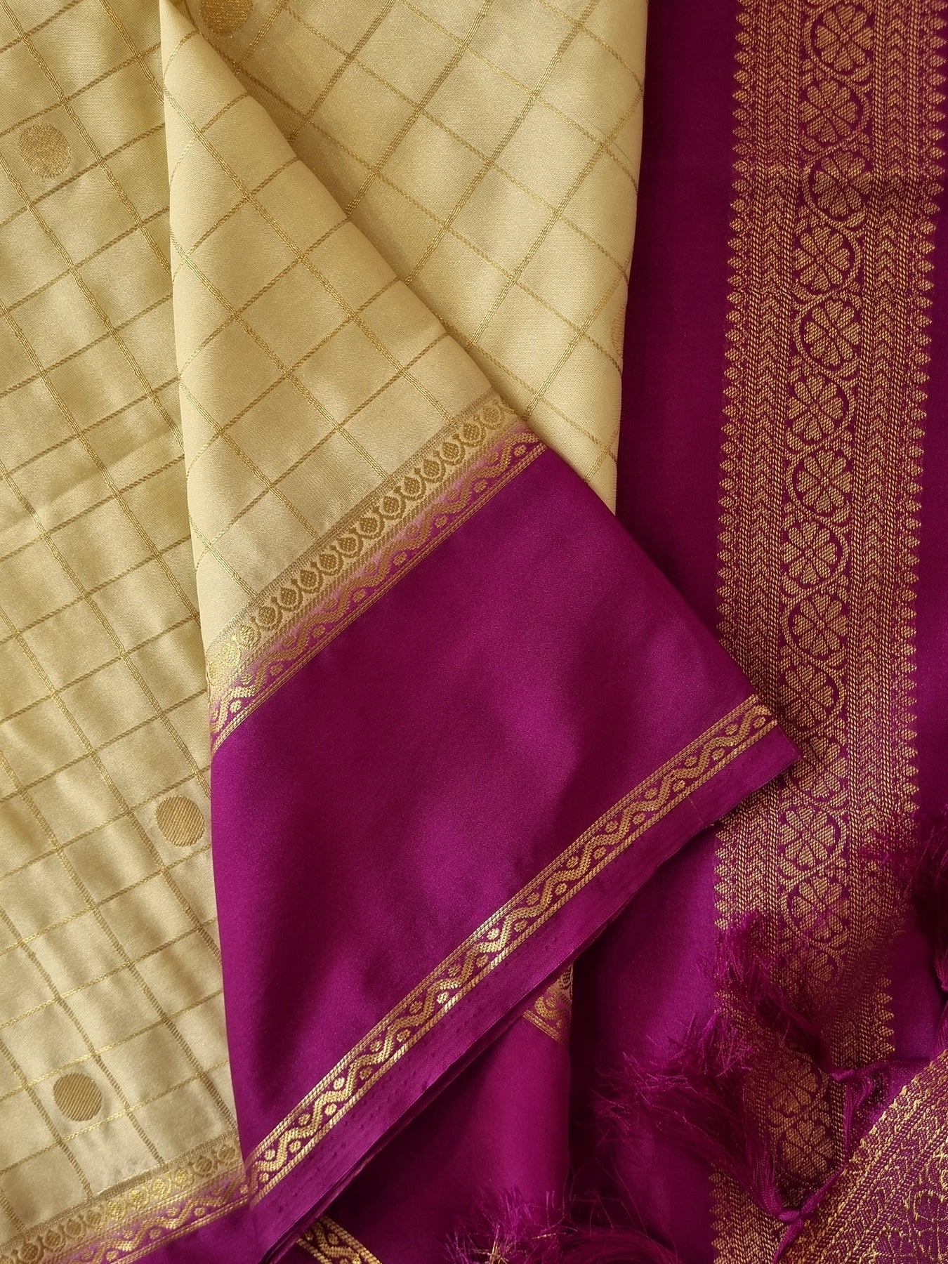 Cream Checked Semi Georgette Saree, with woven borders, paired with a Semi Silk Blouse fabric