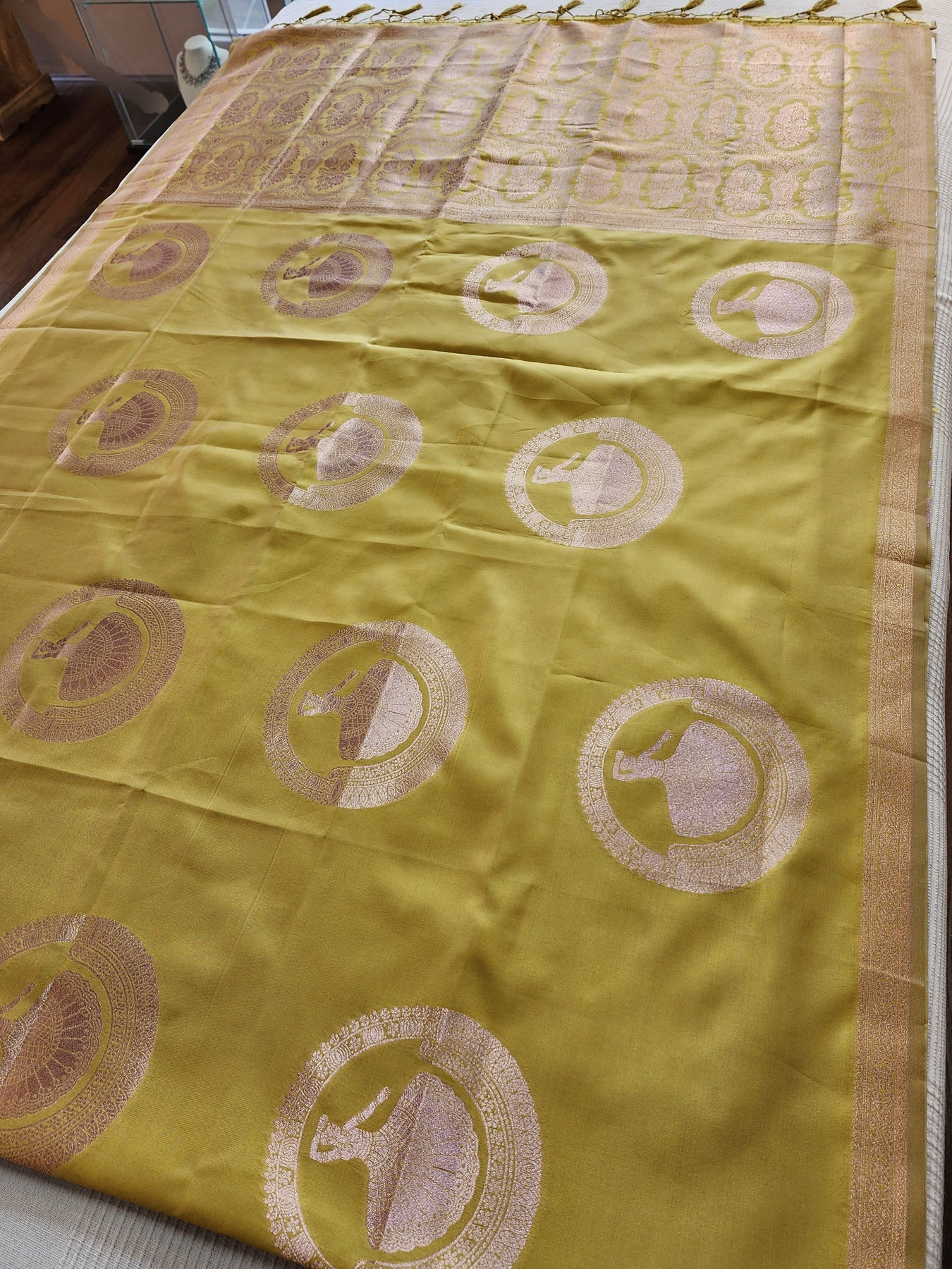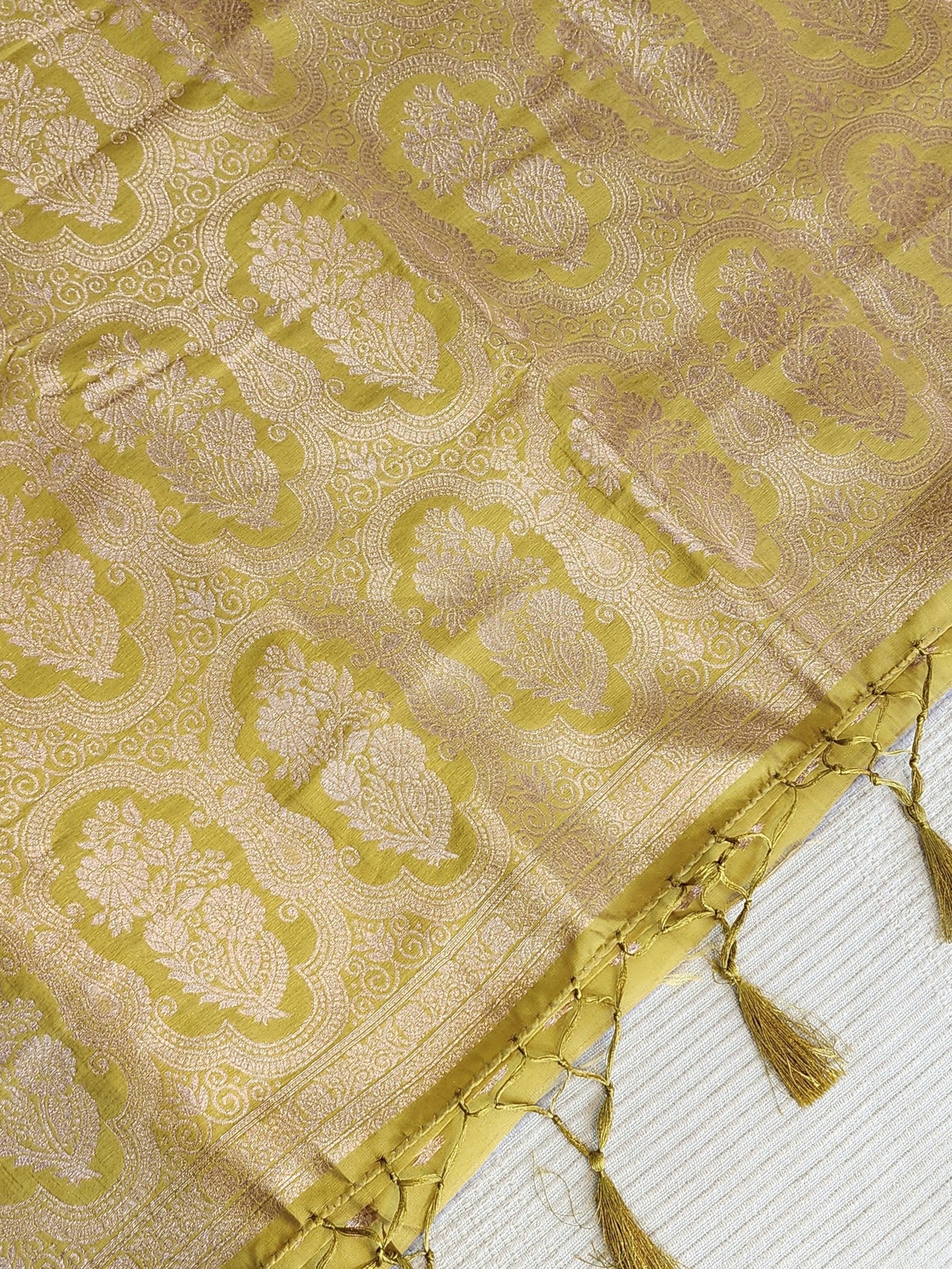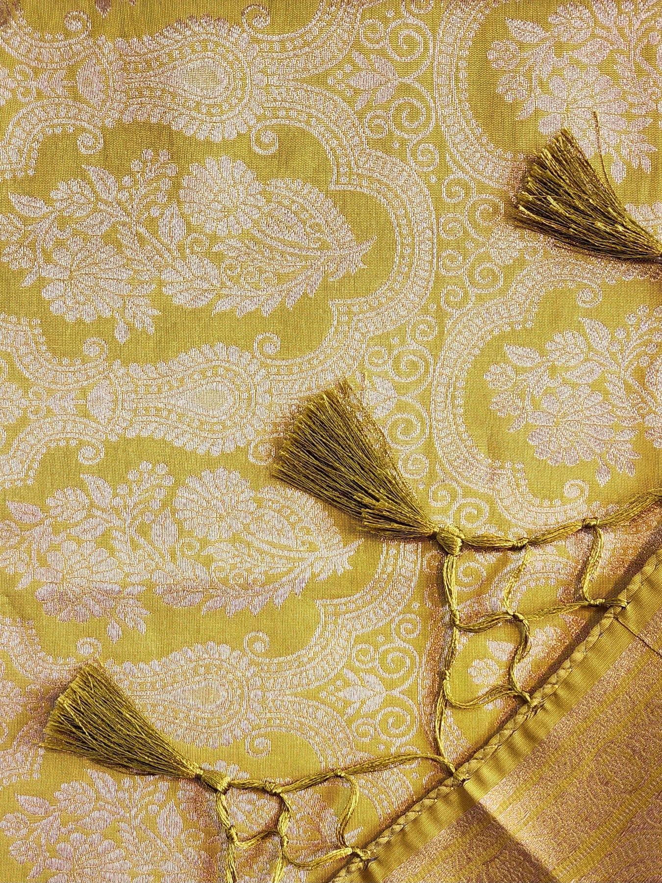 Green Semi-Silk Saree with Gold Banarasi Borders and intricately woven motifs on the body and a contrast pallu, beautifully finished with tassels