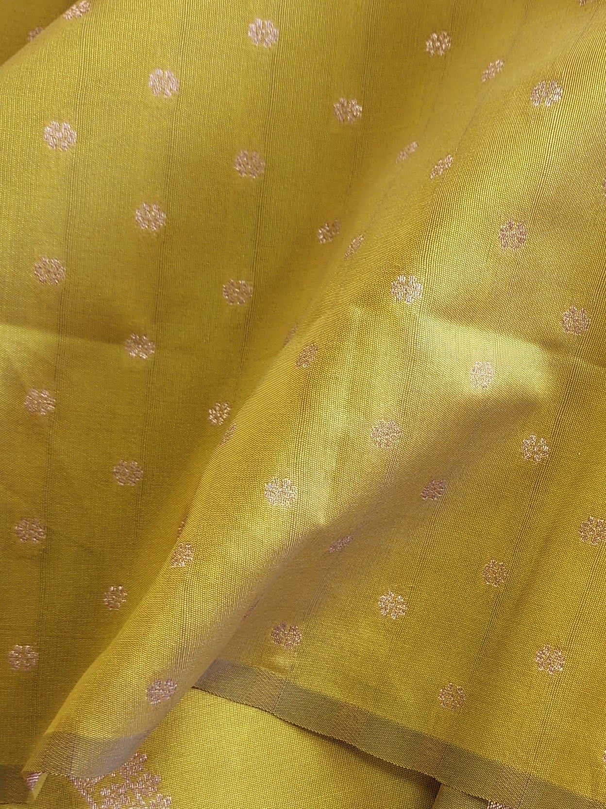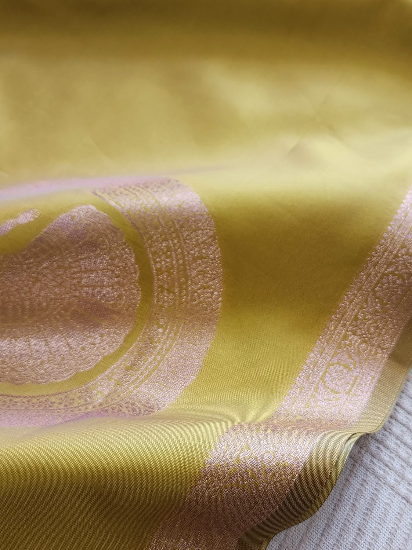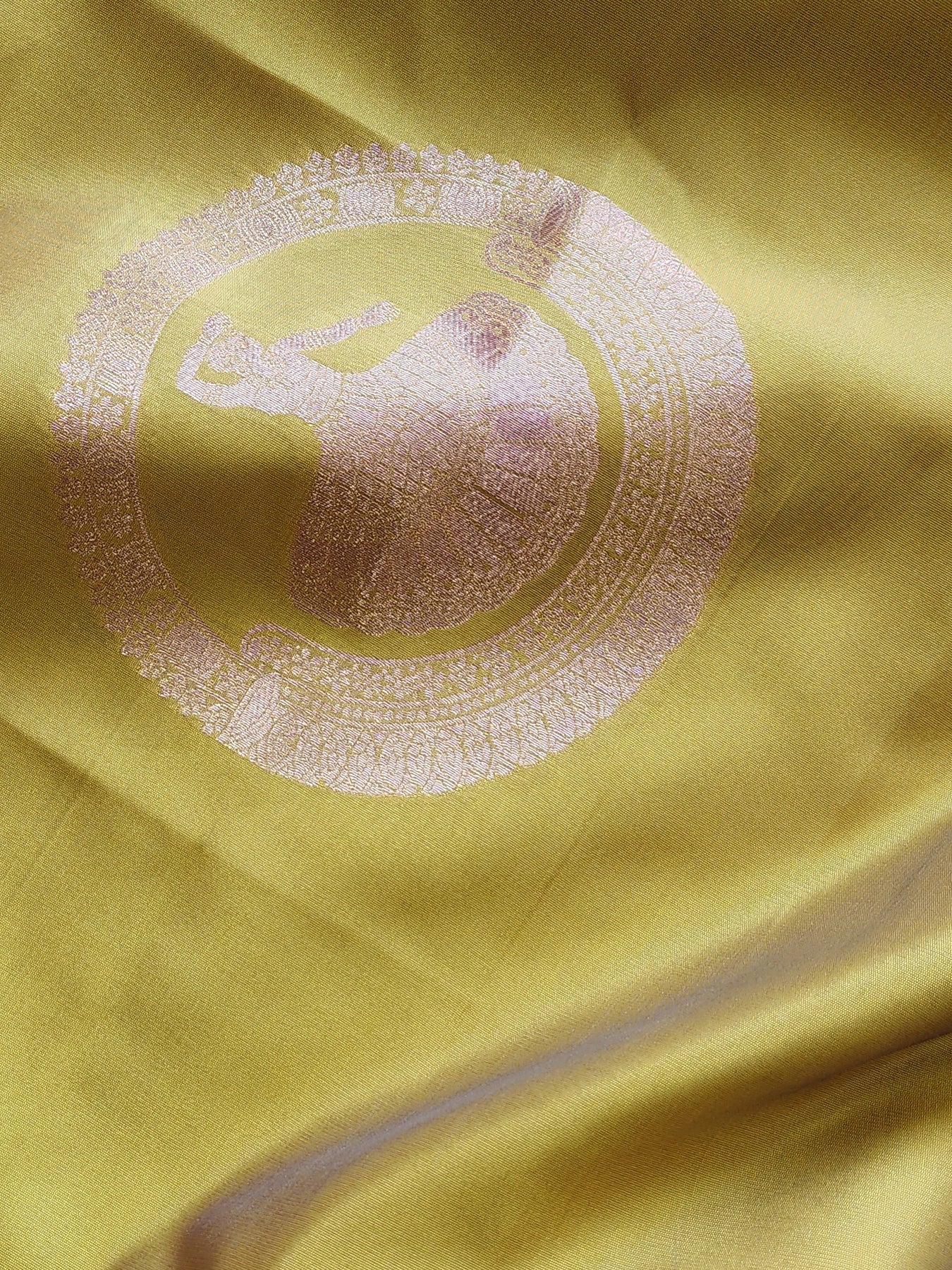 Green Semi-Silk Saree with Gold Banarasi Borders and intricately woven motifs on the body and a contrast pallu, beautifully finished with tassels