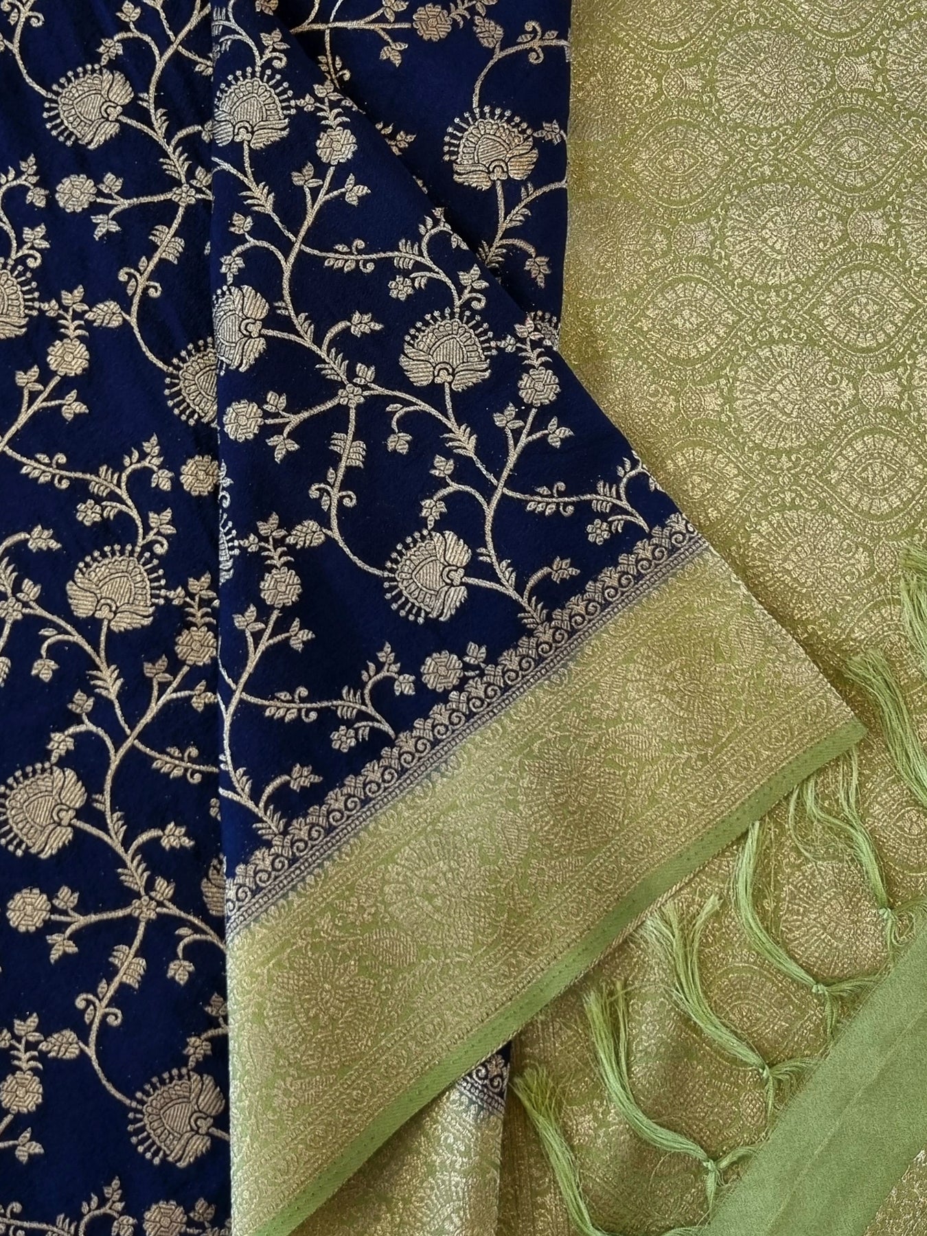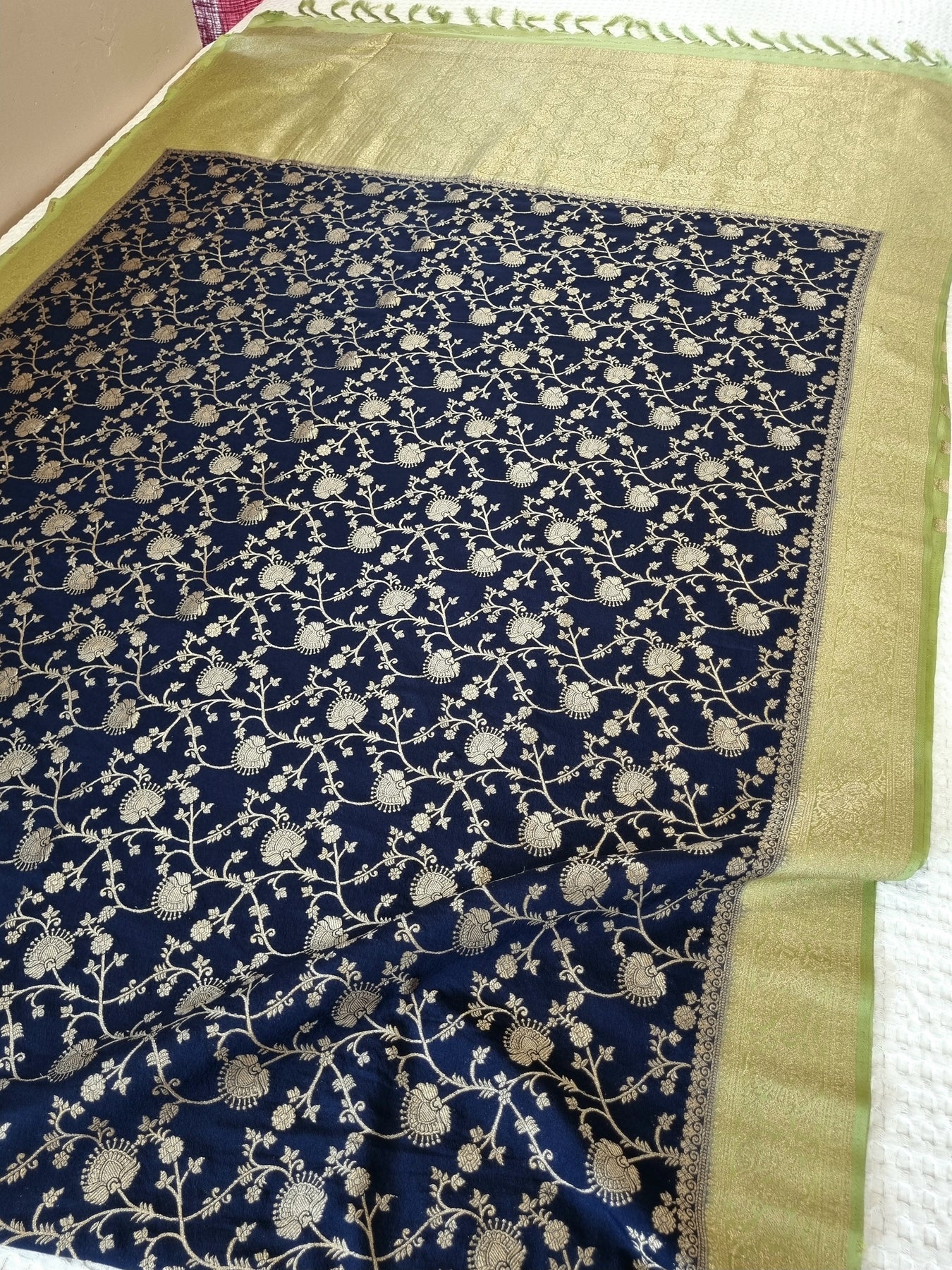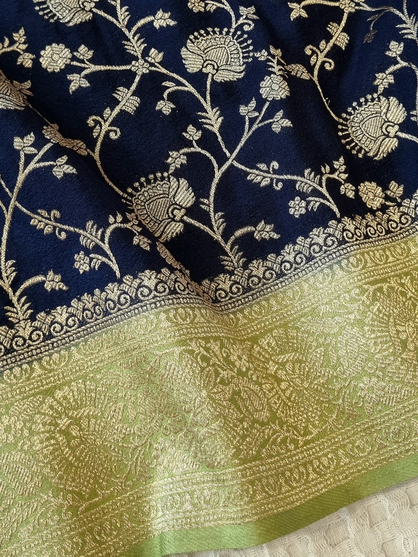 An elegant Blue Semi Crepe Silk Saree with Gold borders