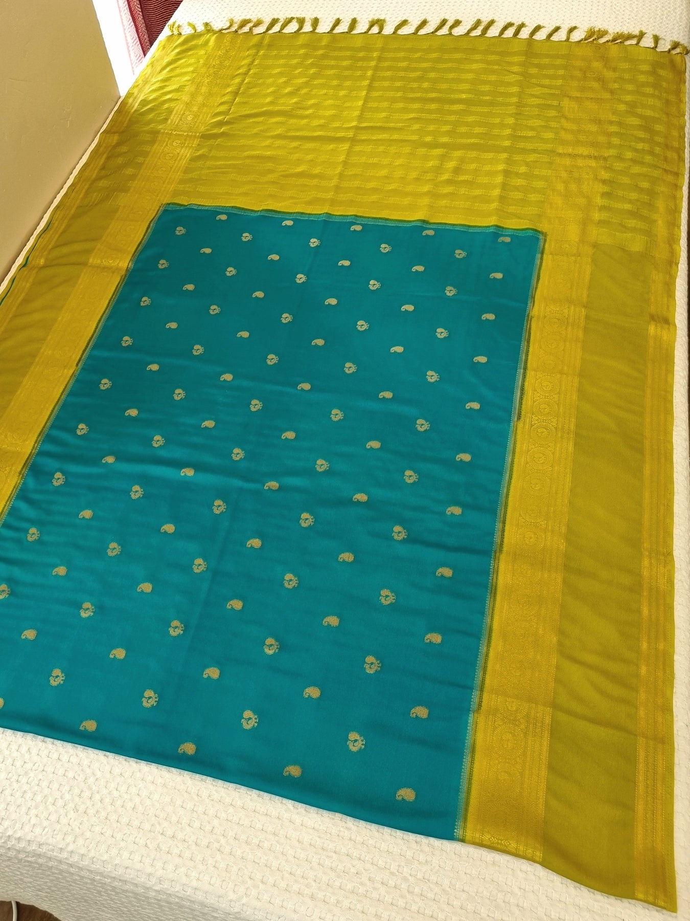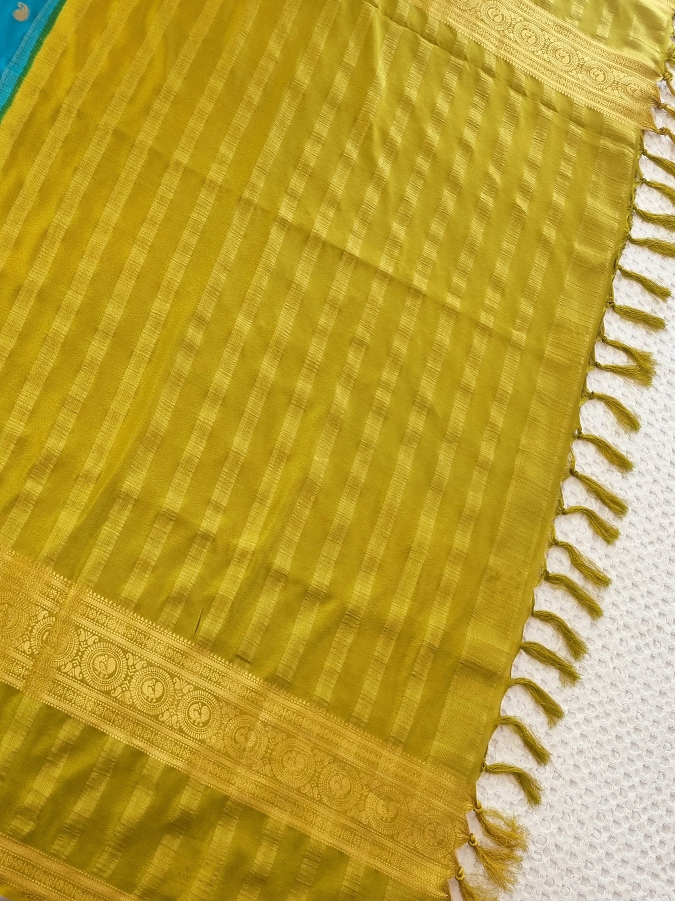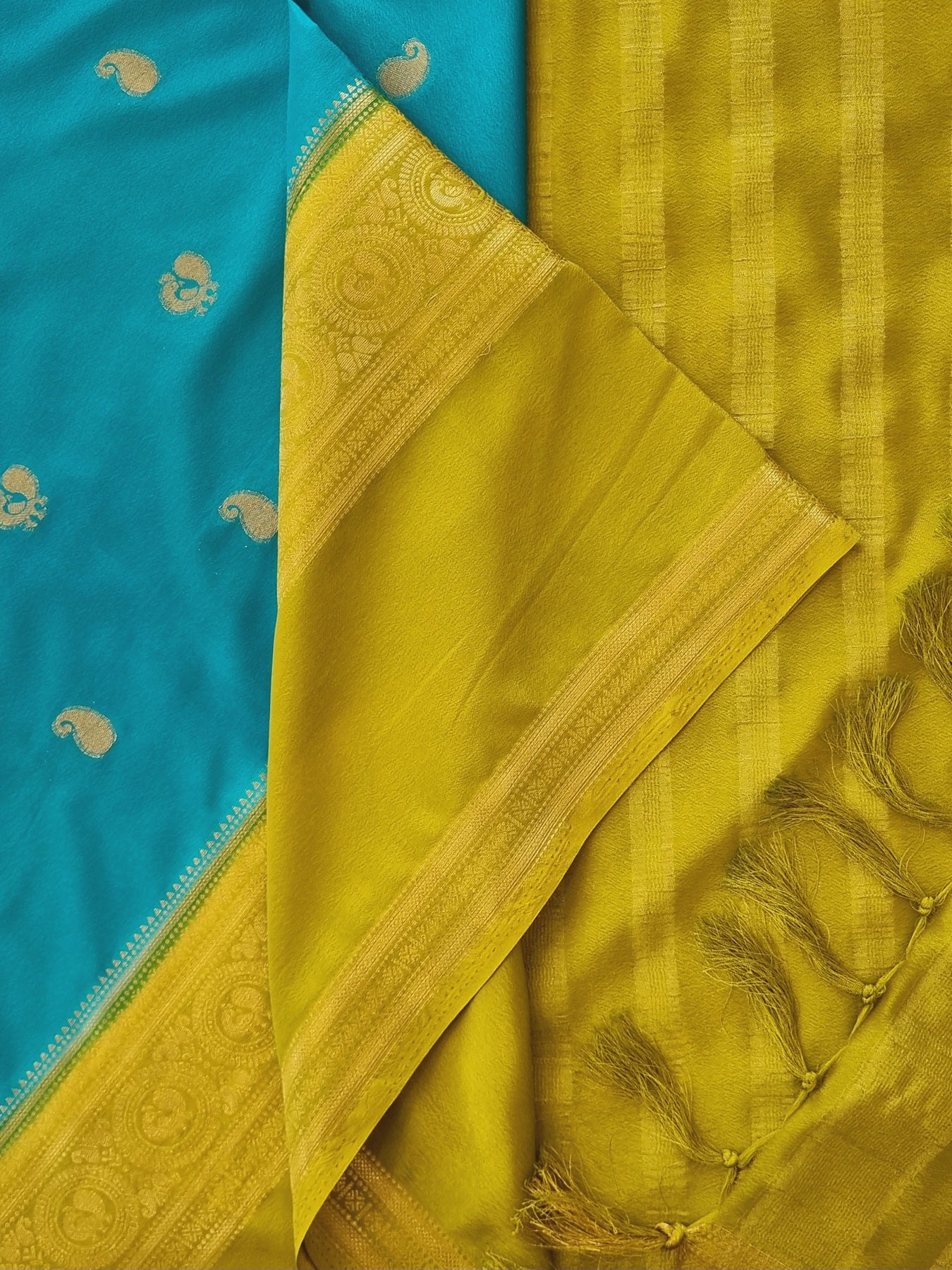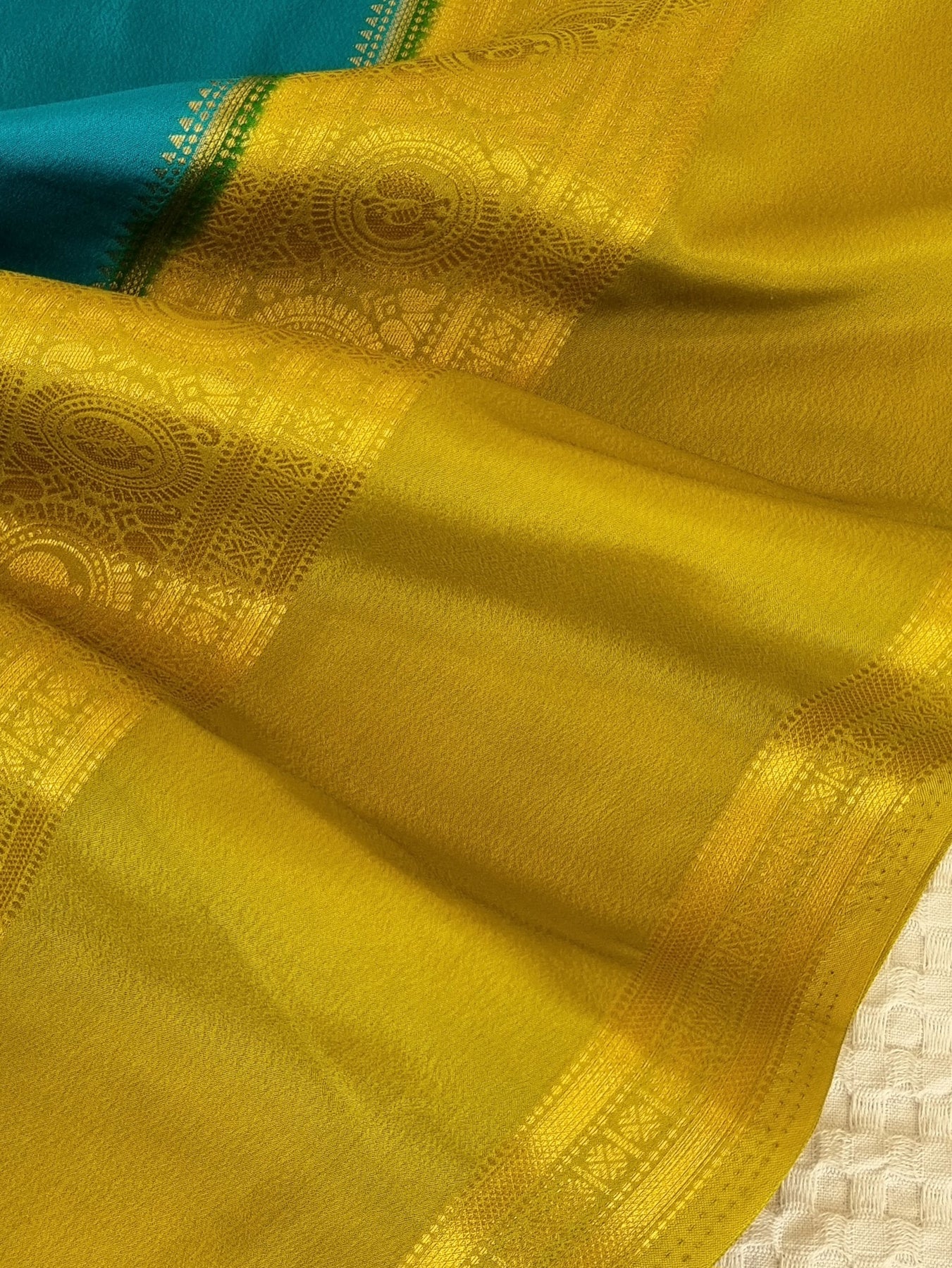 An elegant Teal Blue Semi Georgette Silk Saree with Yellow Contrast borders