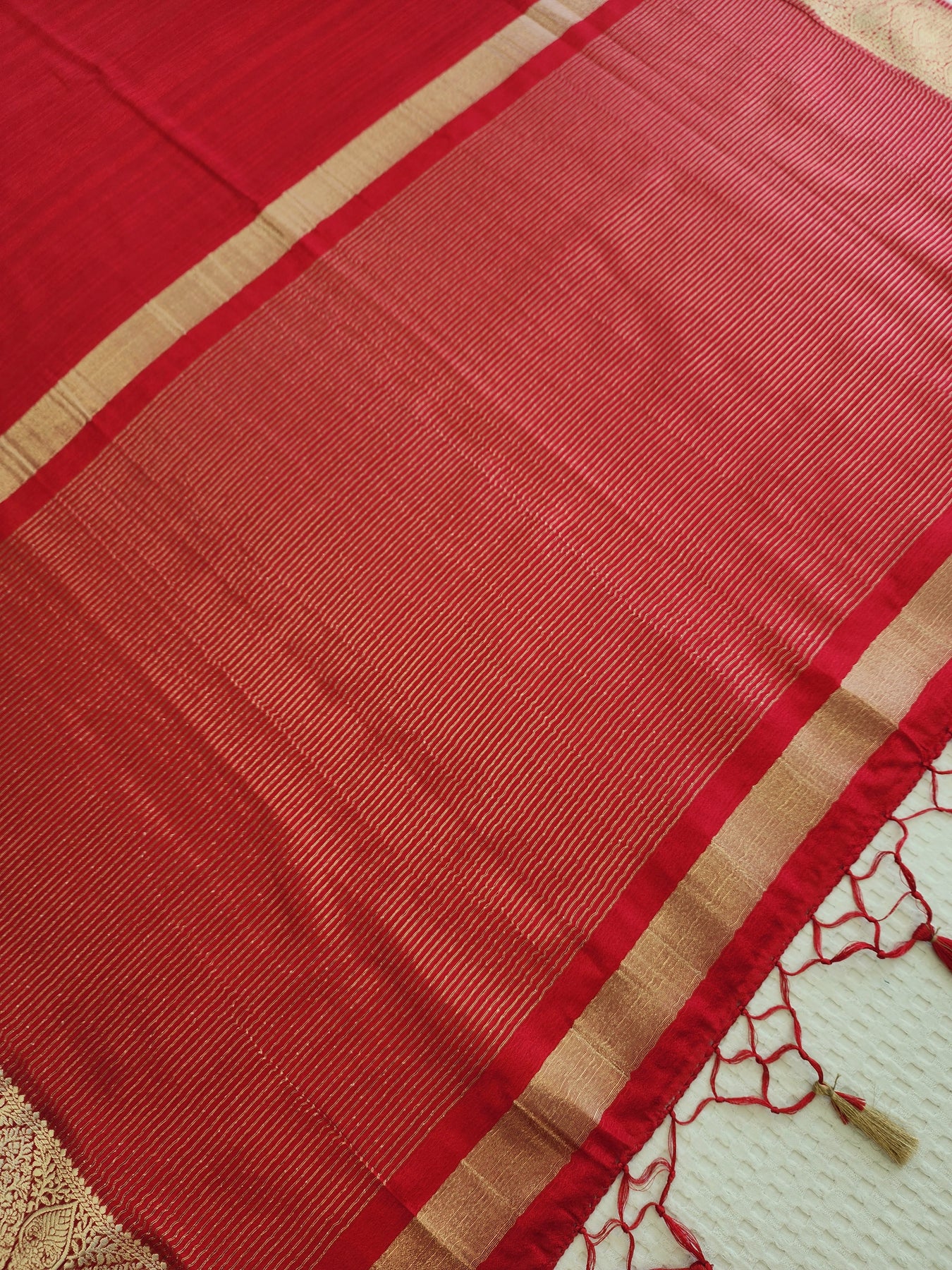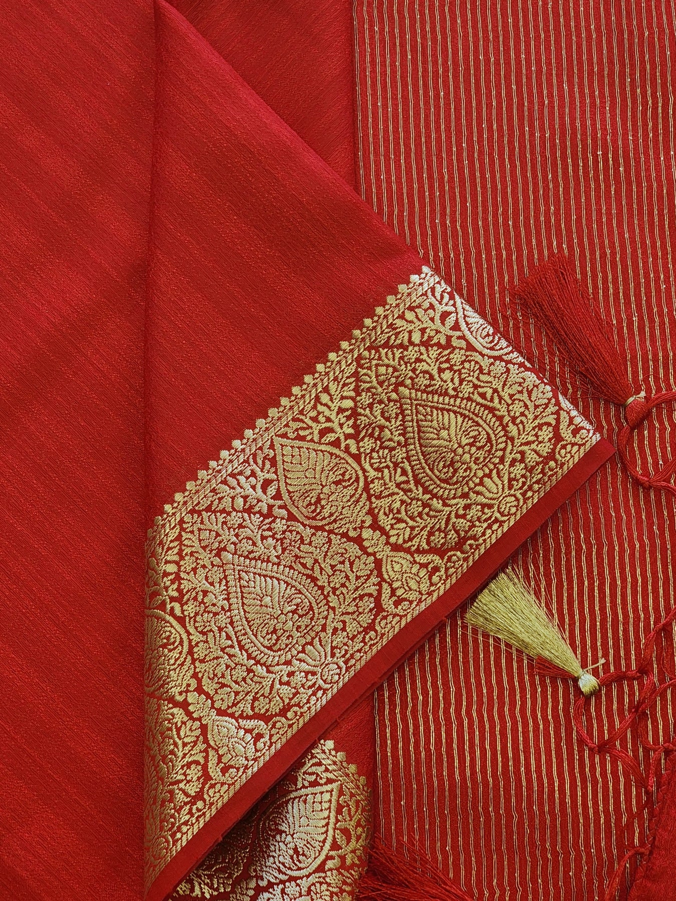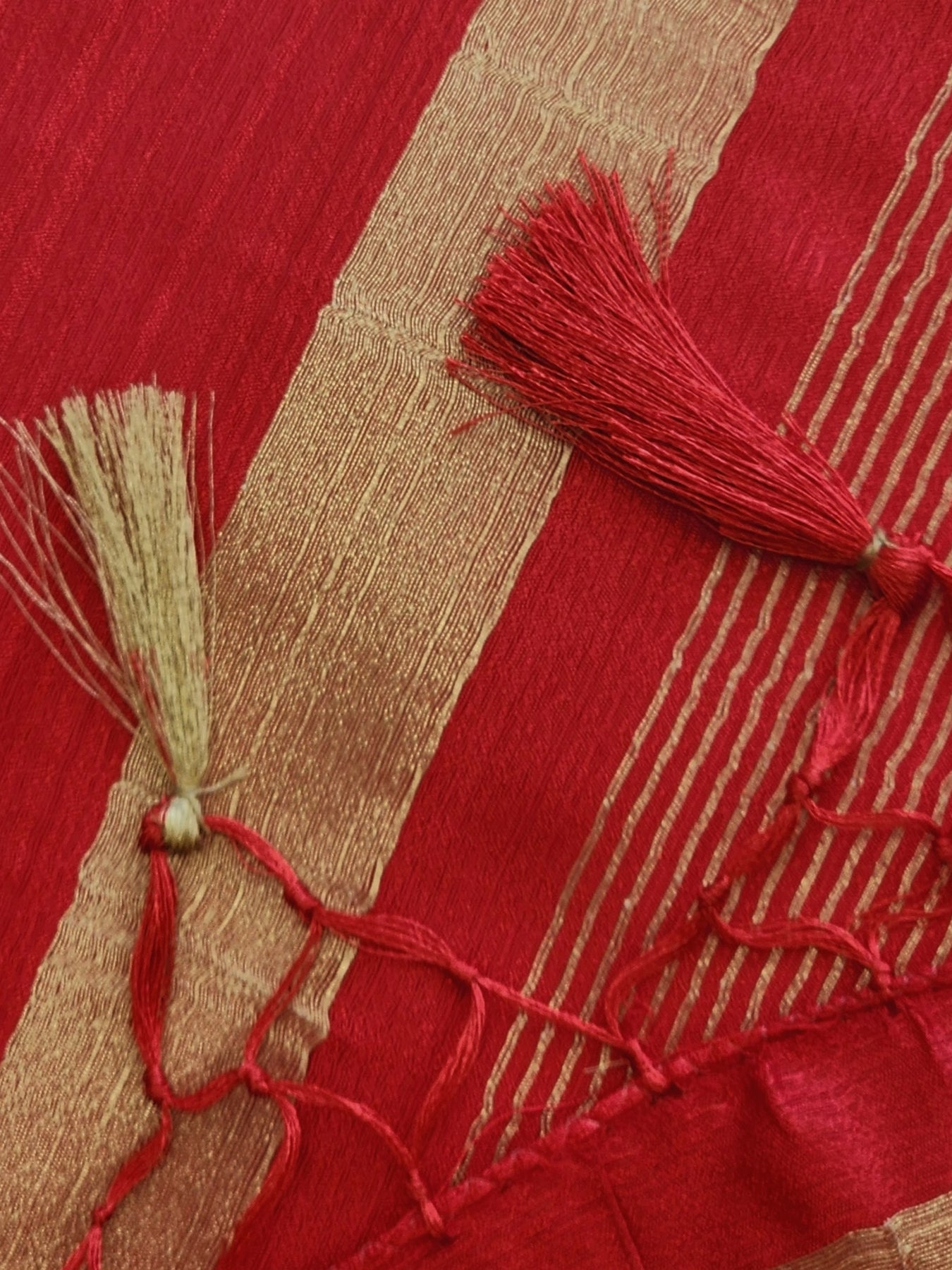 Red Semi Silk Saree with woven borders and pallu, beautifully finished with tassels