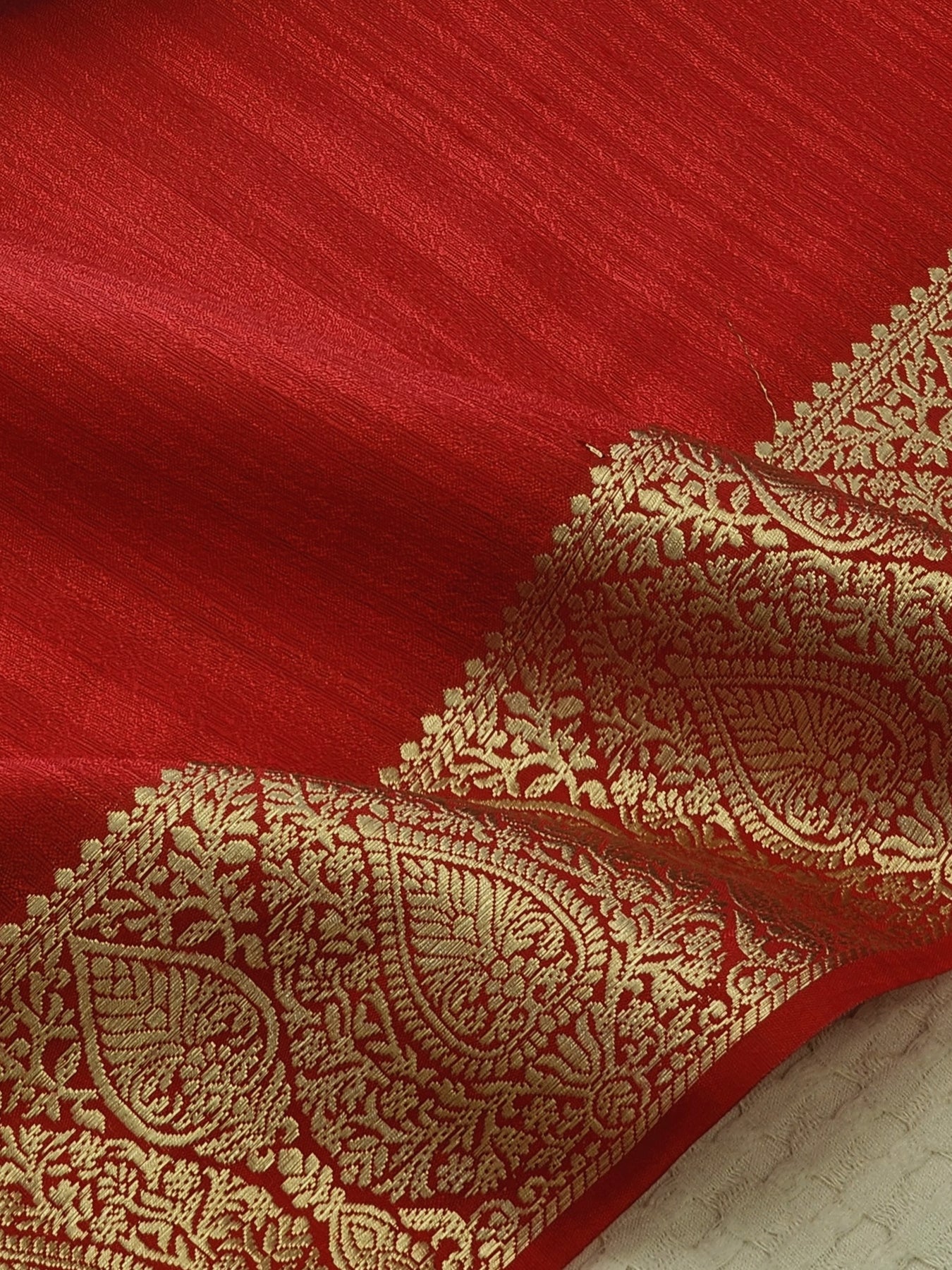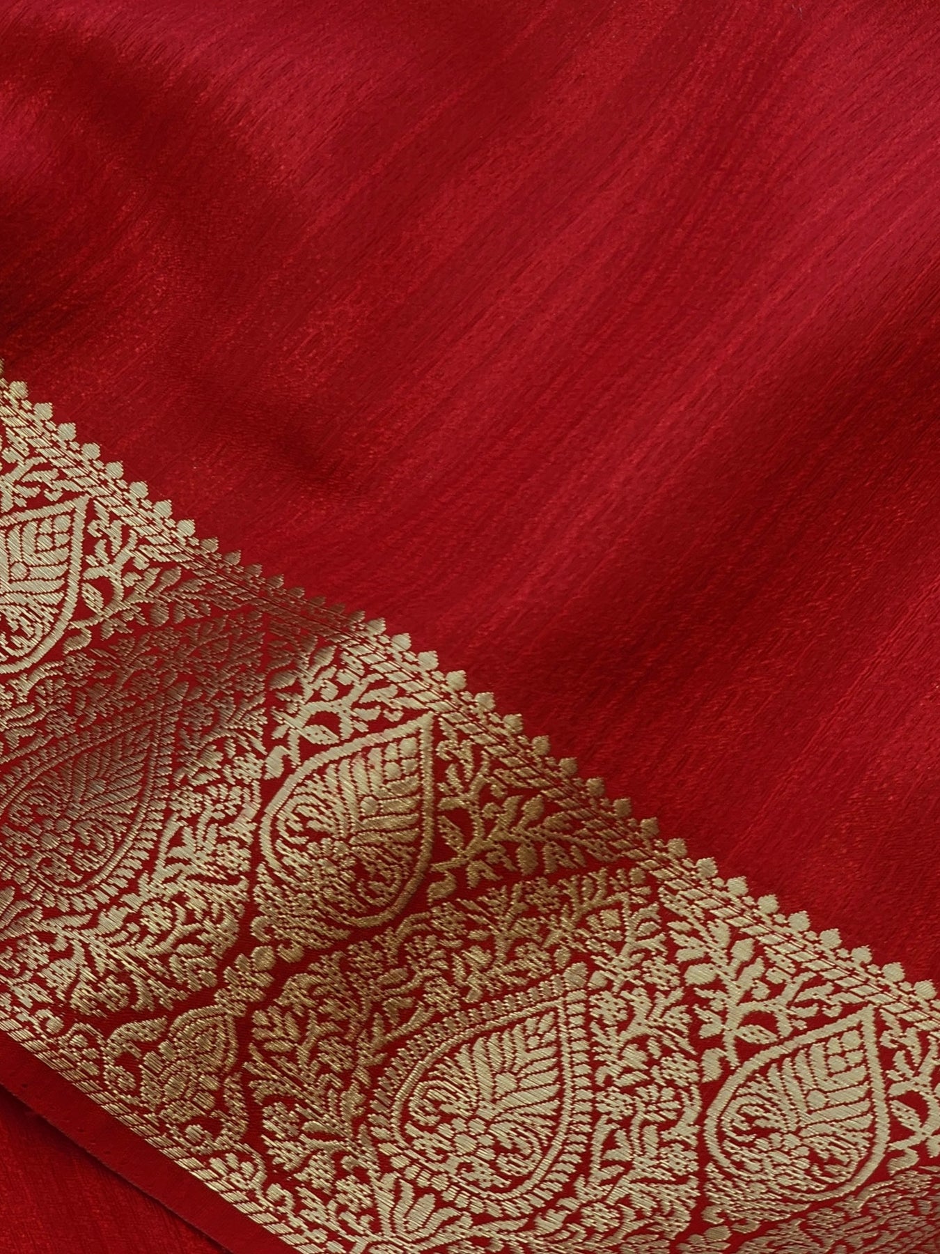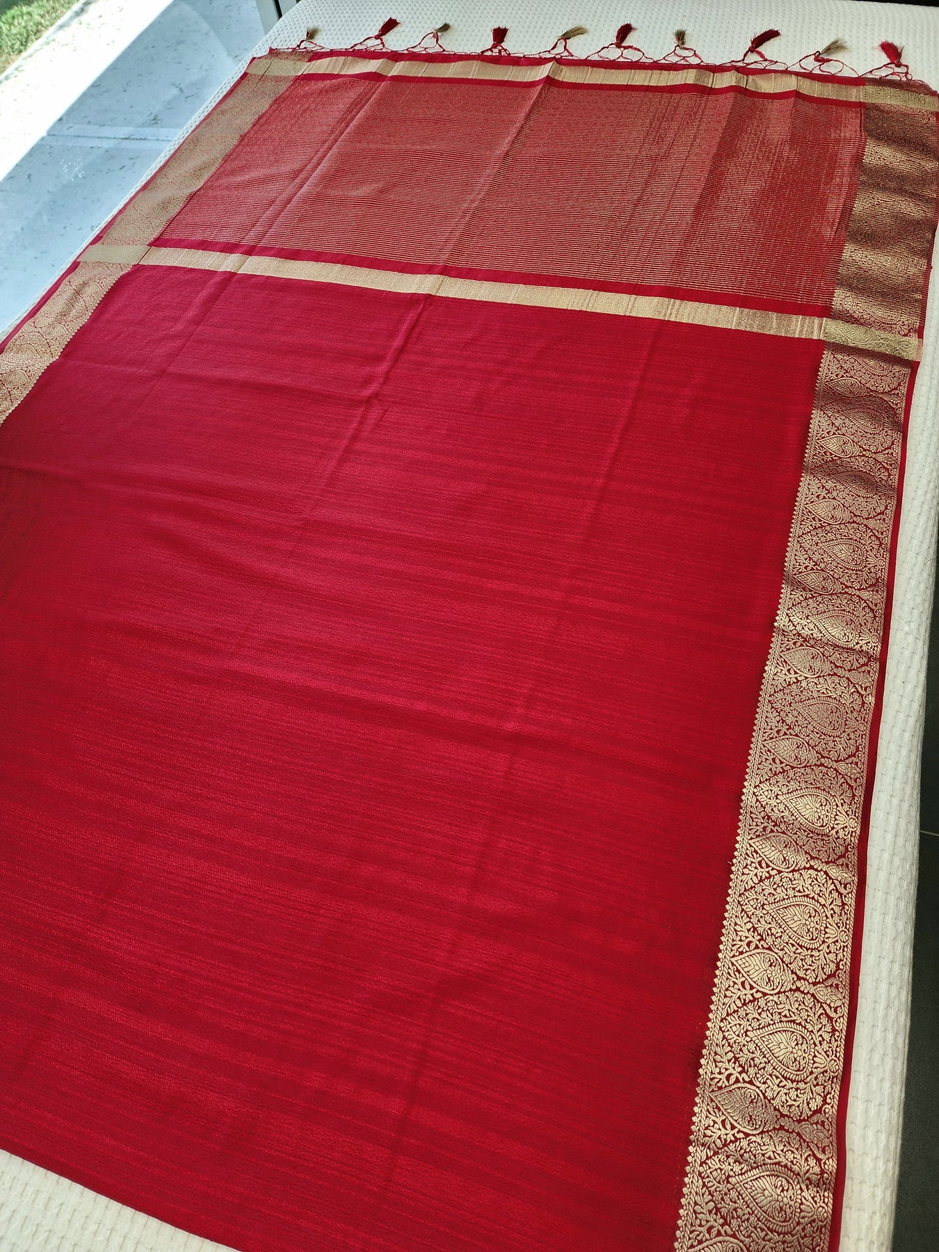 Red Semi Silk Saree with woven borders and pallu, beautifully finished with tassels