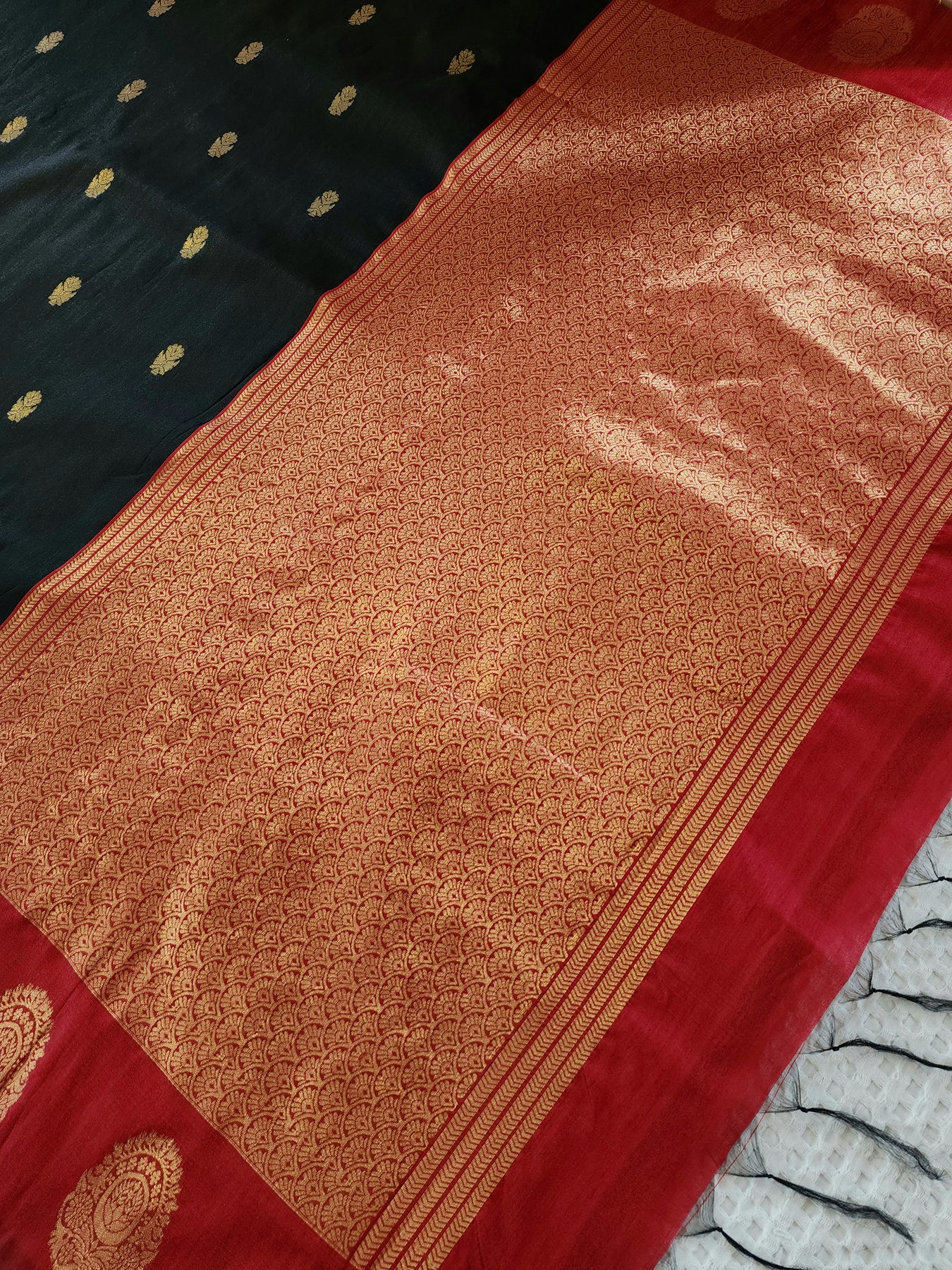 Black Semi Raw Silk Saree with contrast borders and pallu, beautifully finished with tassels
