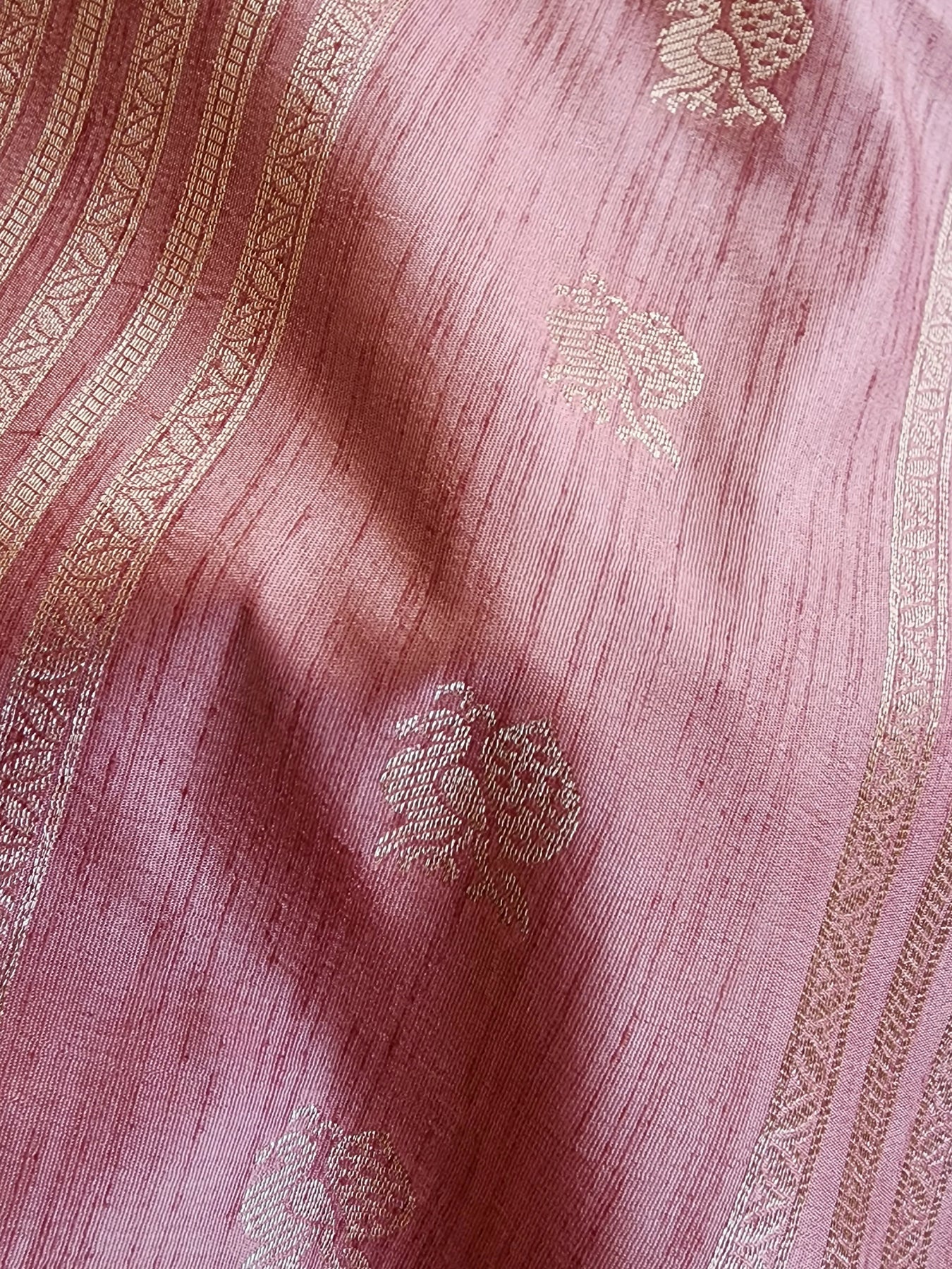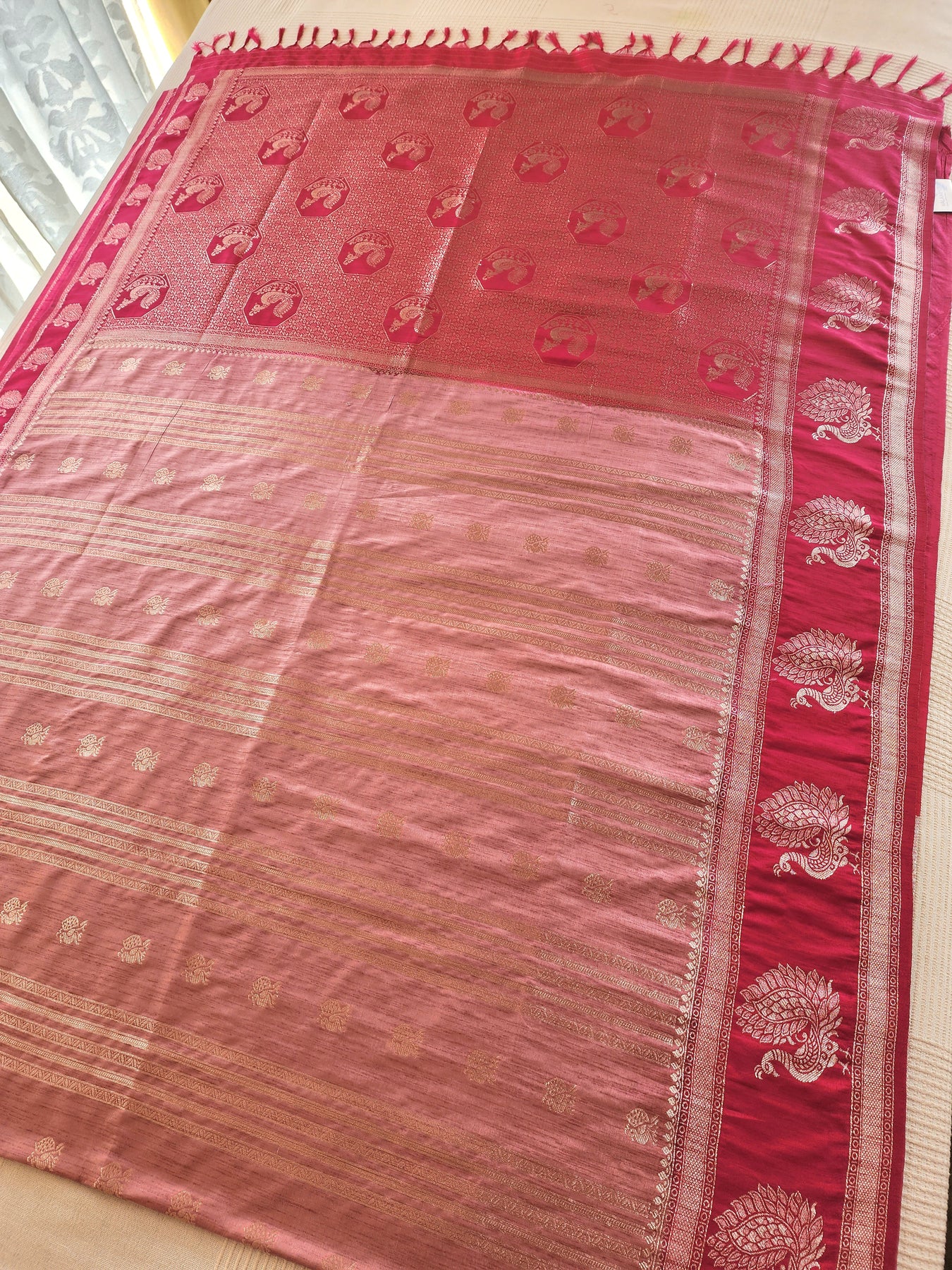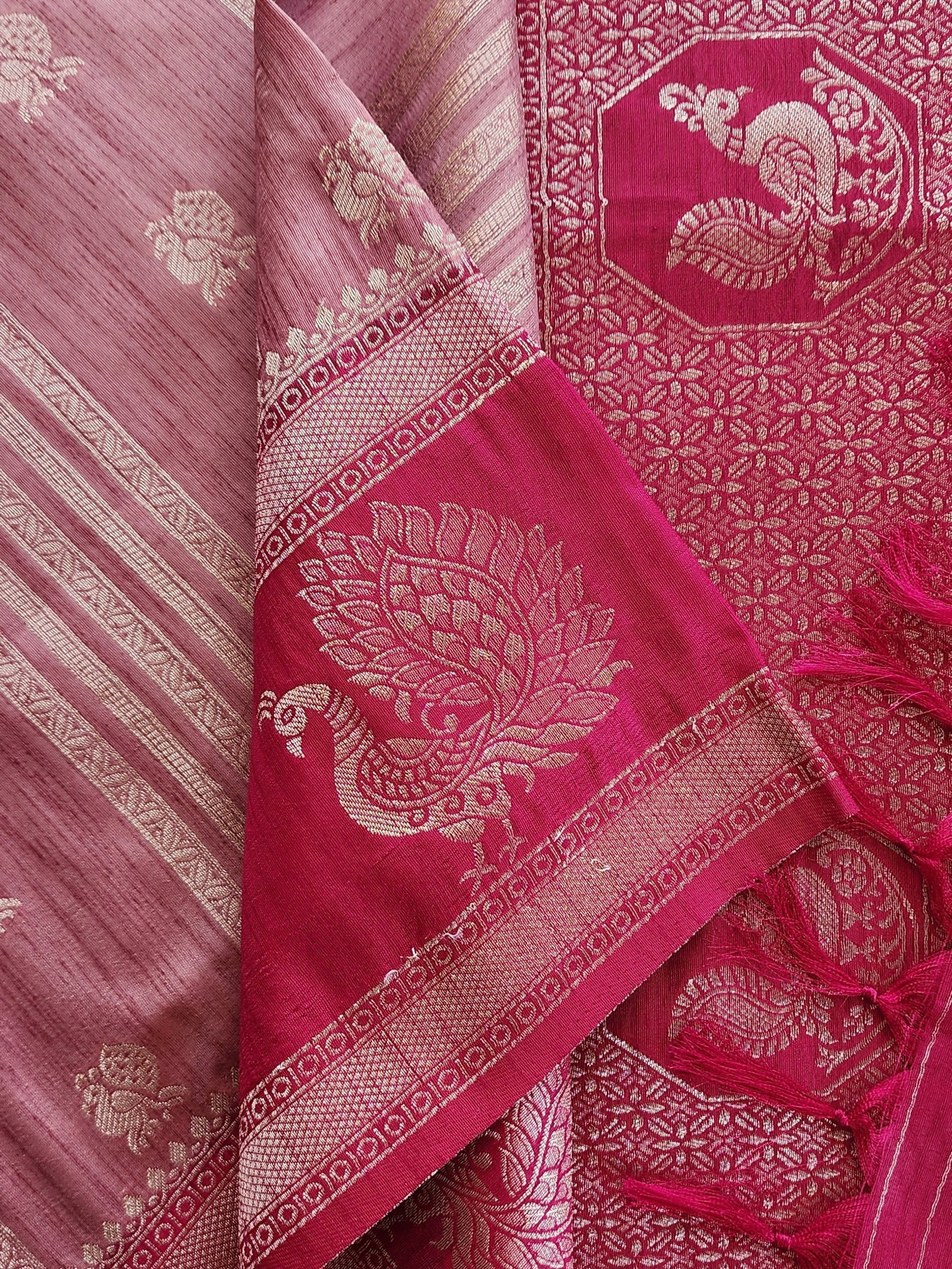 • Pink Semi Silk Saree with contrast borders and pallu, beautifully finished with tassels