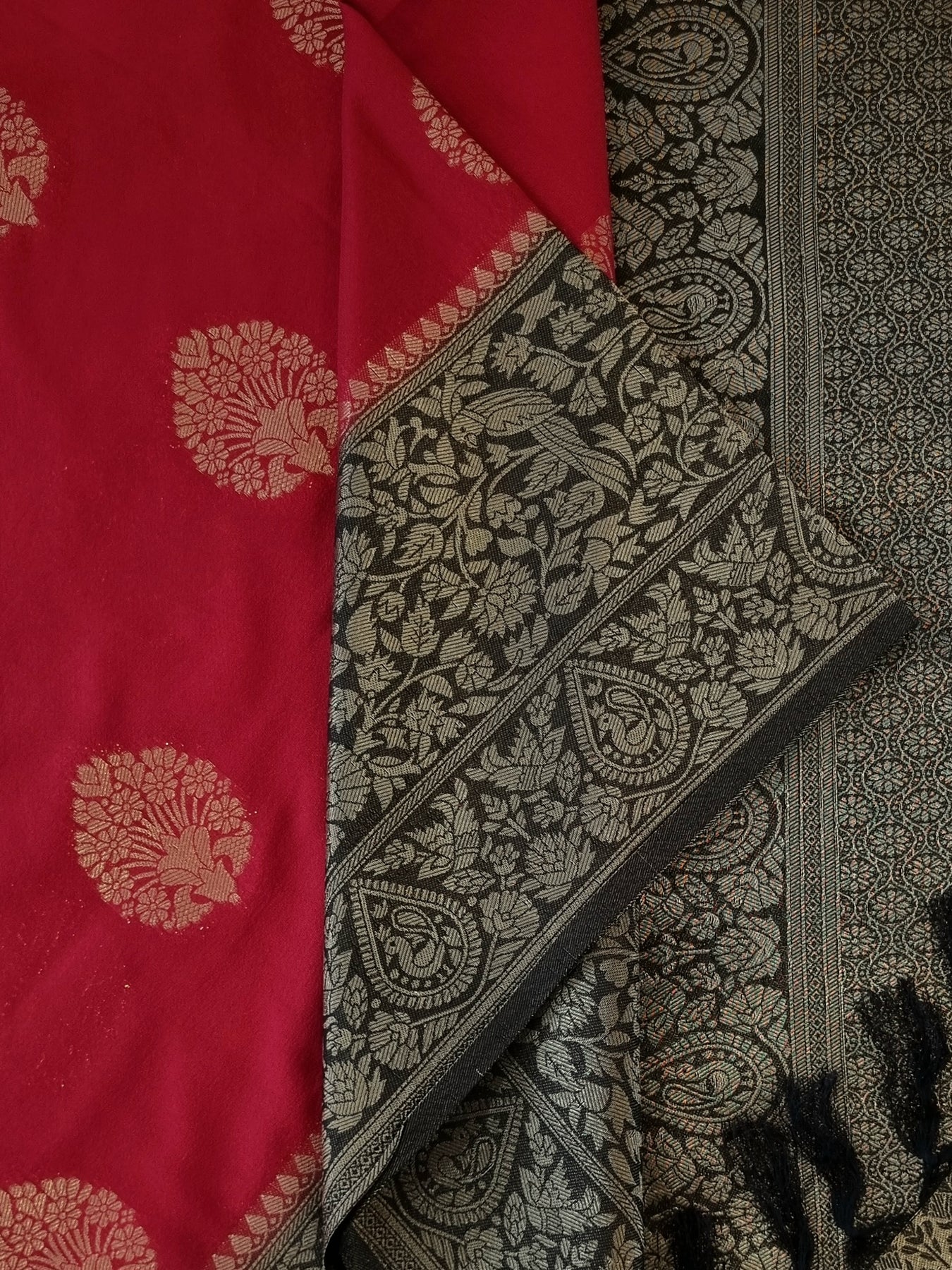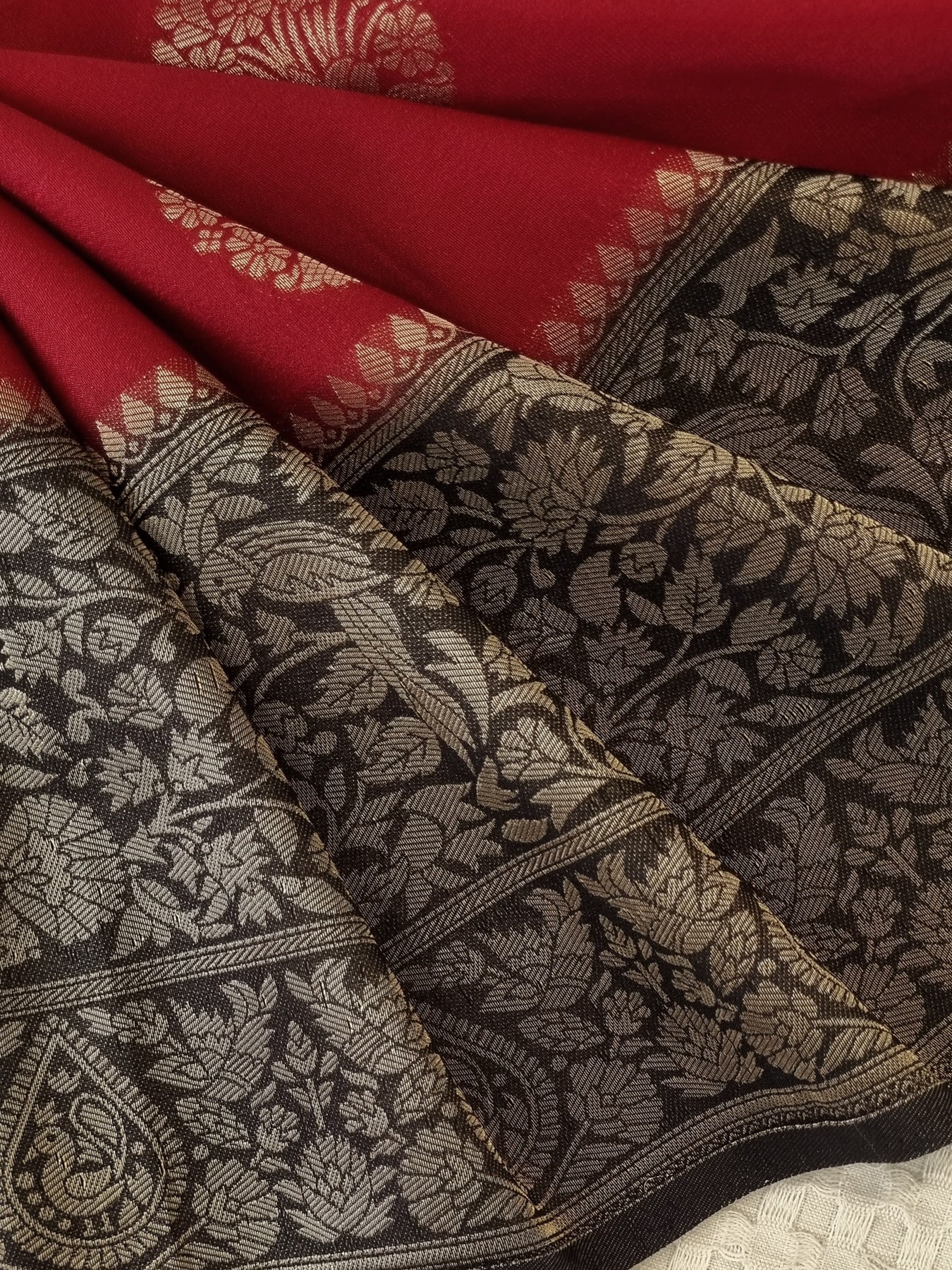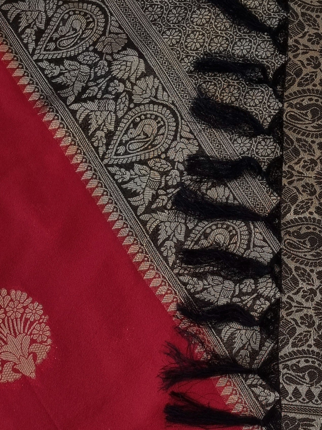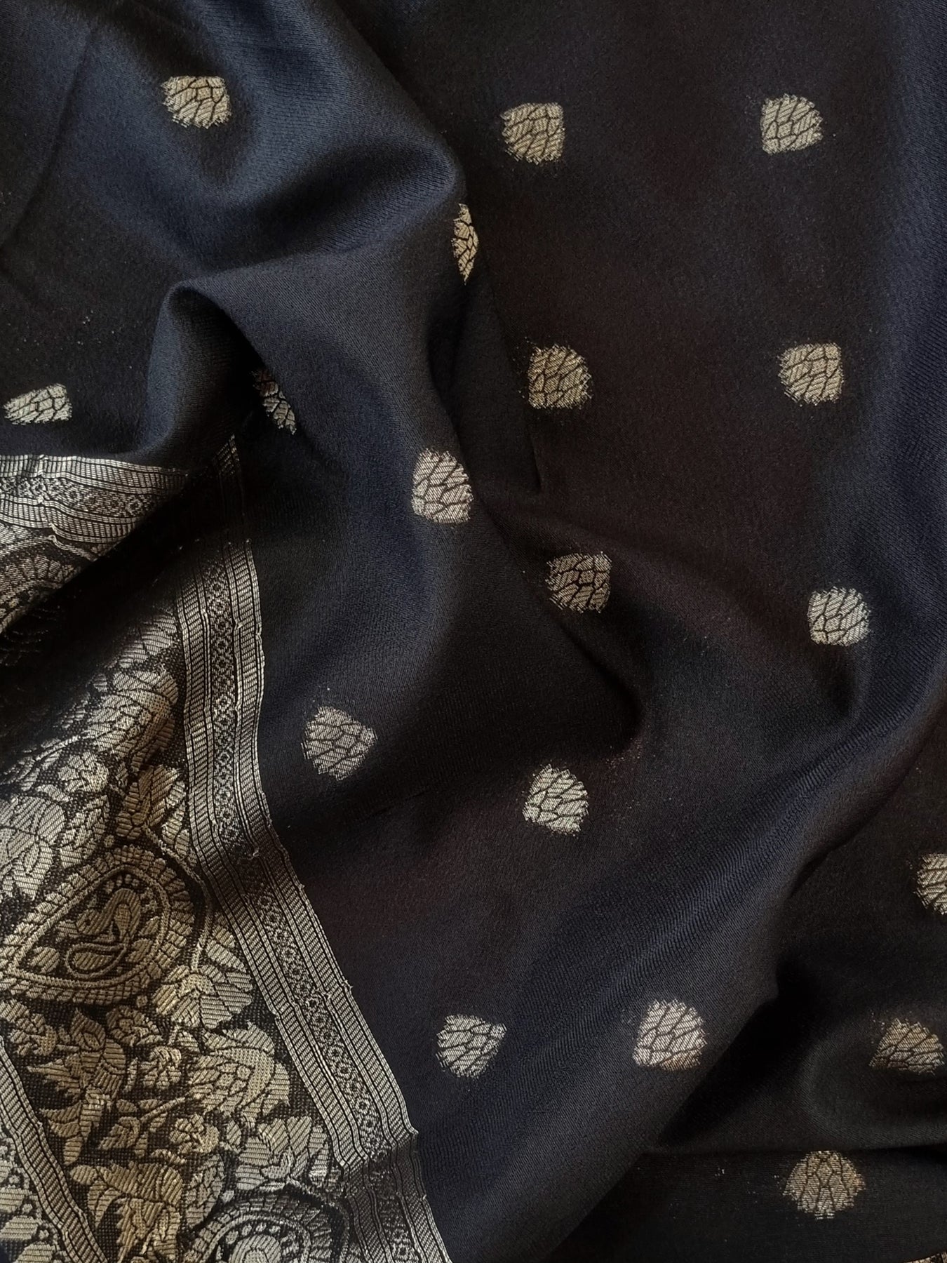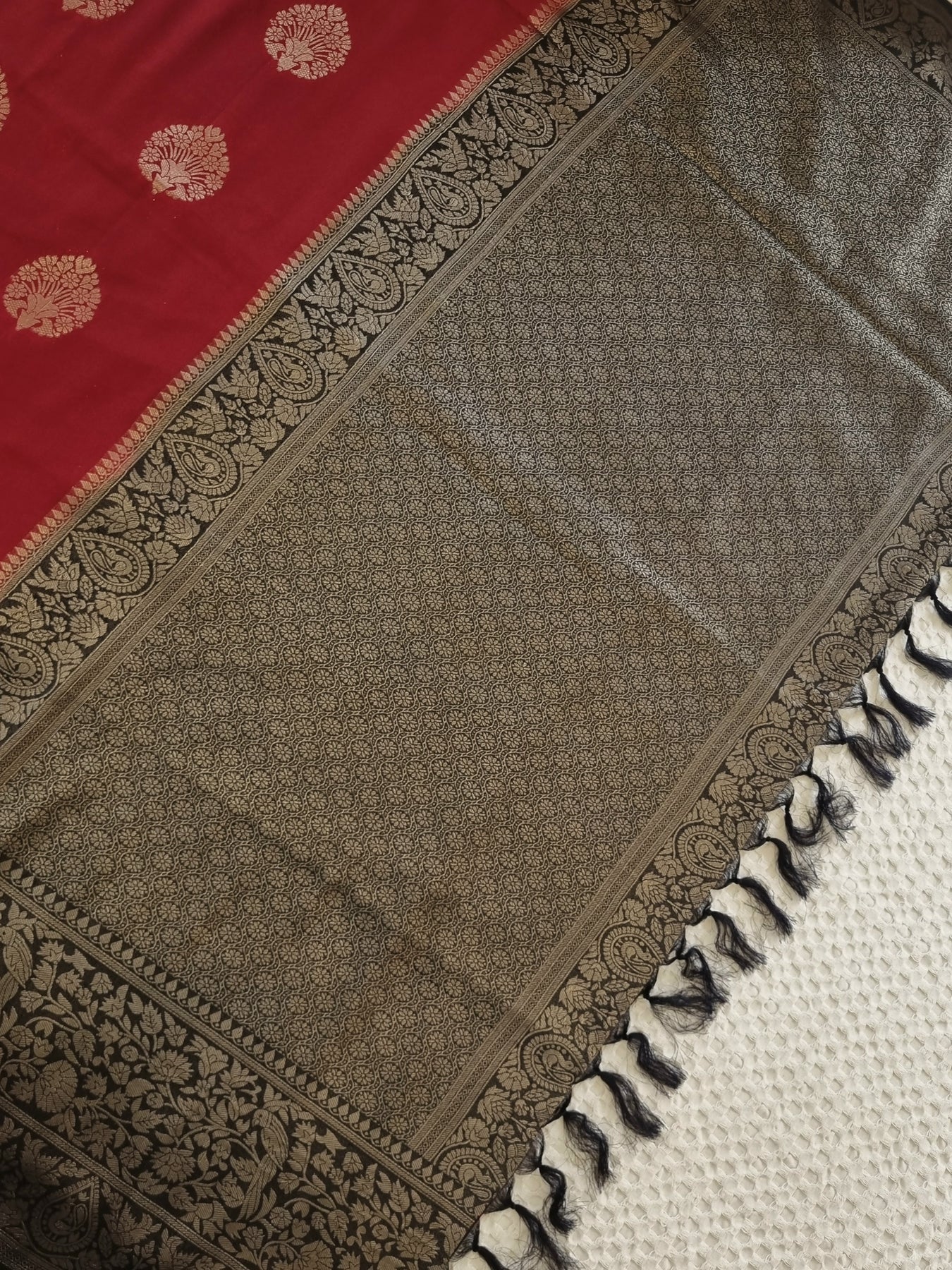 The beautiful Gold motifs on the body and Zari patterns on the pallu elevates the style quotient