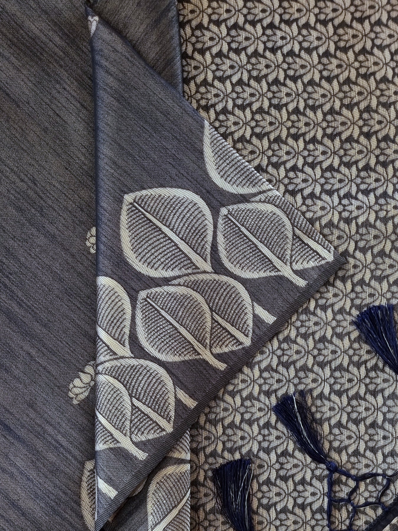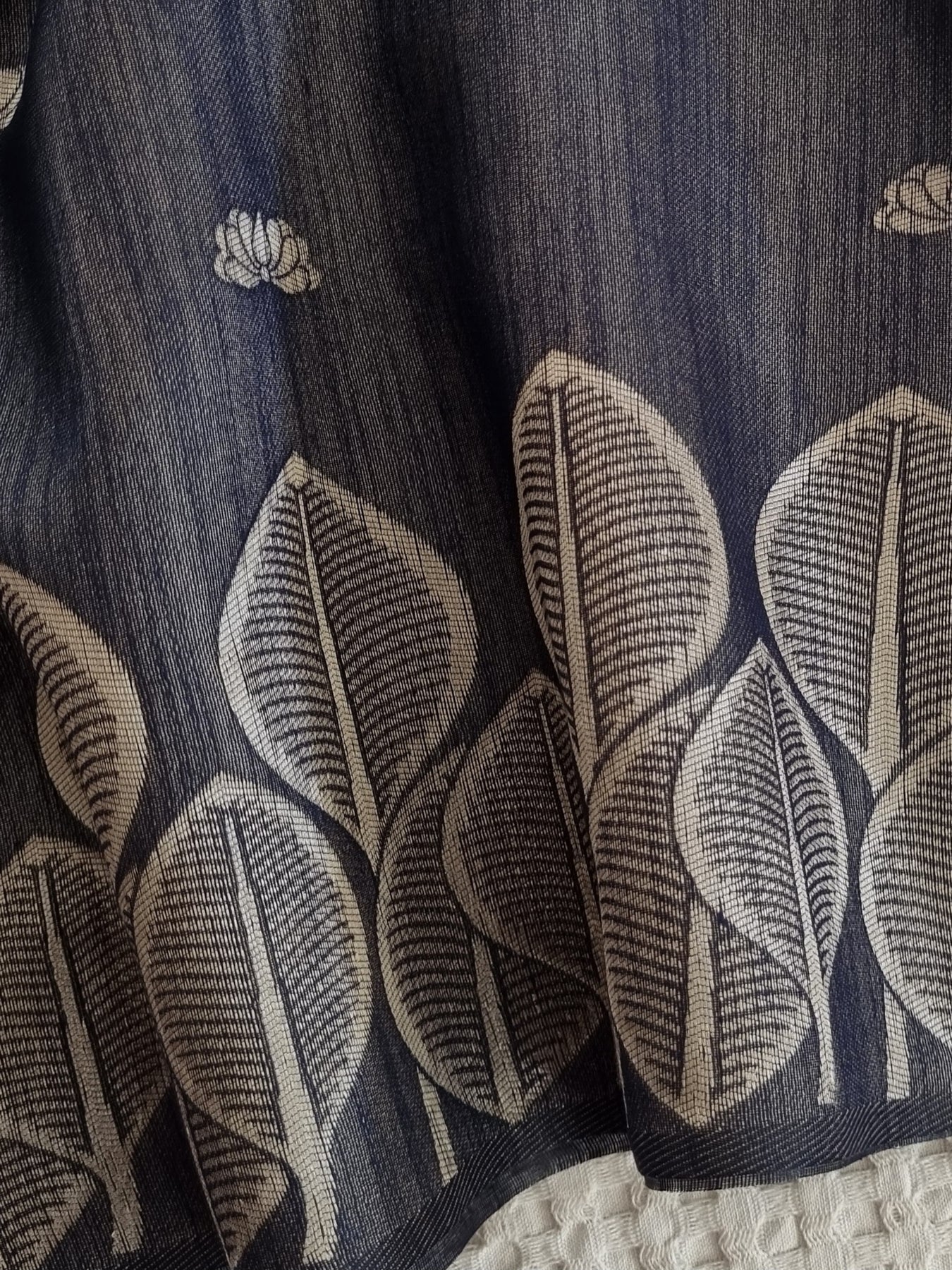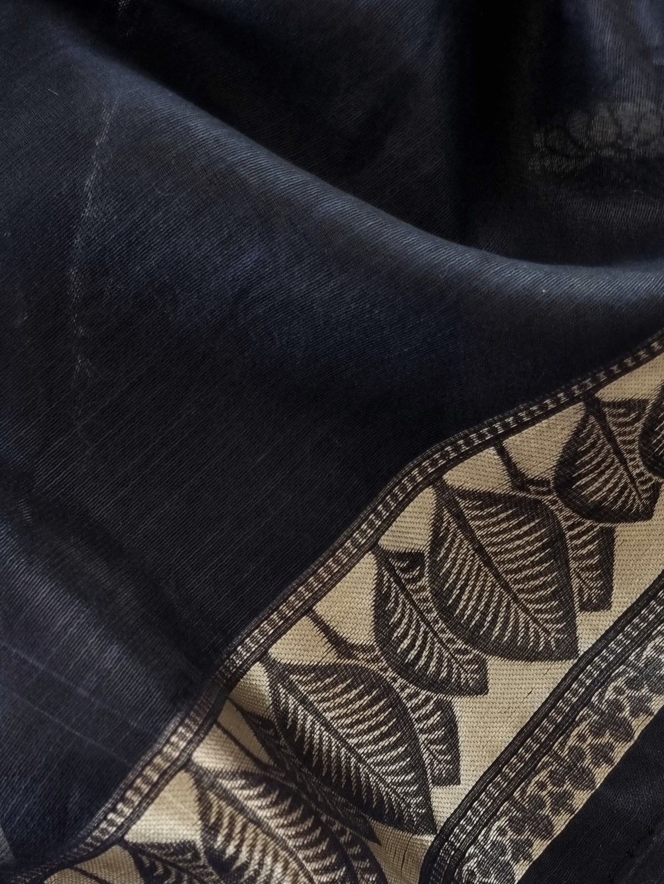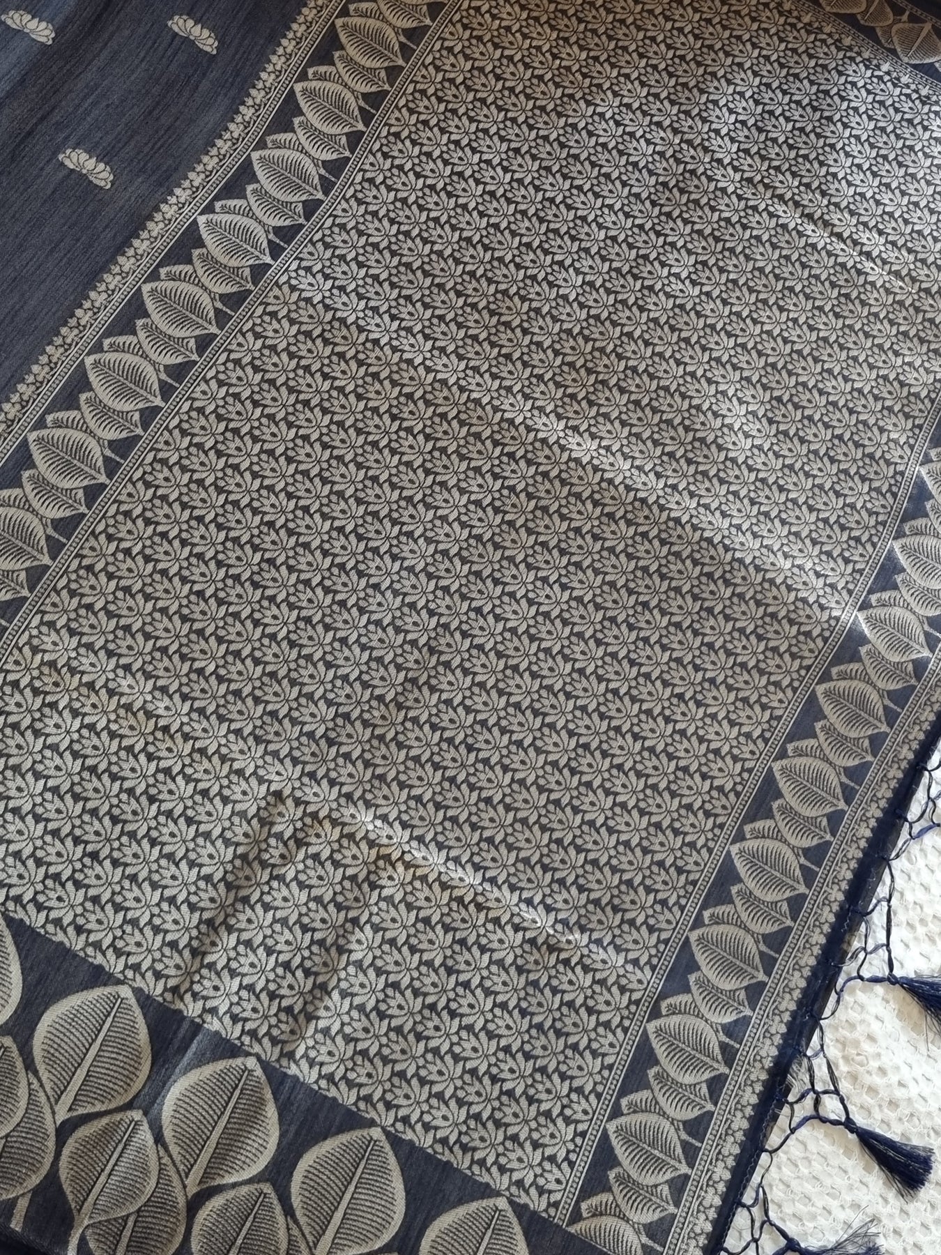 • Navy Blue Semi Silk Saree, with woven borders, paired with matching blouse fabric