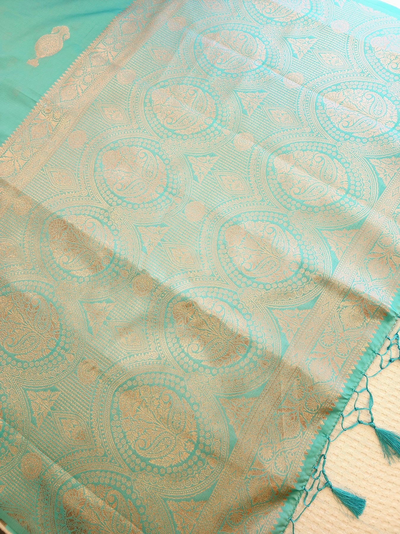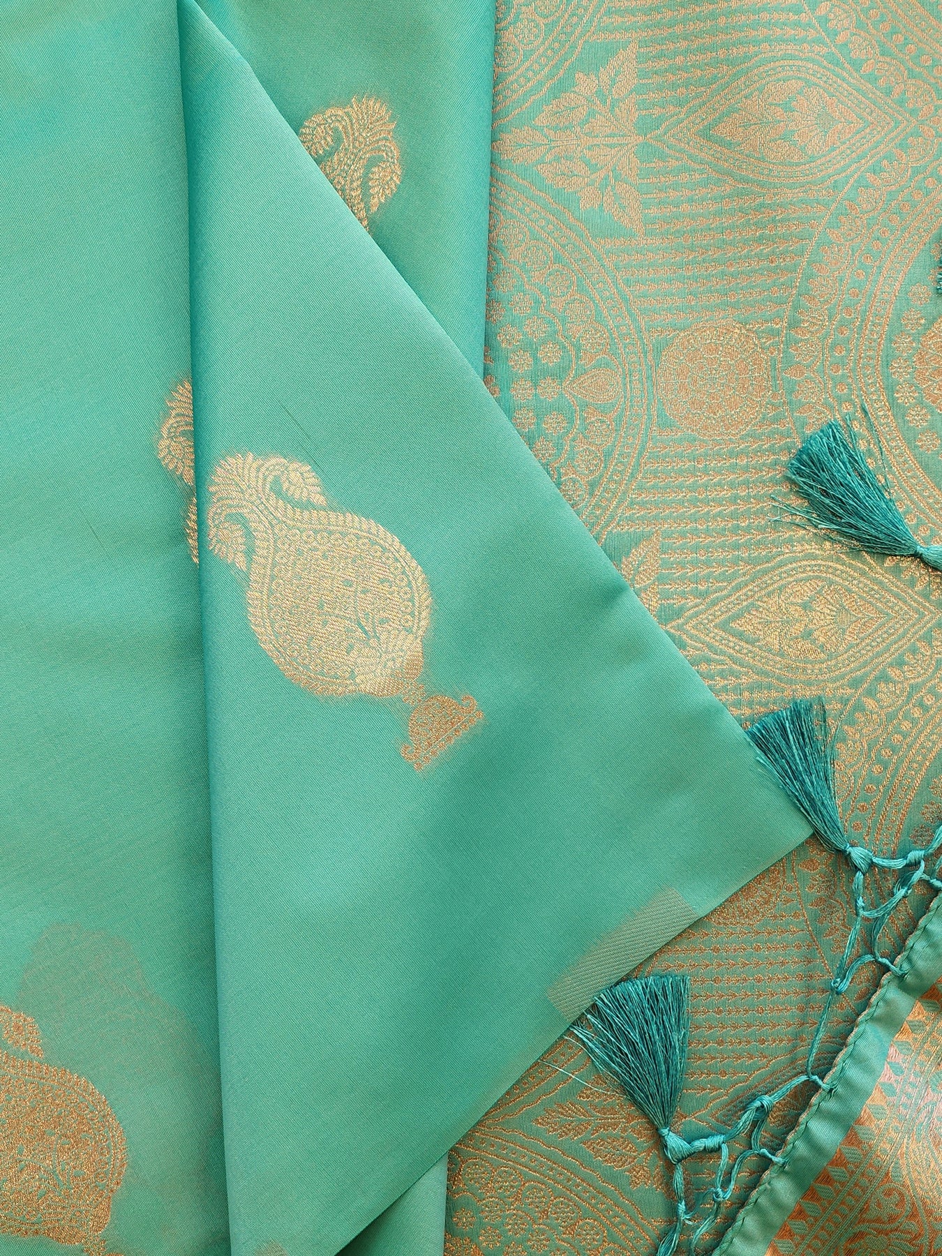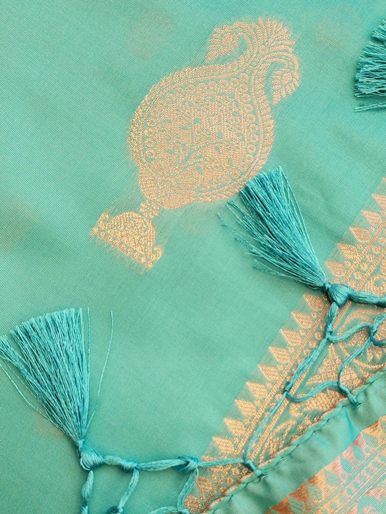 Turquoise Semi-Silk Saree with intricately woven motifs on the body and a contrast pallu, beautifully finished with tassels