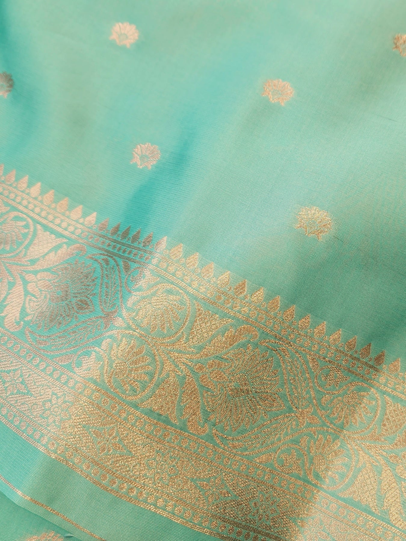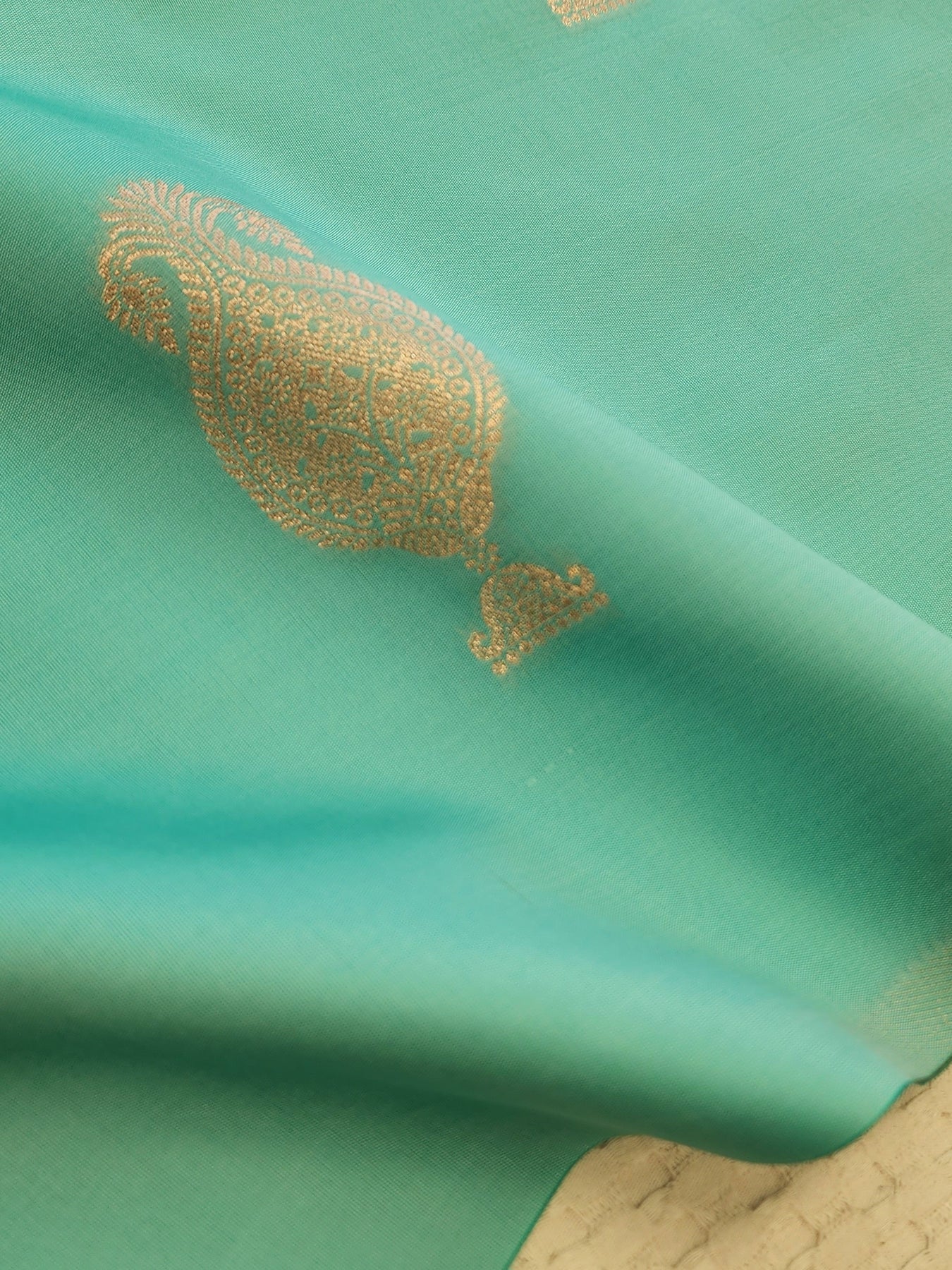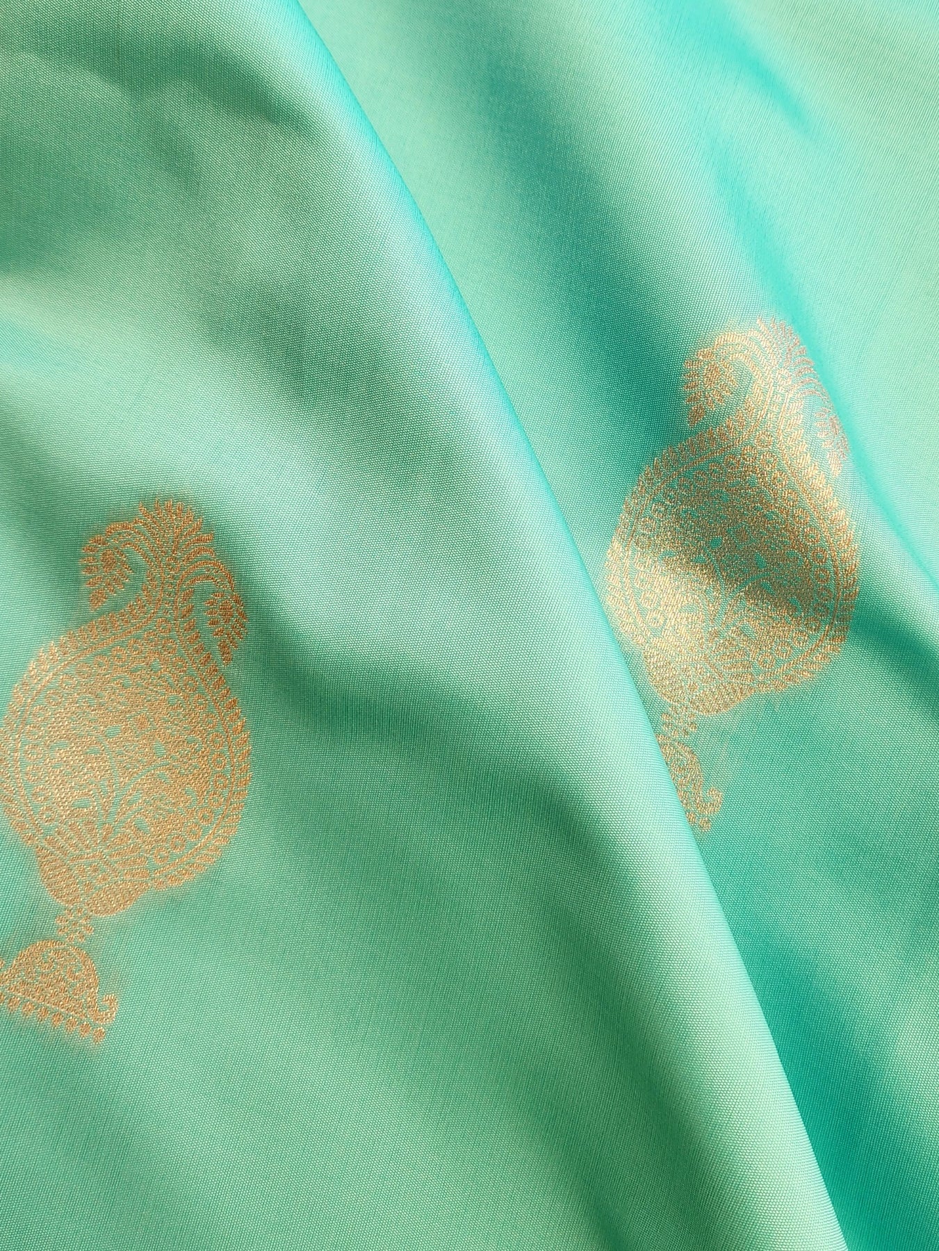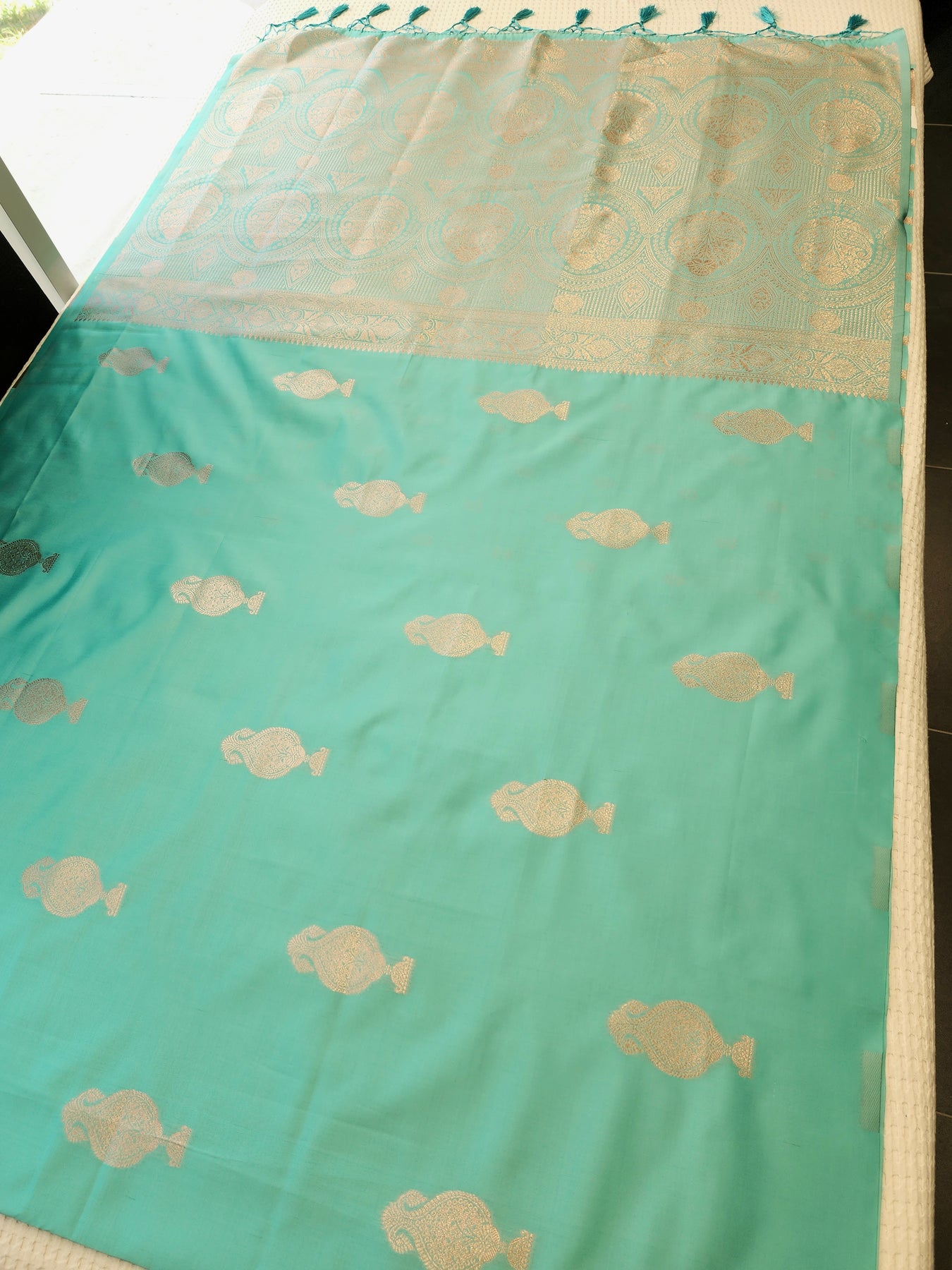 Turquoise Semi-Silk Saree with intricately woven motifs on the body and a contrast pallu, beautifully finished with tassels