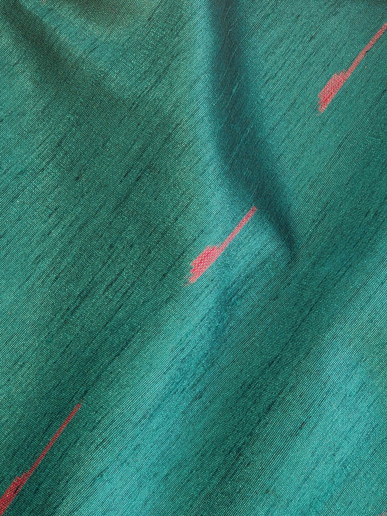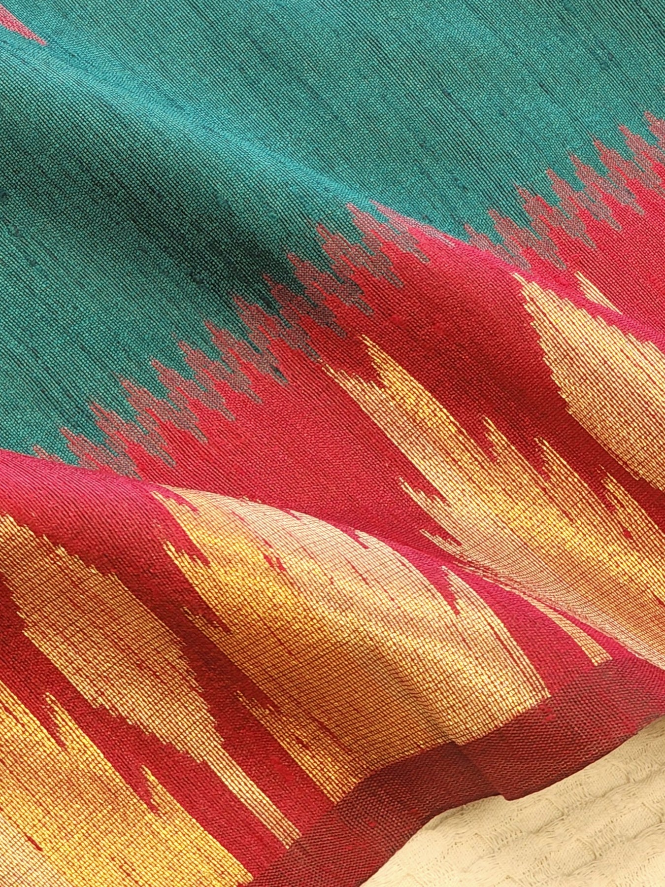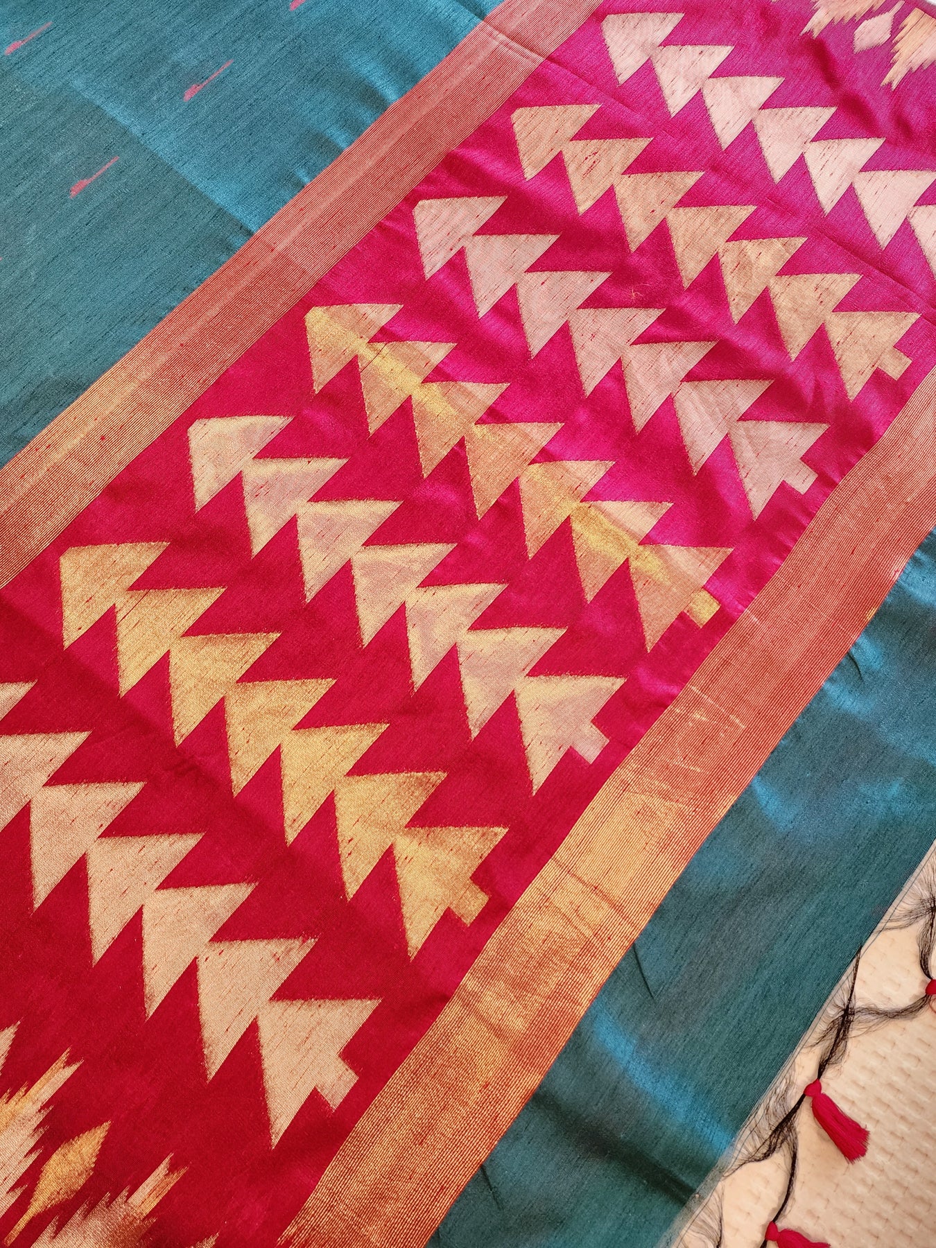 Teal Blue Semi Raw Silk Saree with contrast borders and pallu, beautifully finished with tassels