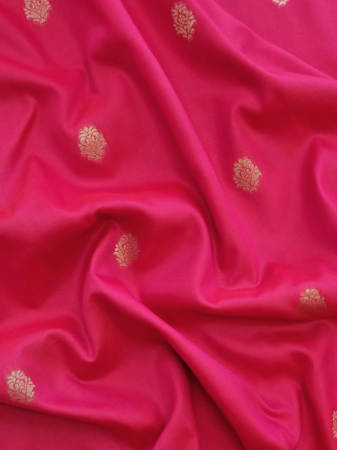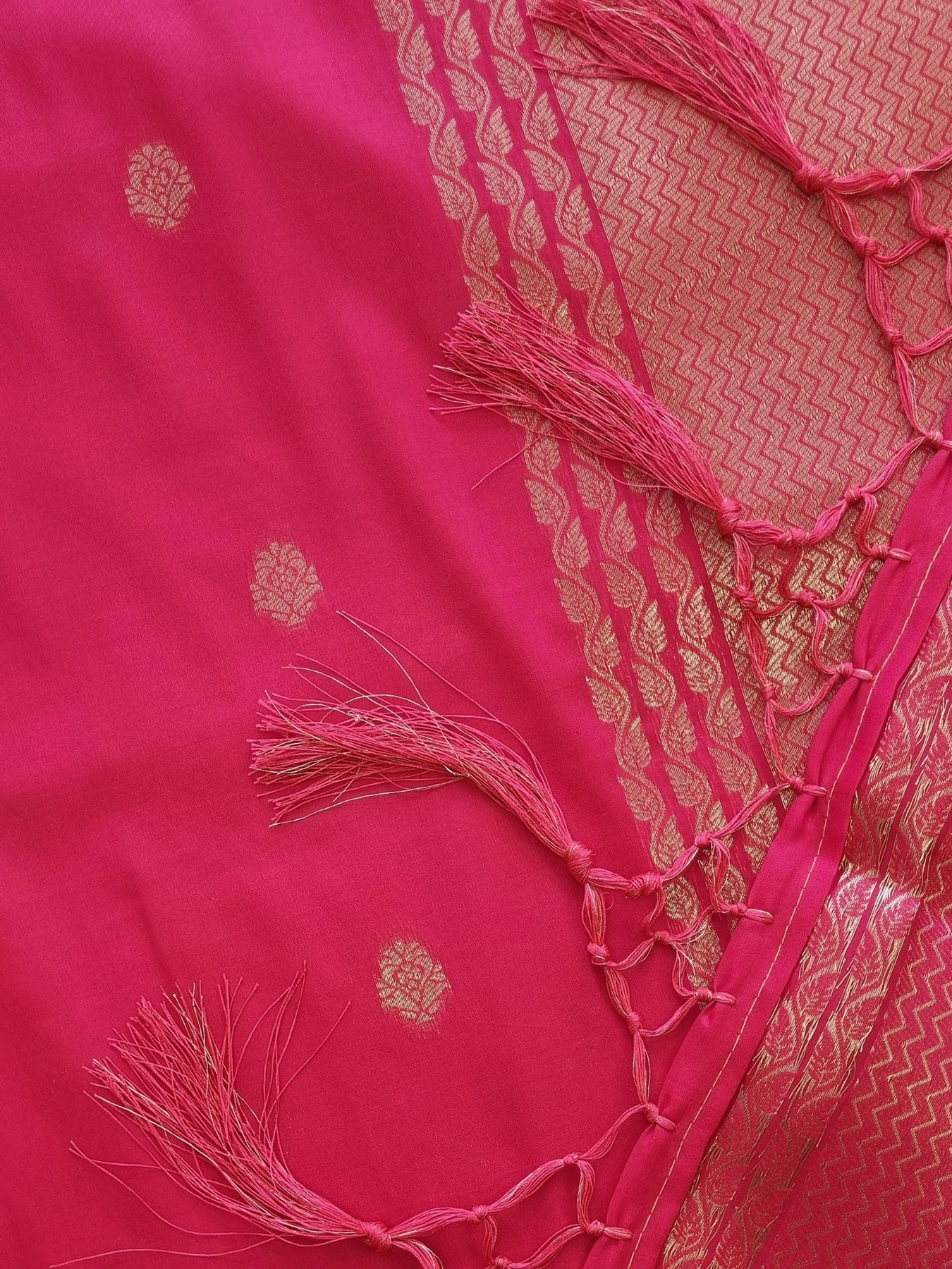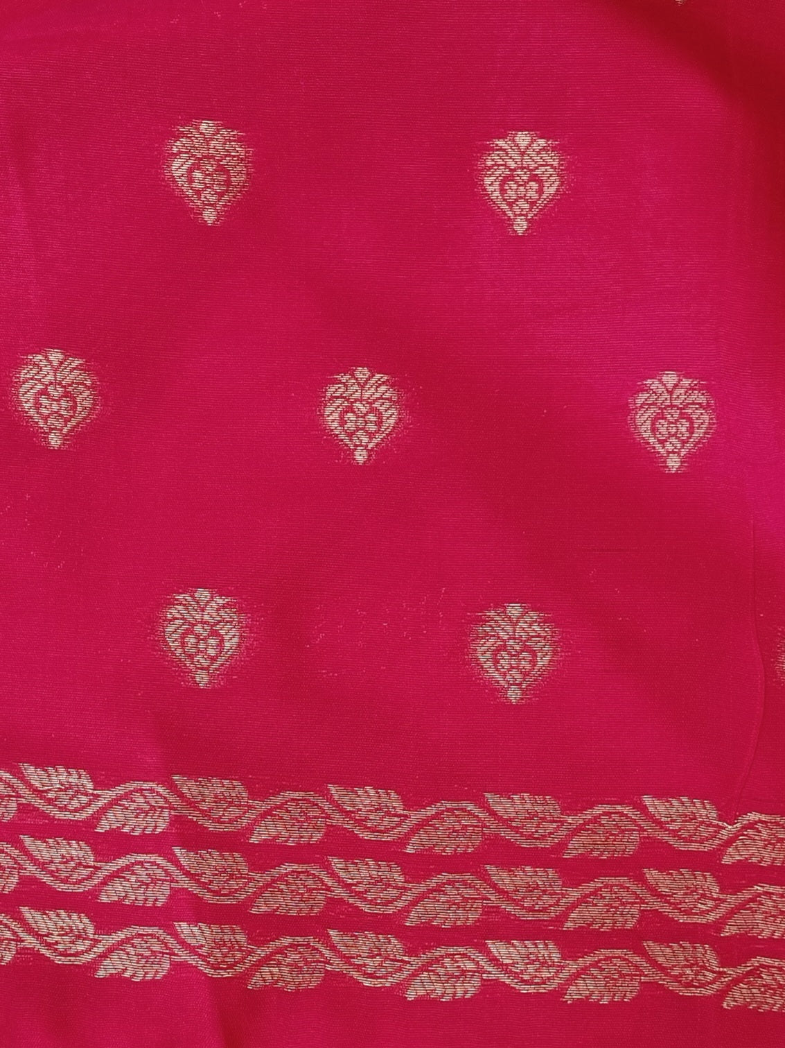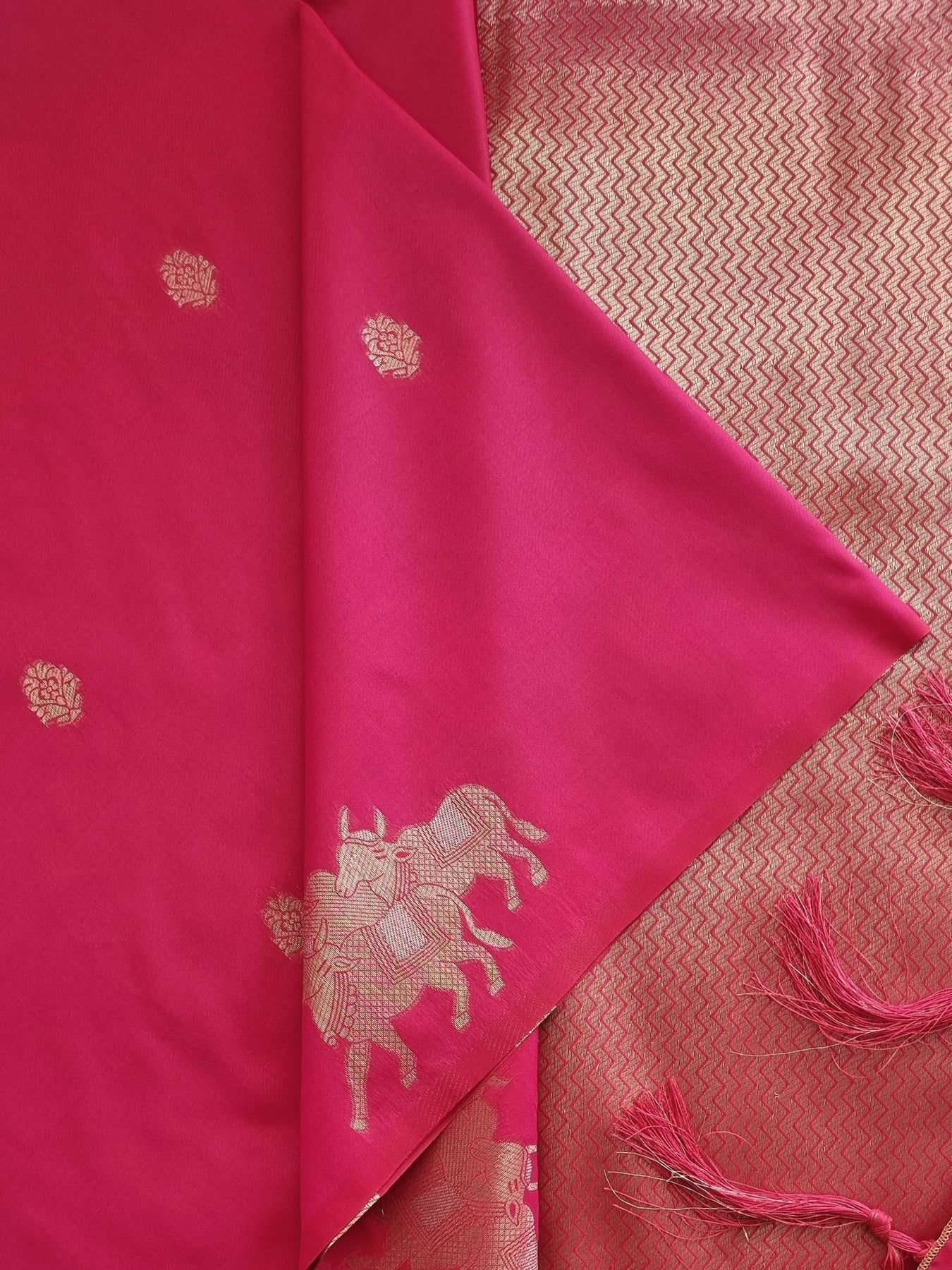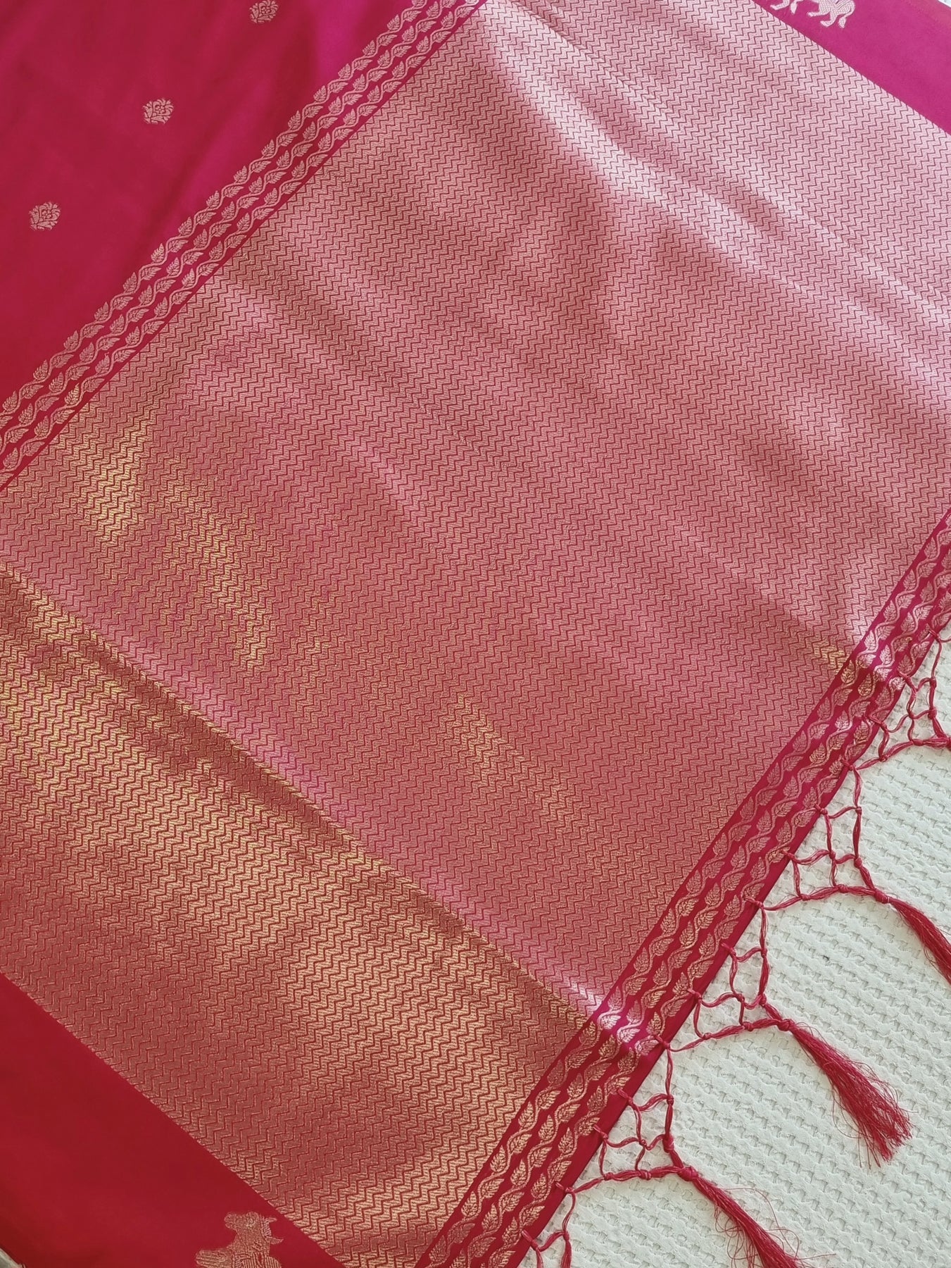 Pink semi silk saree, with woven borders, paired with matching blouse fabric