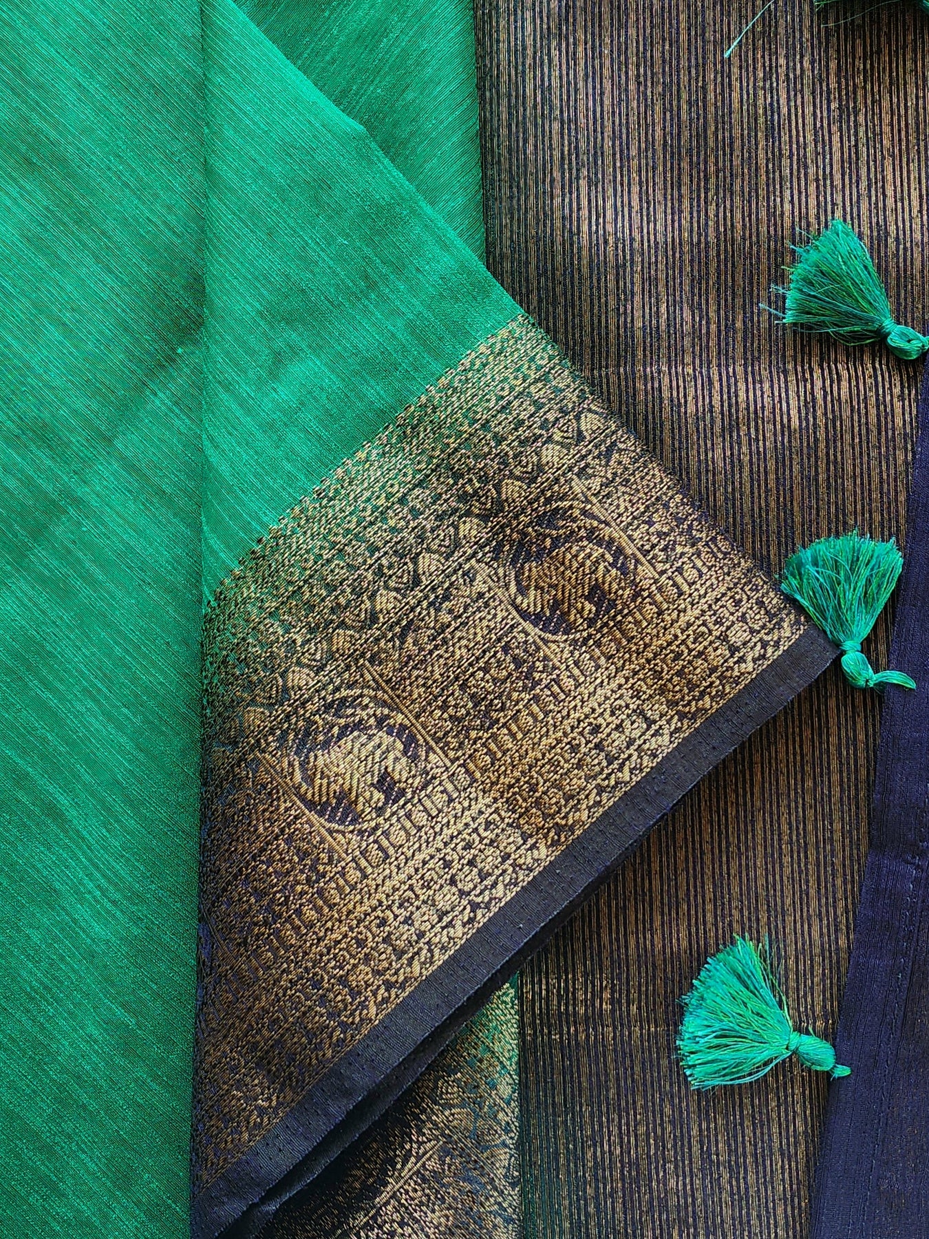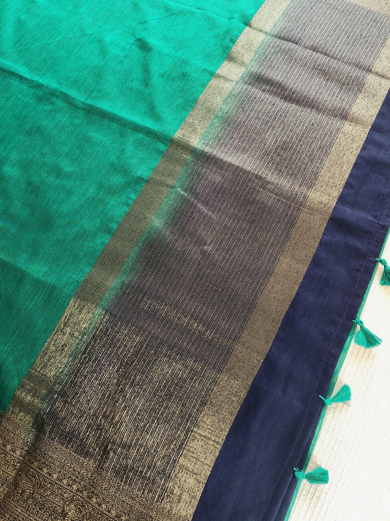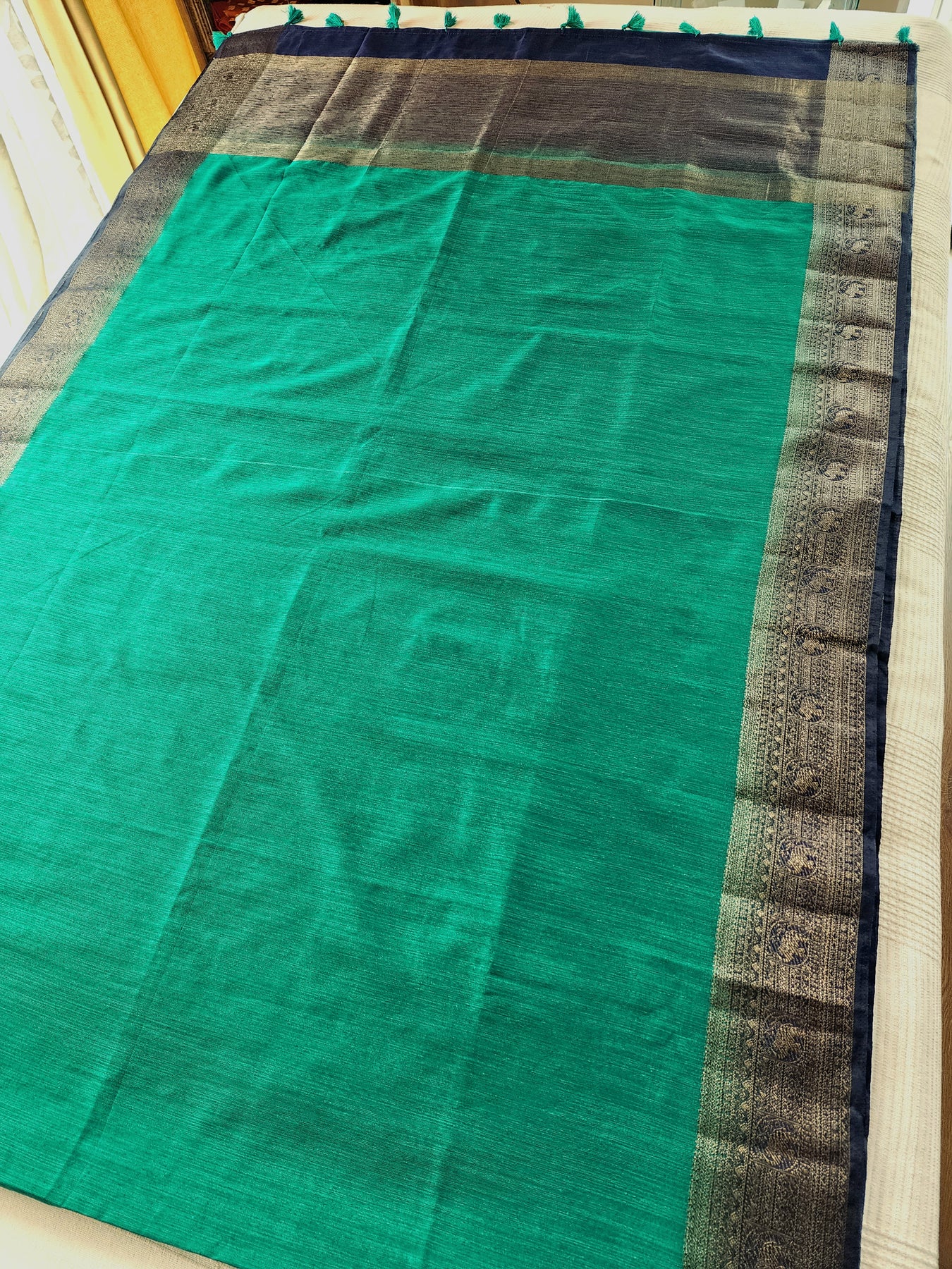 Teal Semi Raw Silk Saree with woven borders and pallu, beautifully finished with tassels