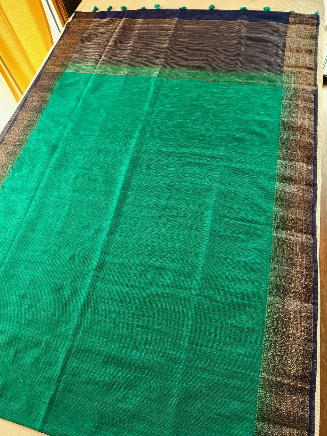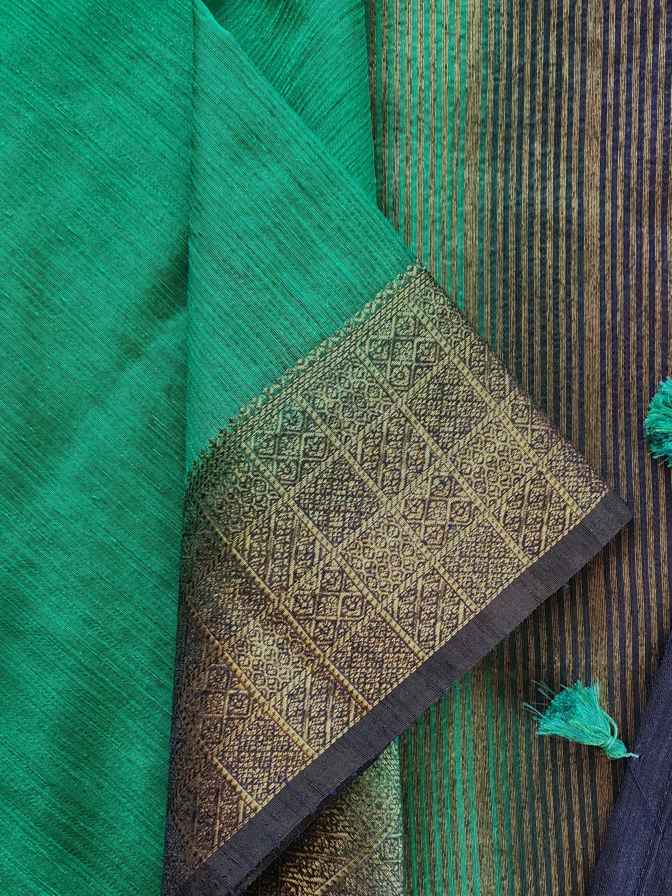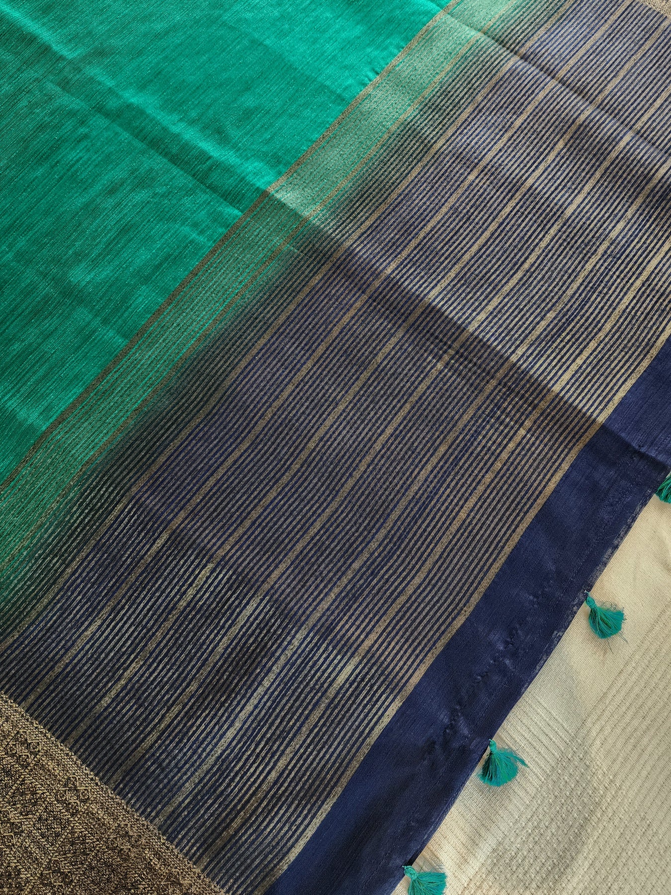 Teal Semi Raw Silk Saree with woven borders and pallu, beautifully finished with tassels