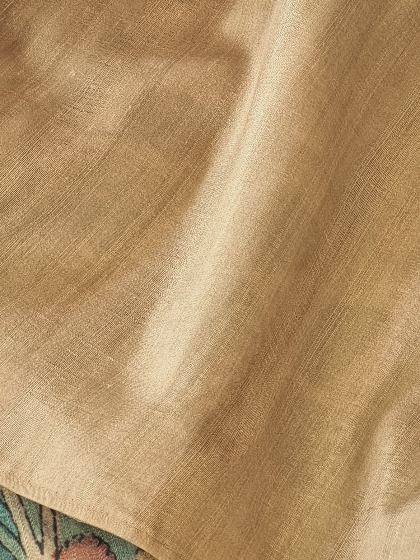 An elegant Semi Tussar Silk Saree with Digital Kalamkari Prints on the body and a cutwork border and pallu