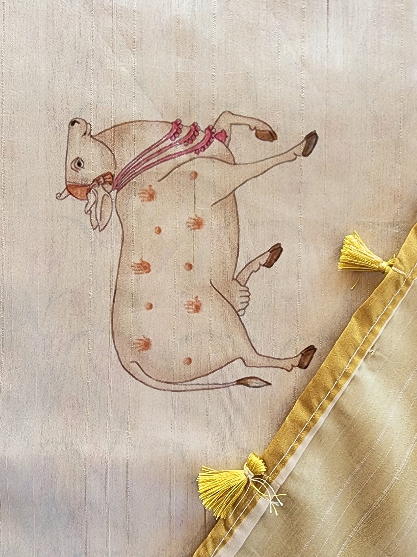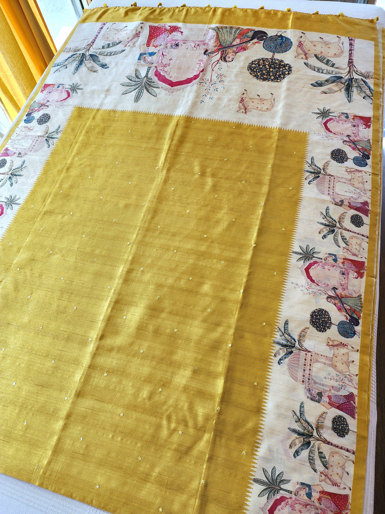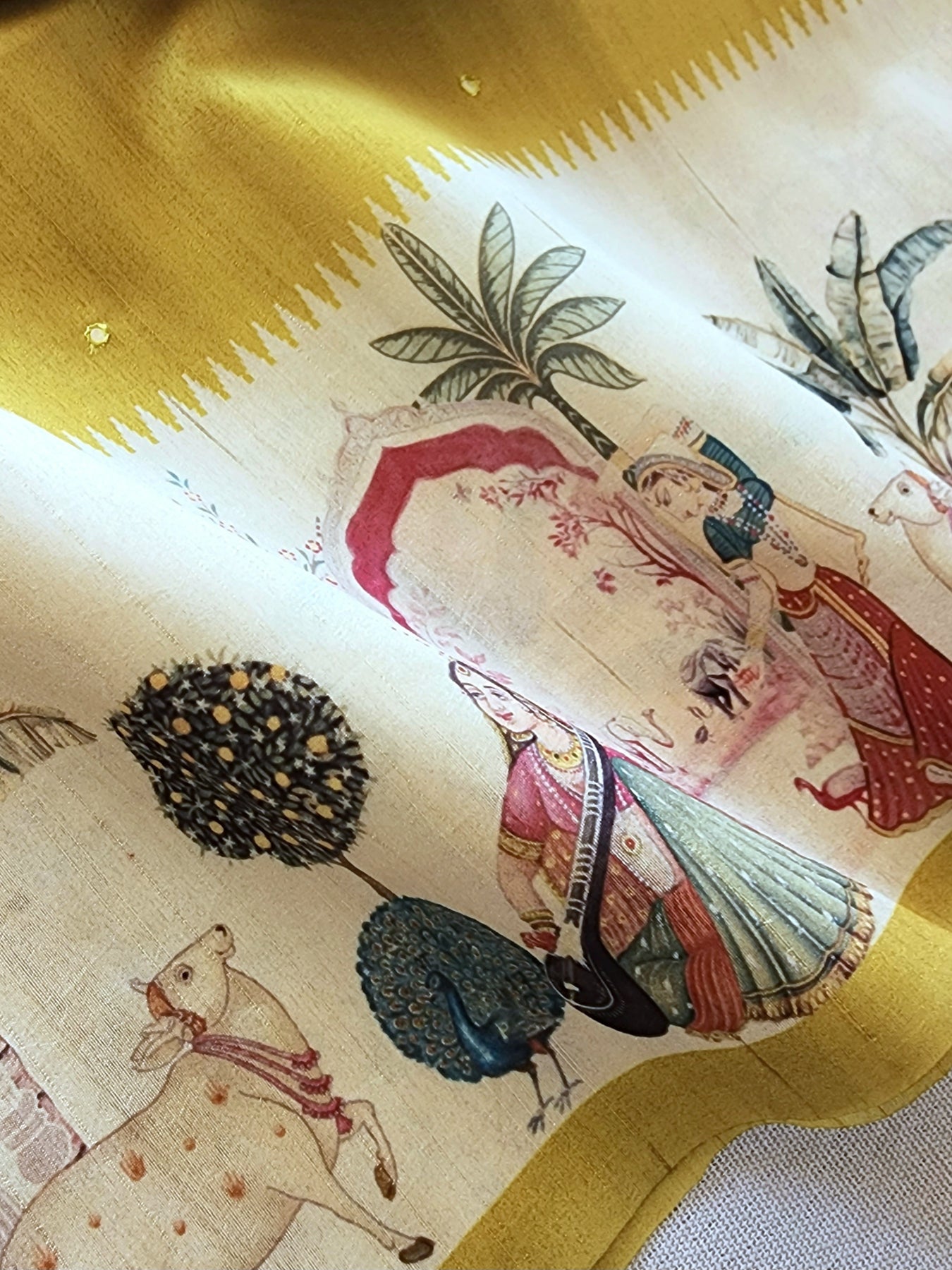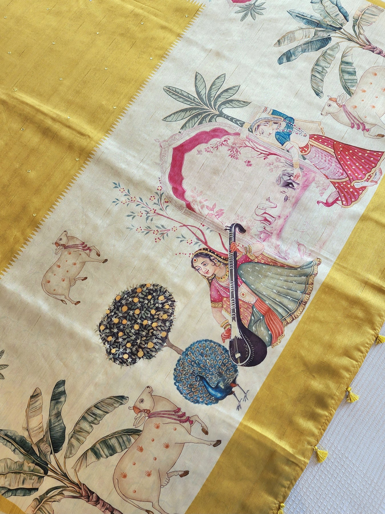 An elegant Semi Tussar Silk Saree with Mirror Work on the Body & Pallu & Digital Pichwai Prints on the Pallu