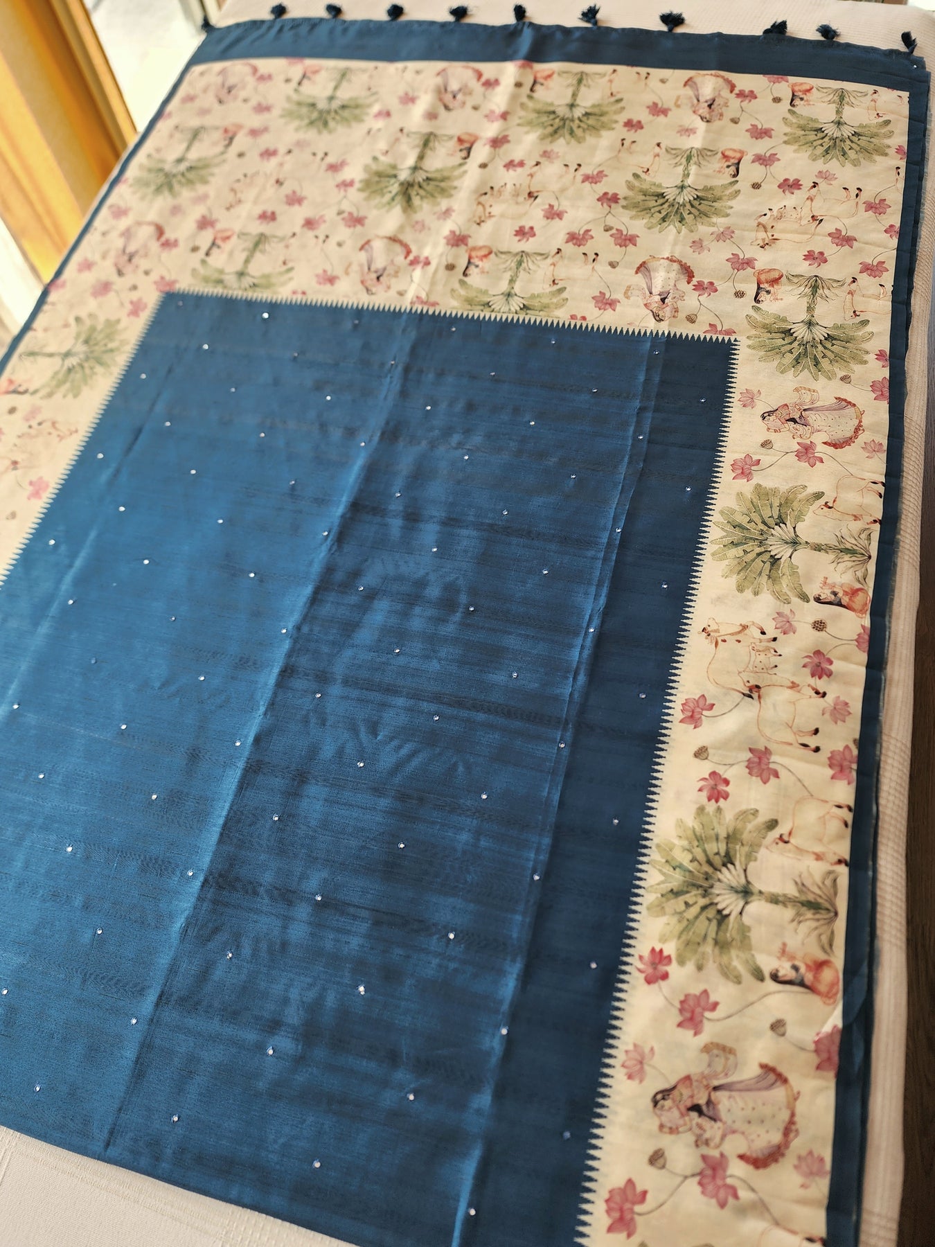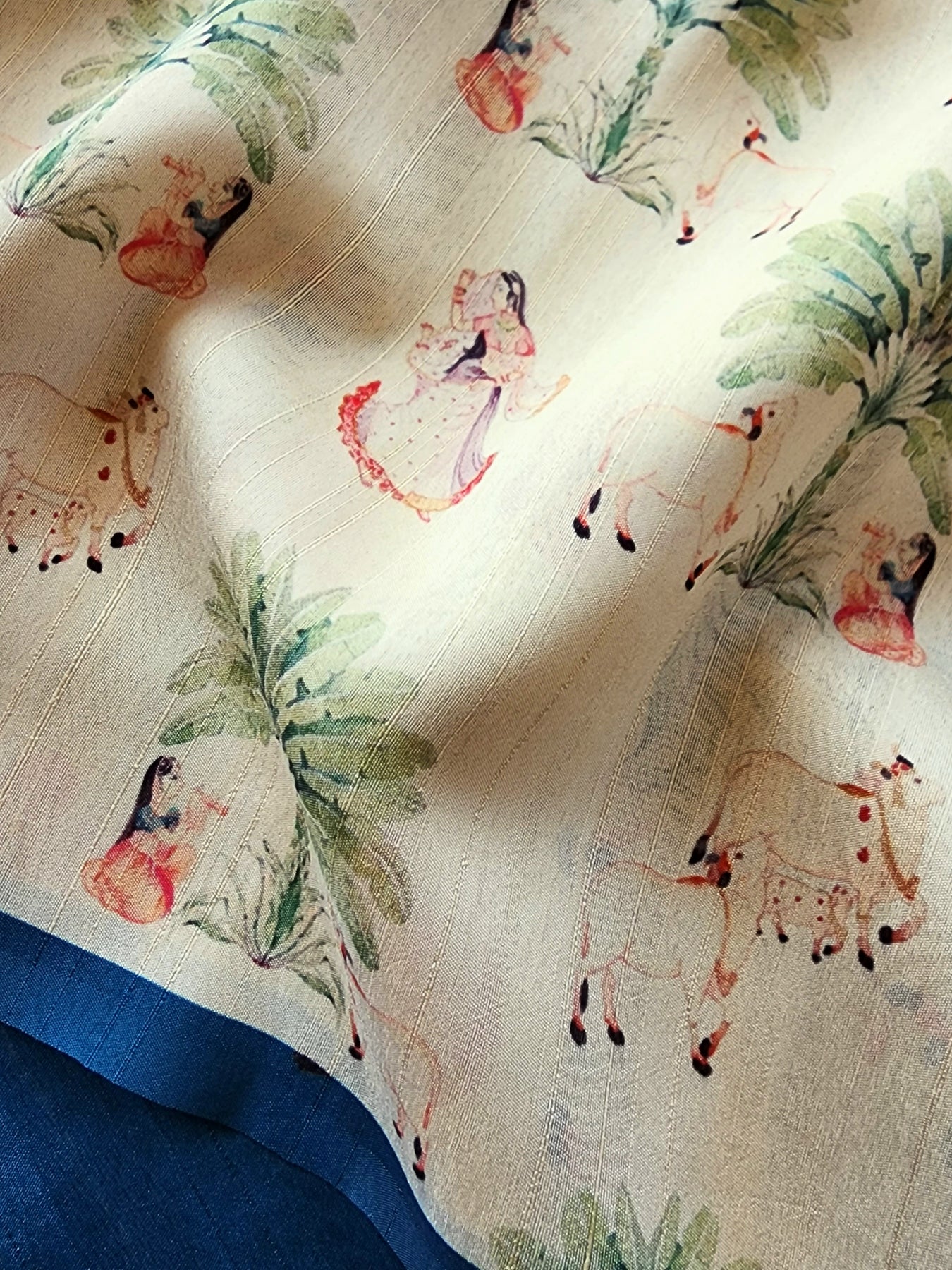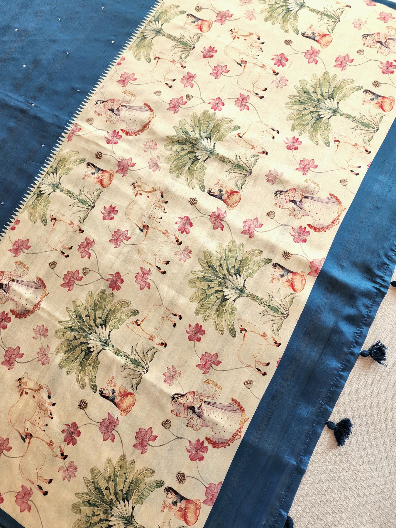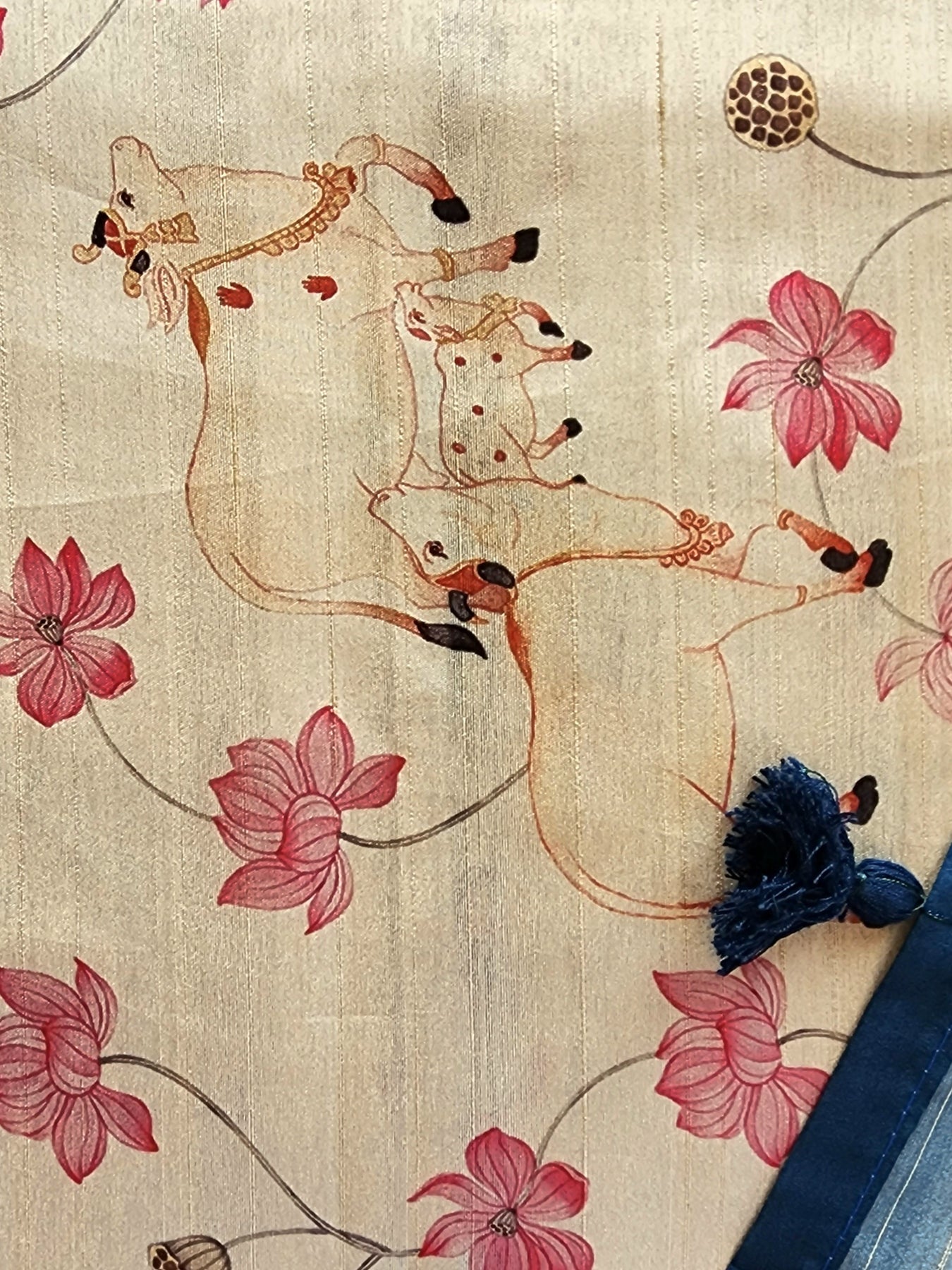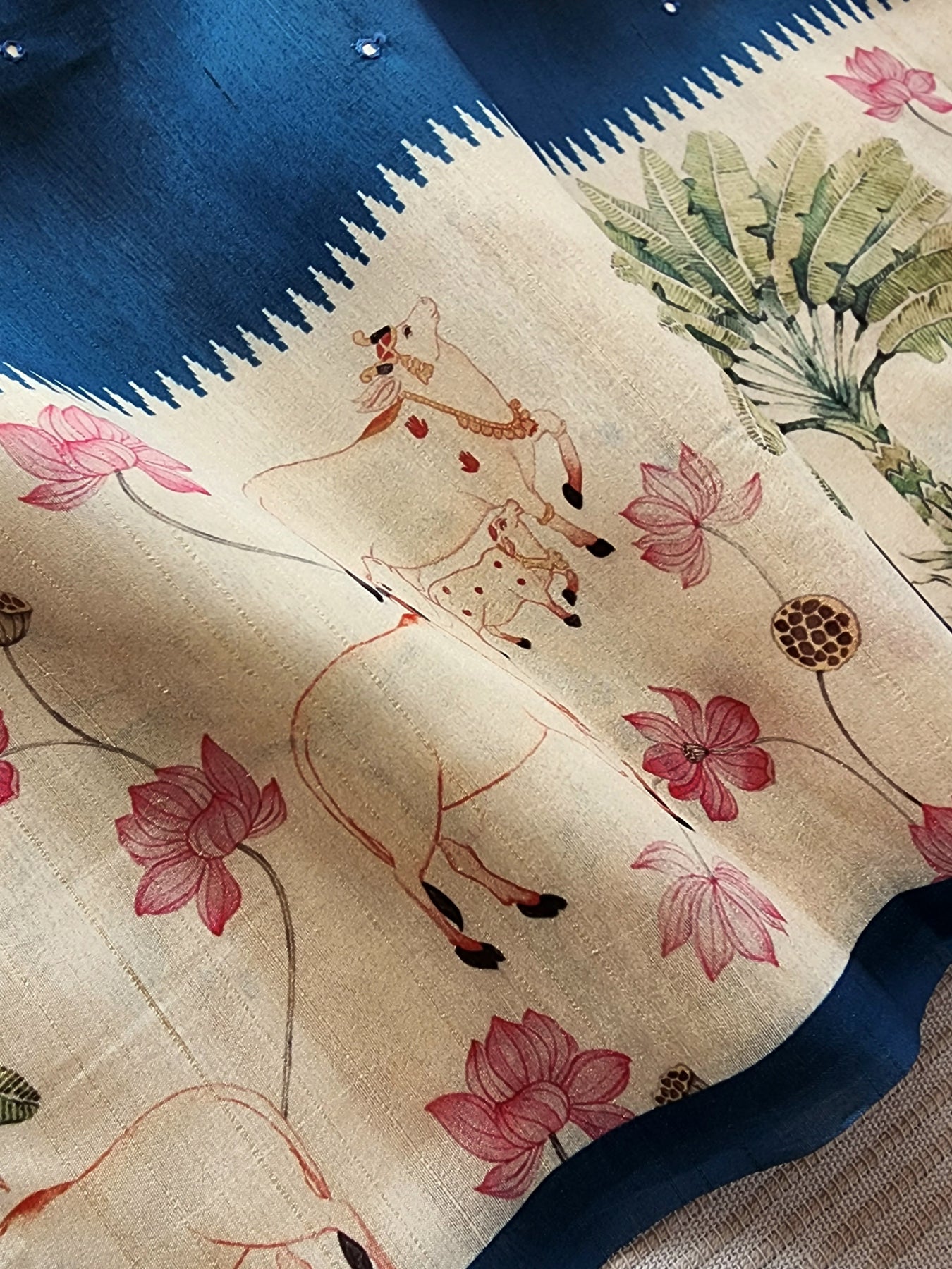 An elegant Semi Tussar Silk Saree with Mirror Work on the Body & Pallu & Digital Pichwai Prints on the Pallu
