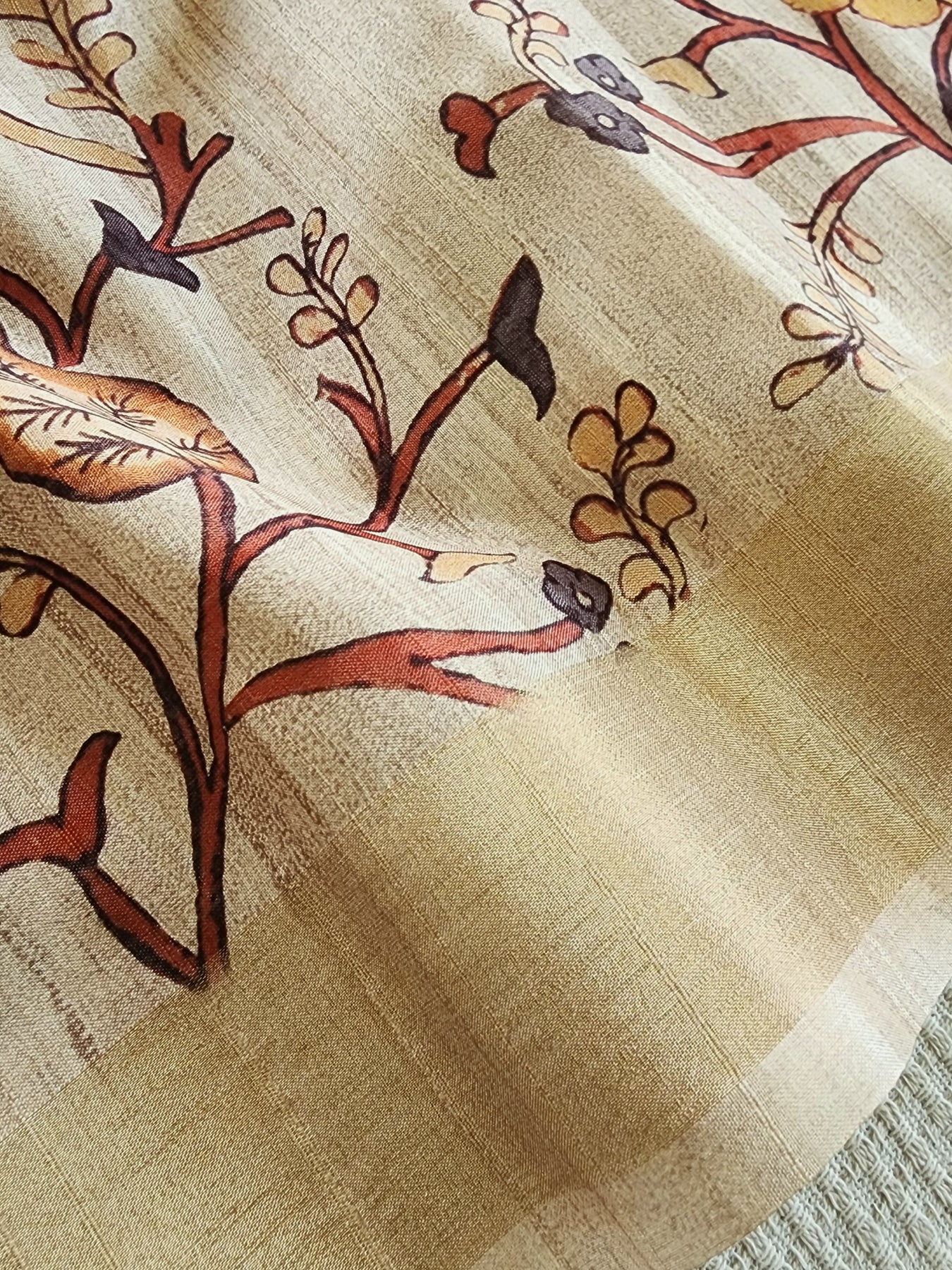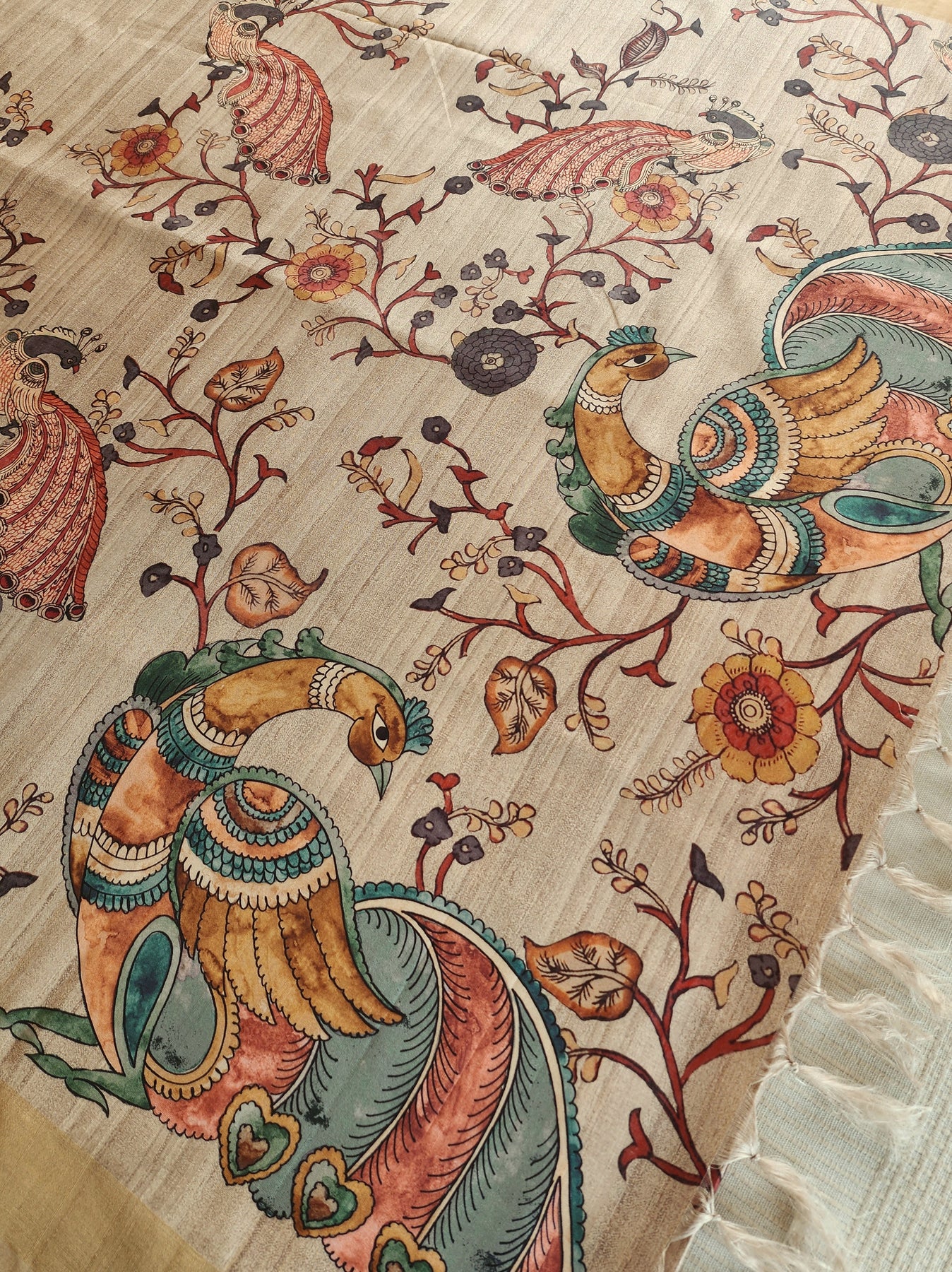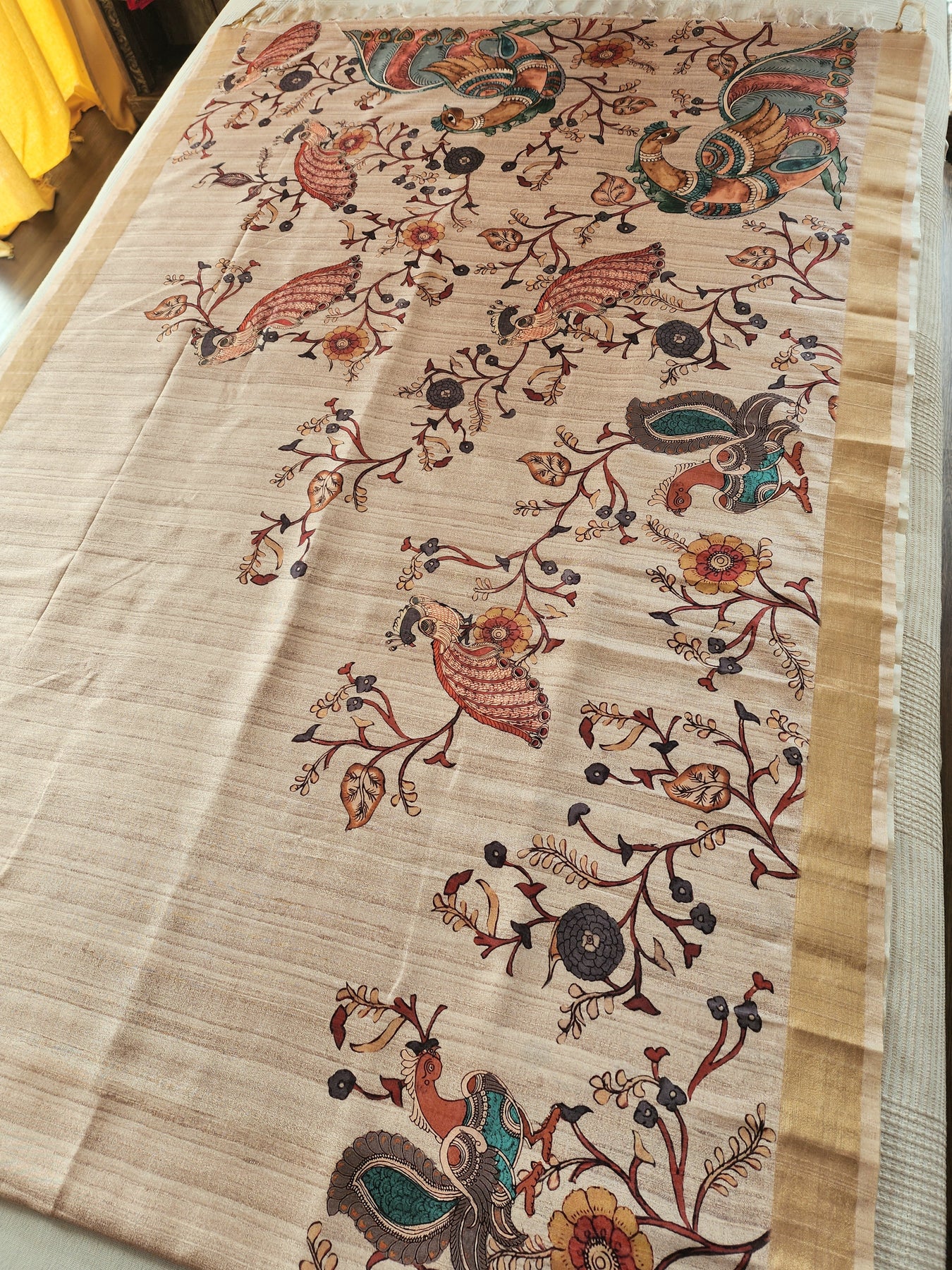 • An elegant Semi Tussar Silk Saree with contrast borders and Kalamkari Prints on the body and the pallu of the saree