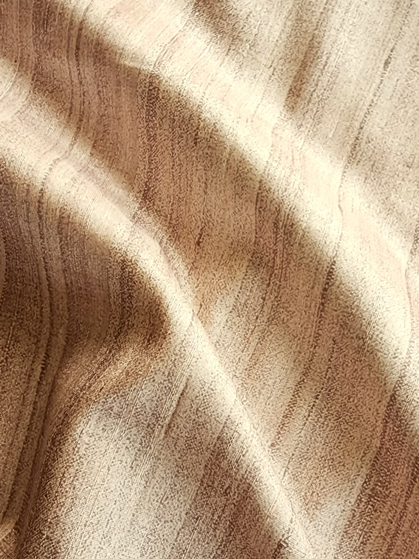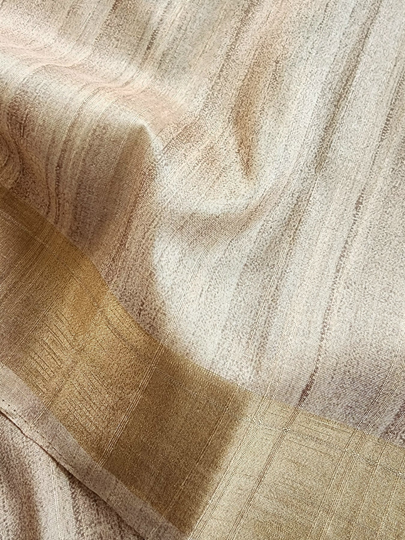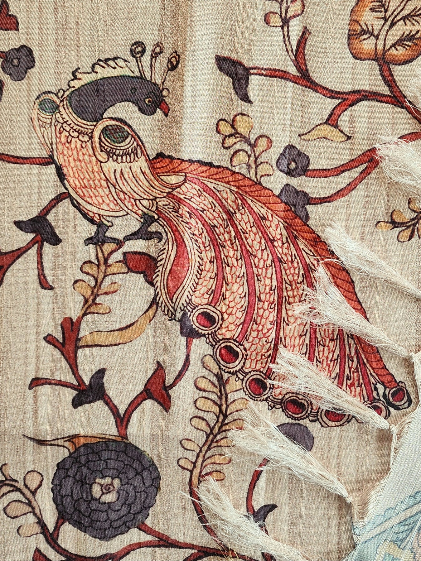 • An elegant Semi Tussar Silk Saree with contrast borders and Kalamkari Prints on the body and the pallu of the saree