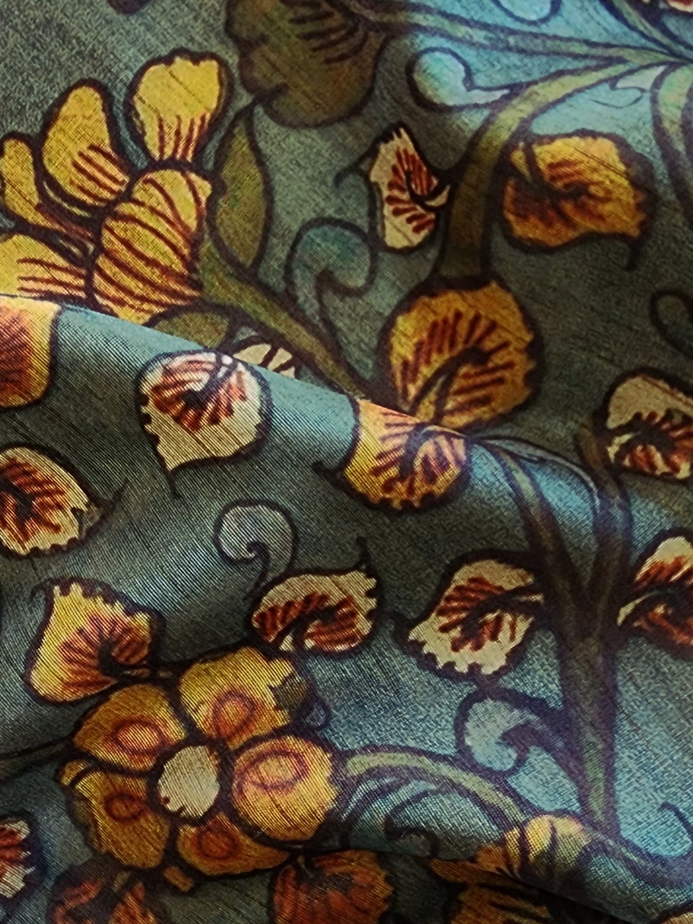 • The contrast borders and elegant Kalamkari prints elevate the style quotient