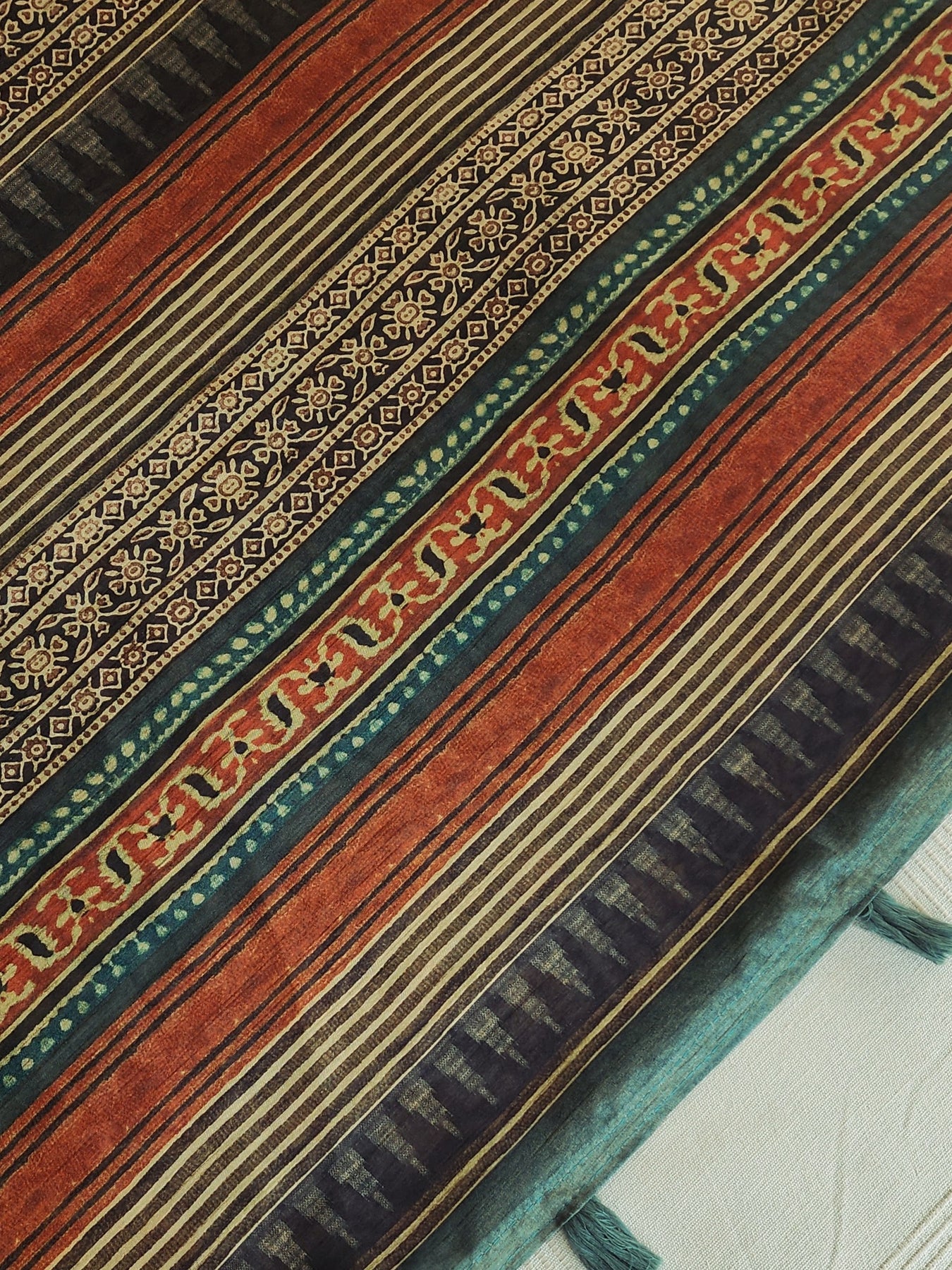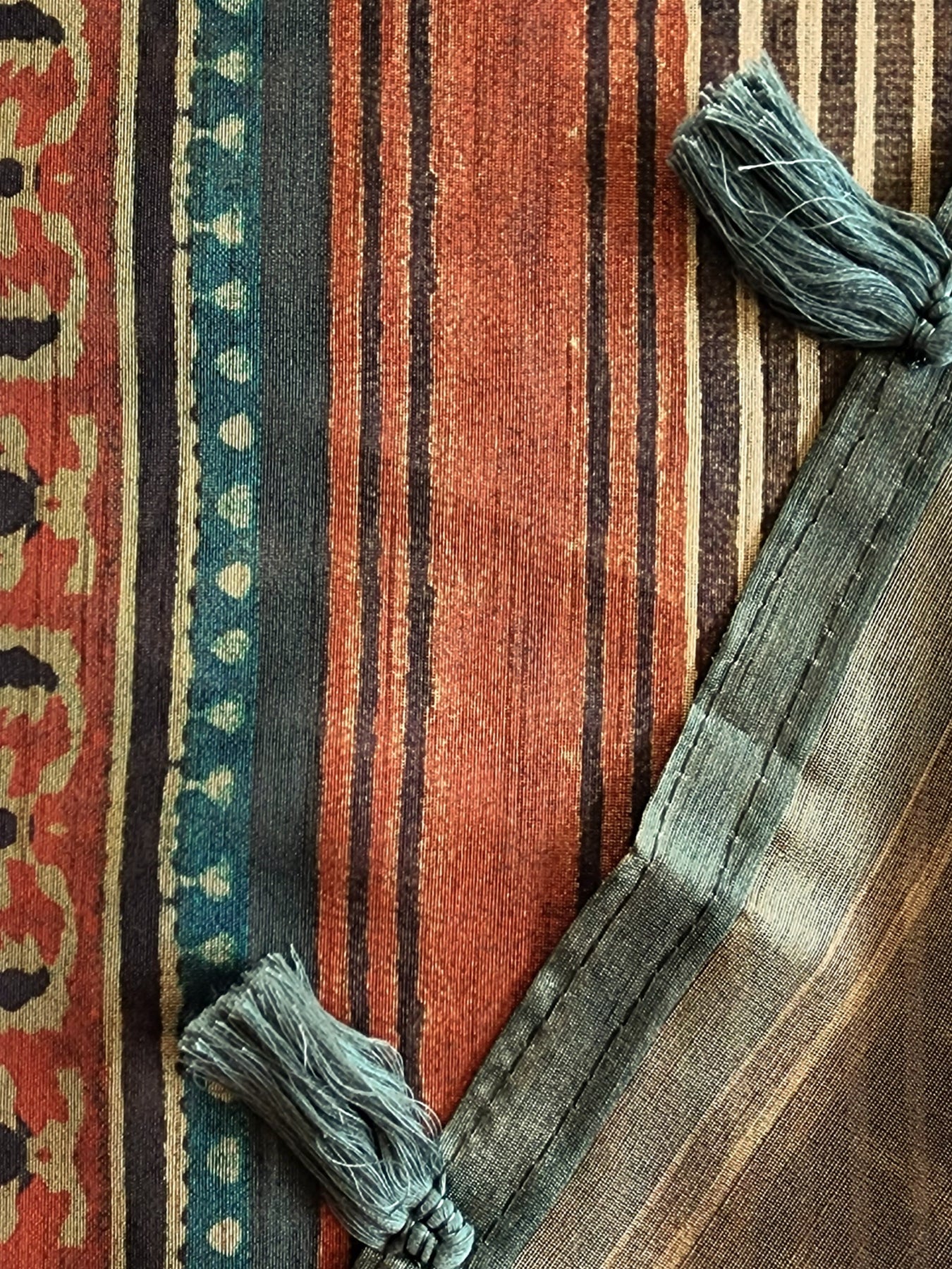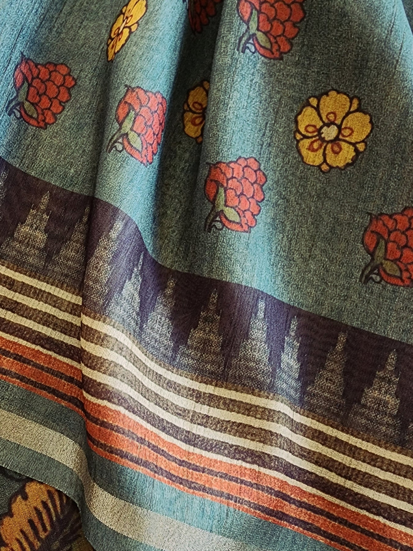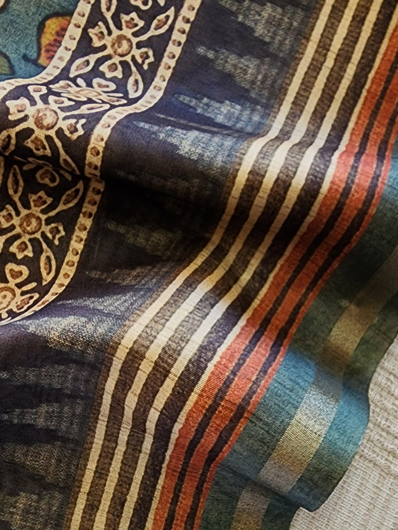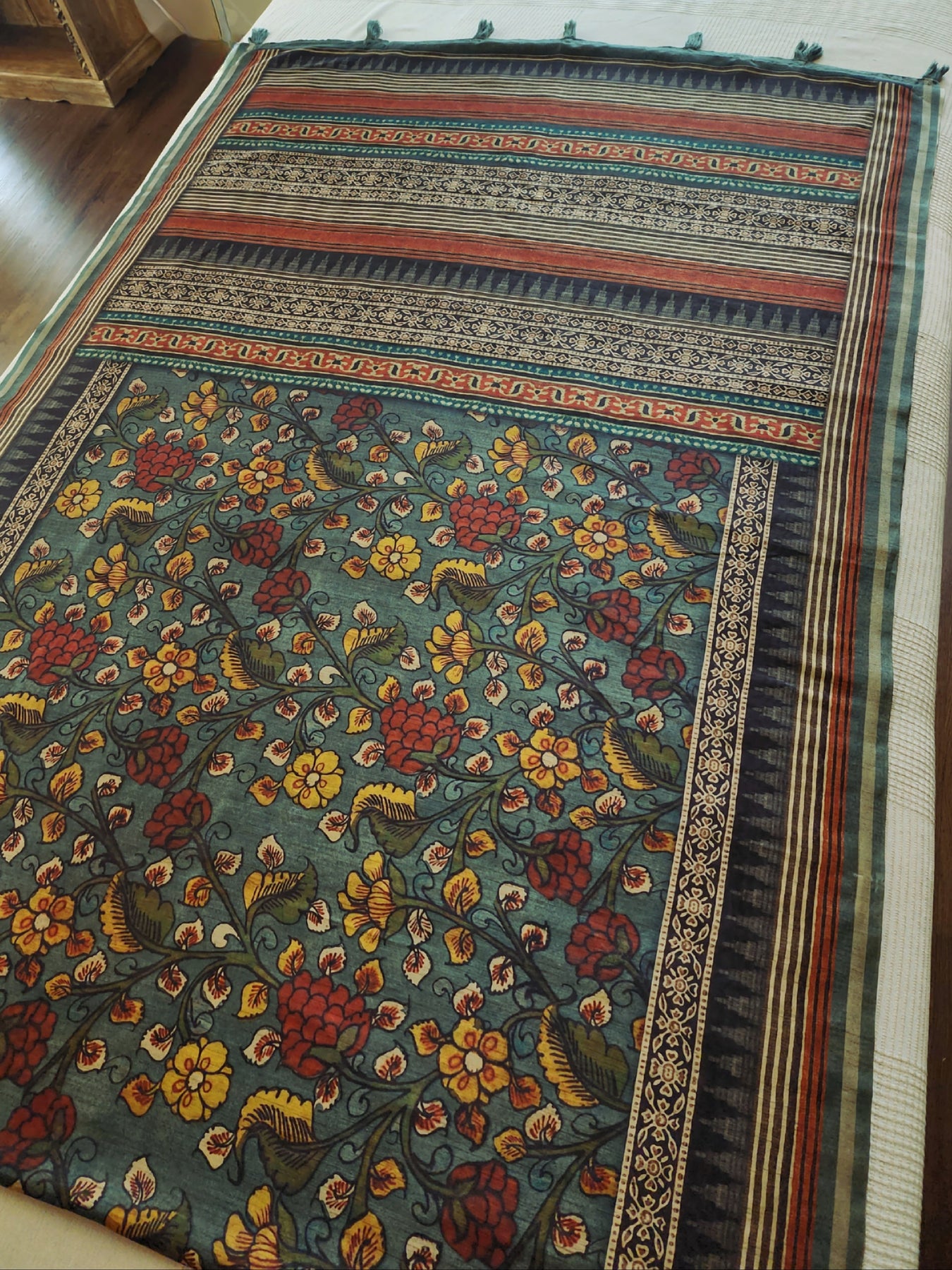 • An elegant Semi Tussar Silk Saree with contrast borders and Kalamkari Prints on the body of the saree