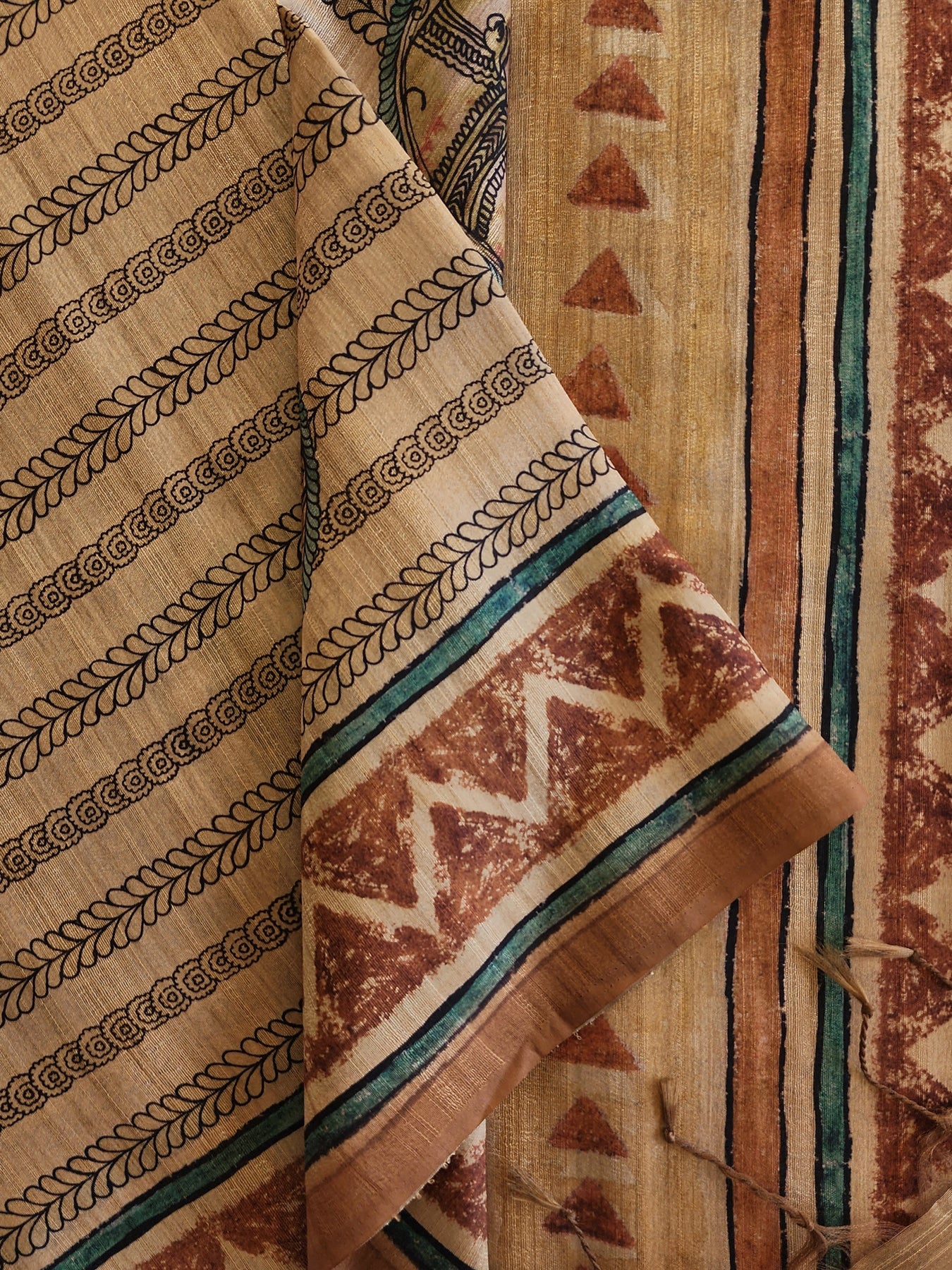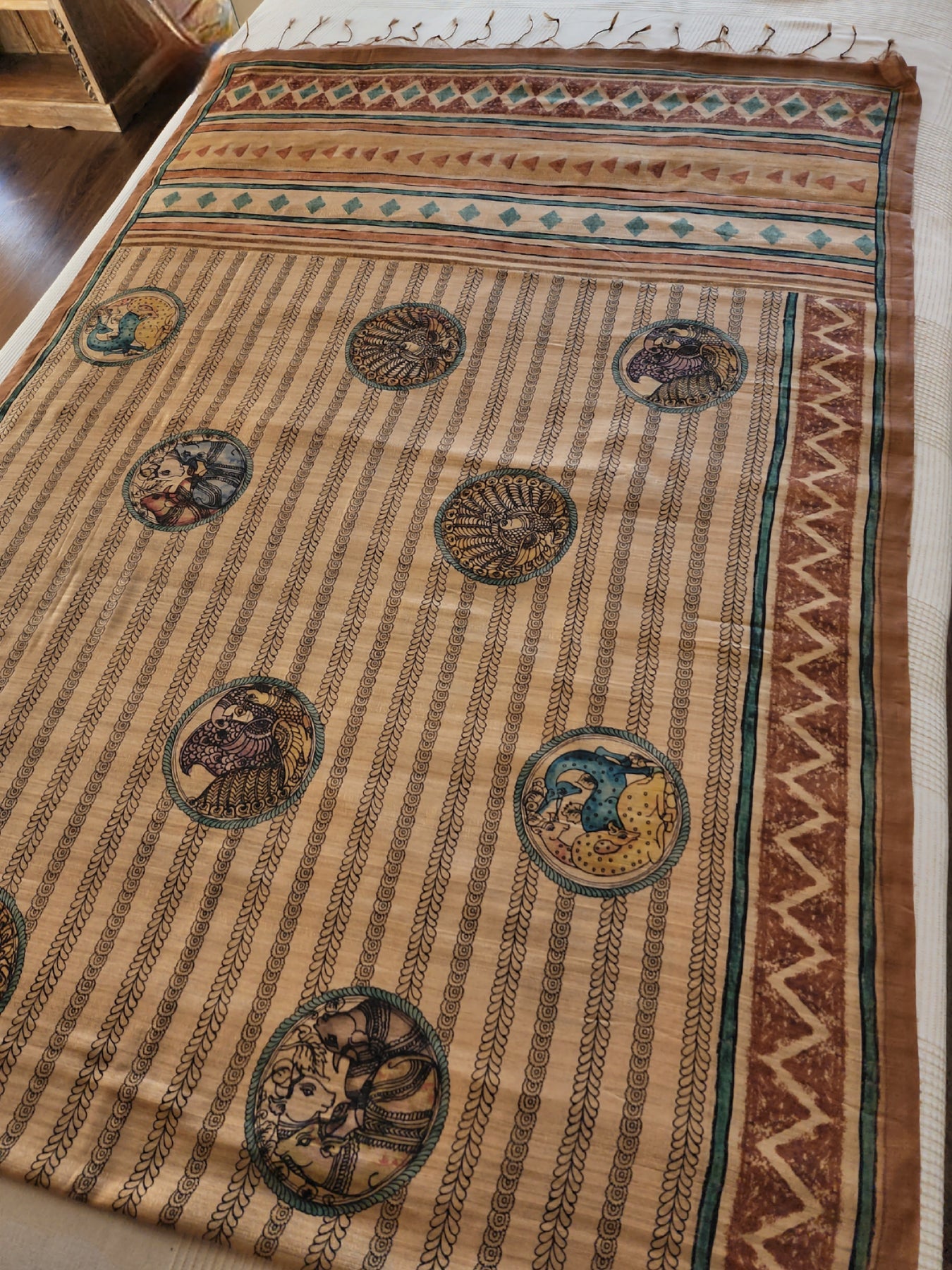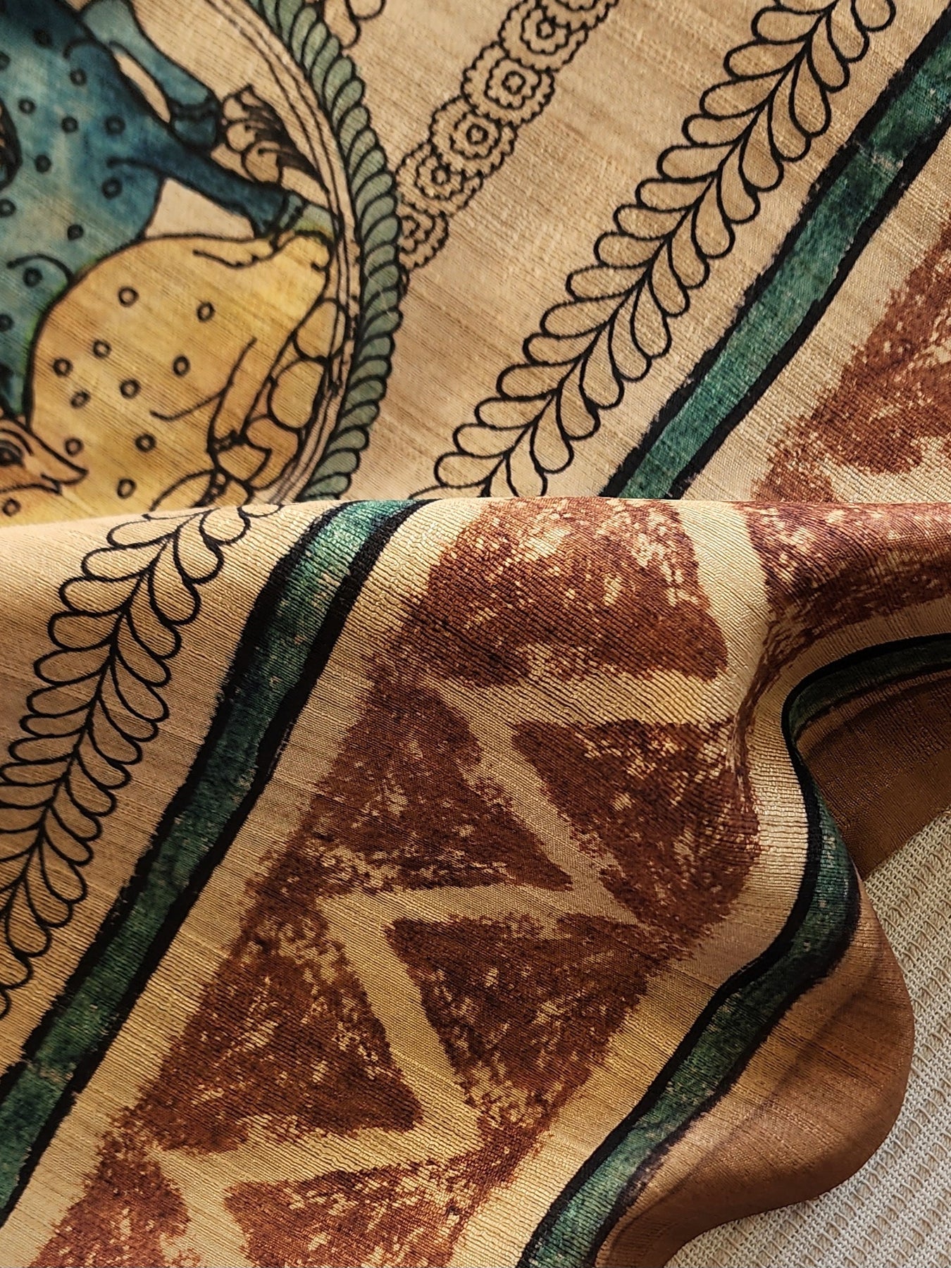 An elegant Semi Tussar Silk Saree with contrast borders and Kalamkari Prints on the body of the saree