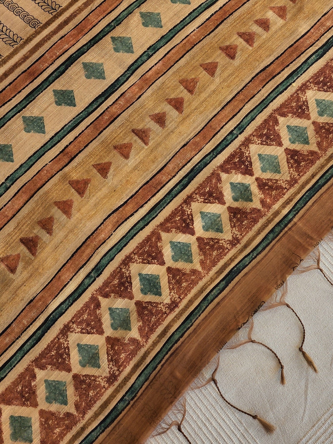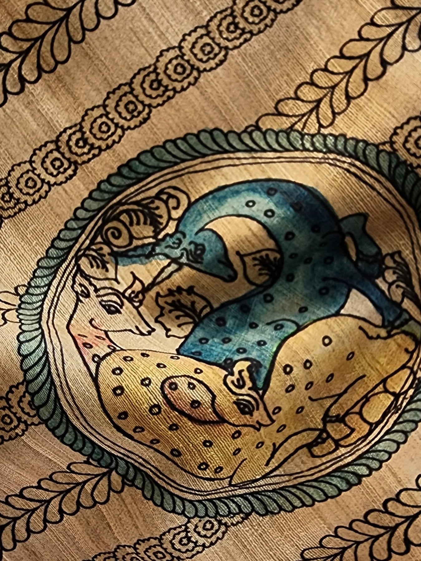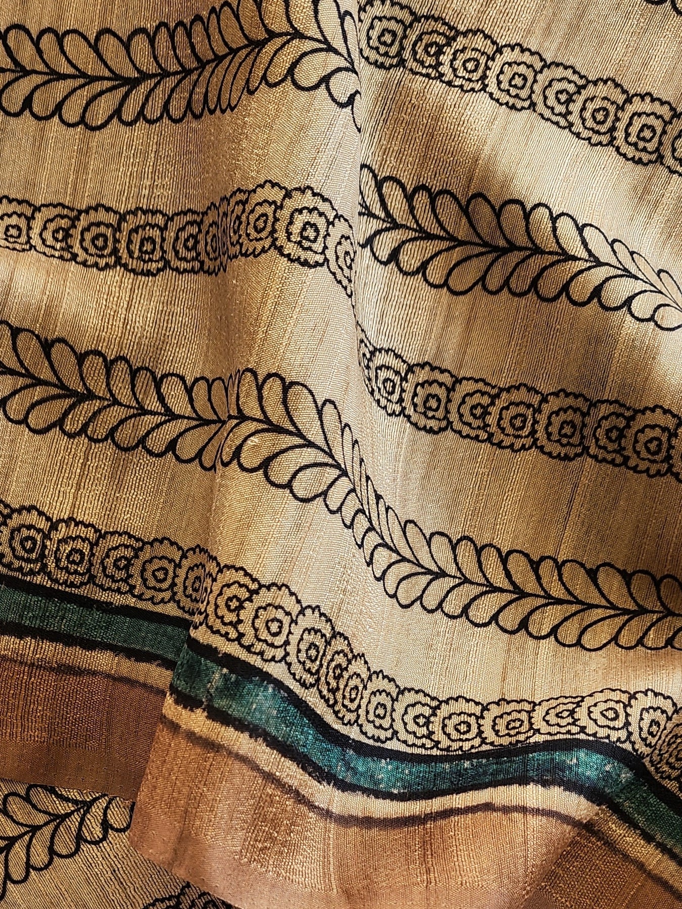 An elegant Semi Tussar Silk Saree with contrast borders and Kalamkari Prints on the body of the saree