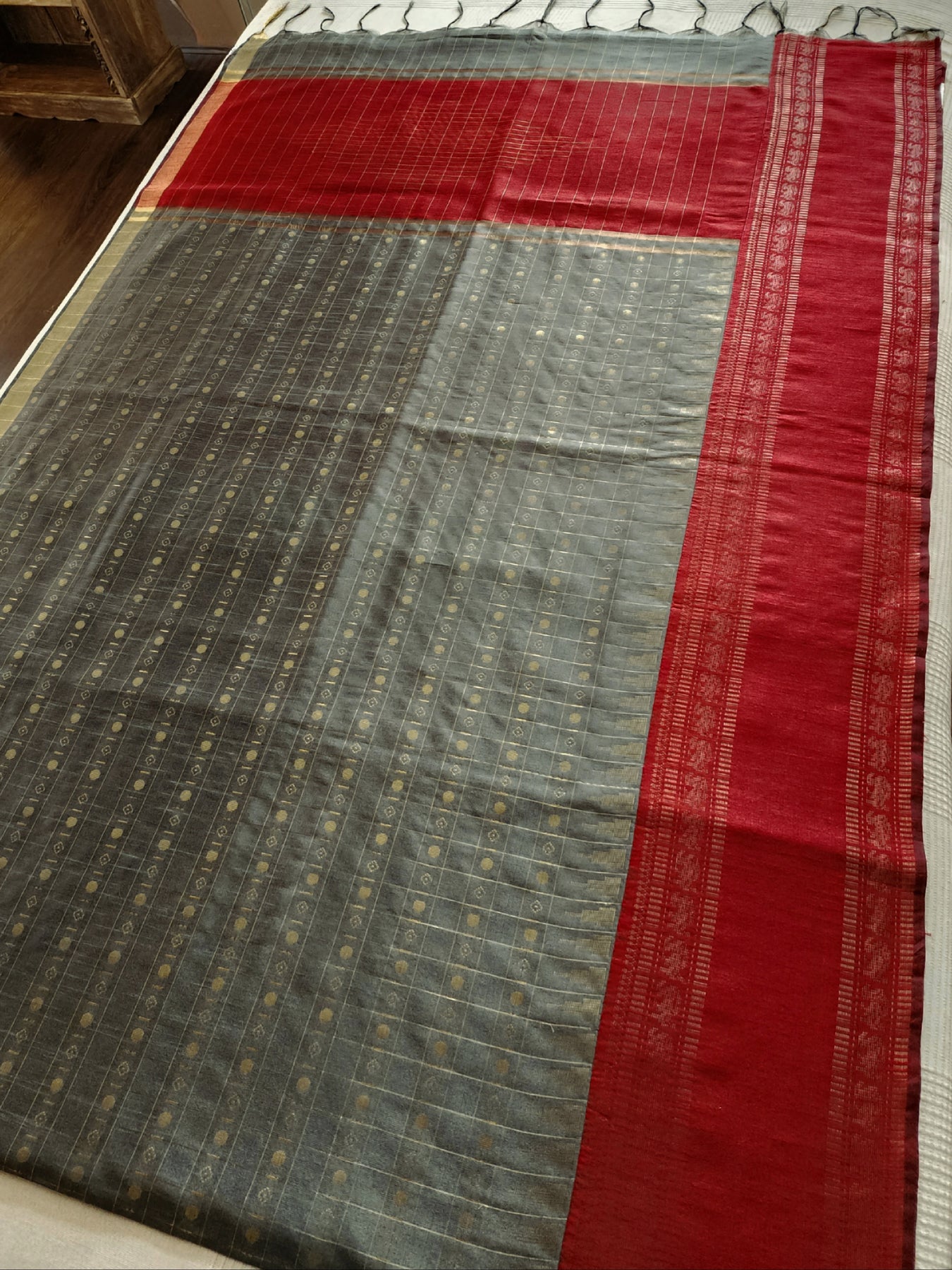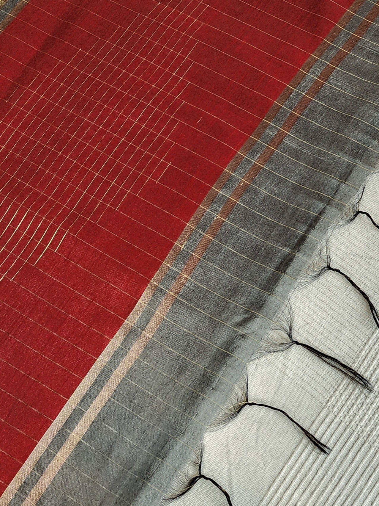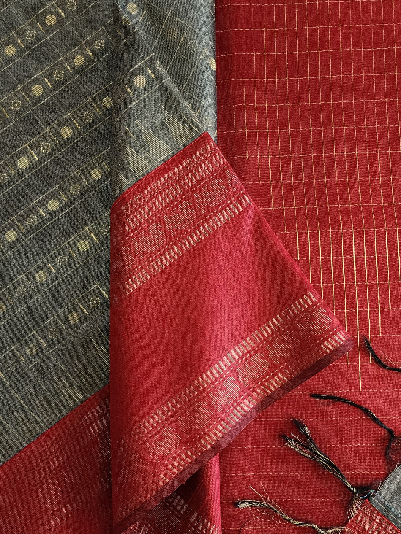 Grey Checked Semi Raw Silk Saree with contrast Red borders and pallu, beautifully finished with tassels
