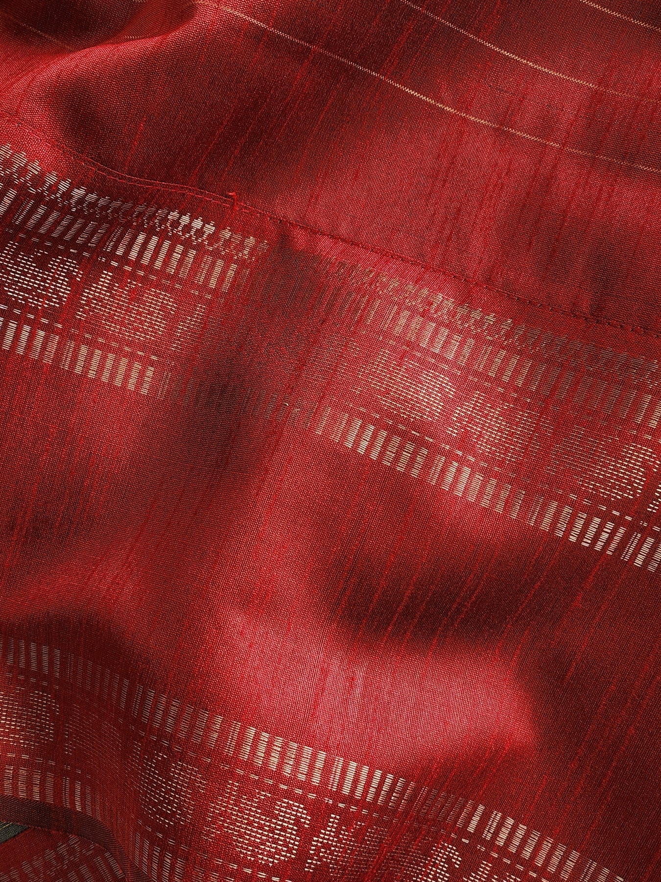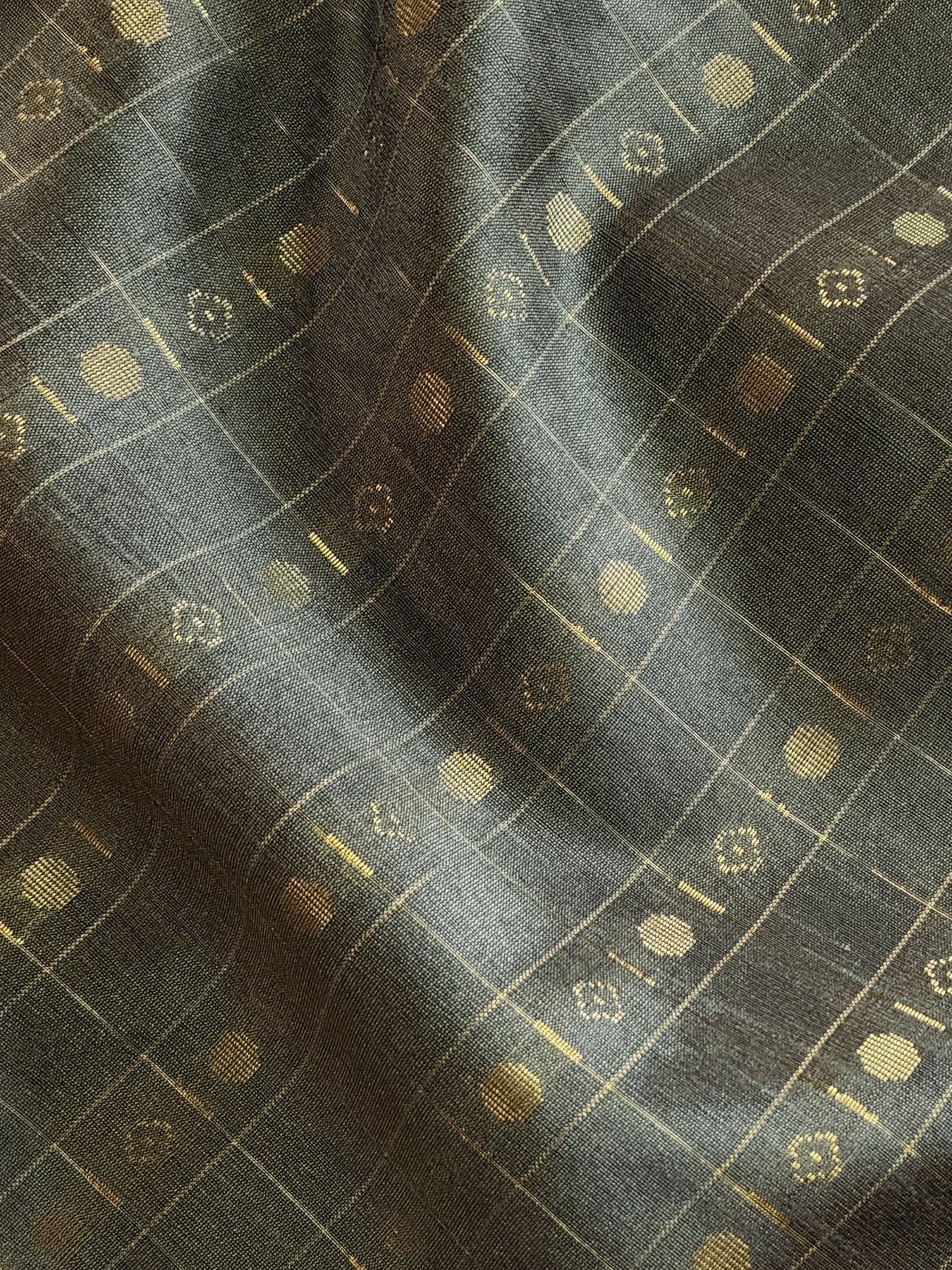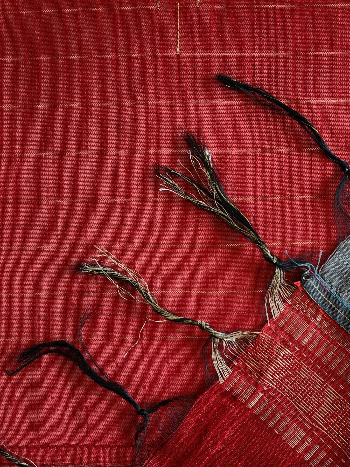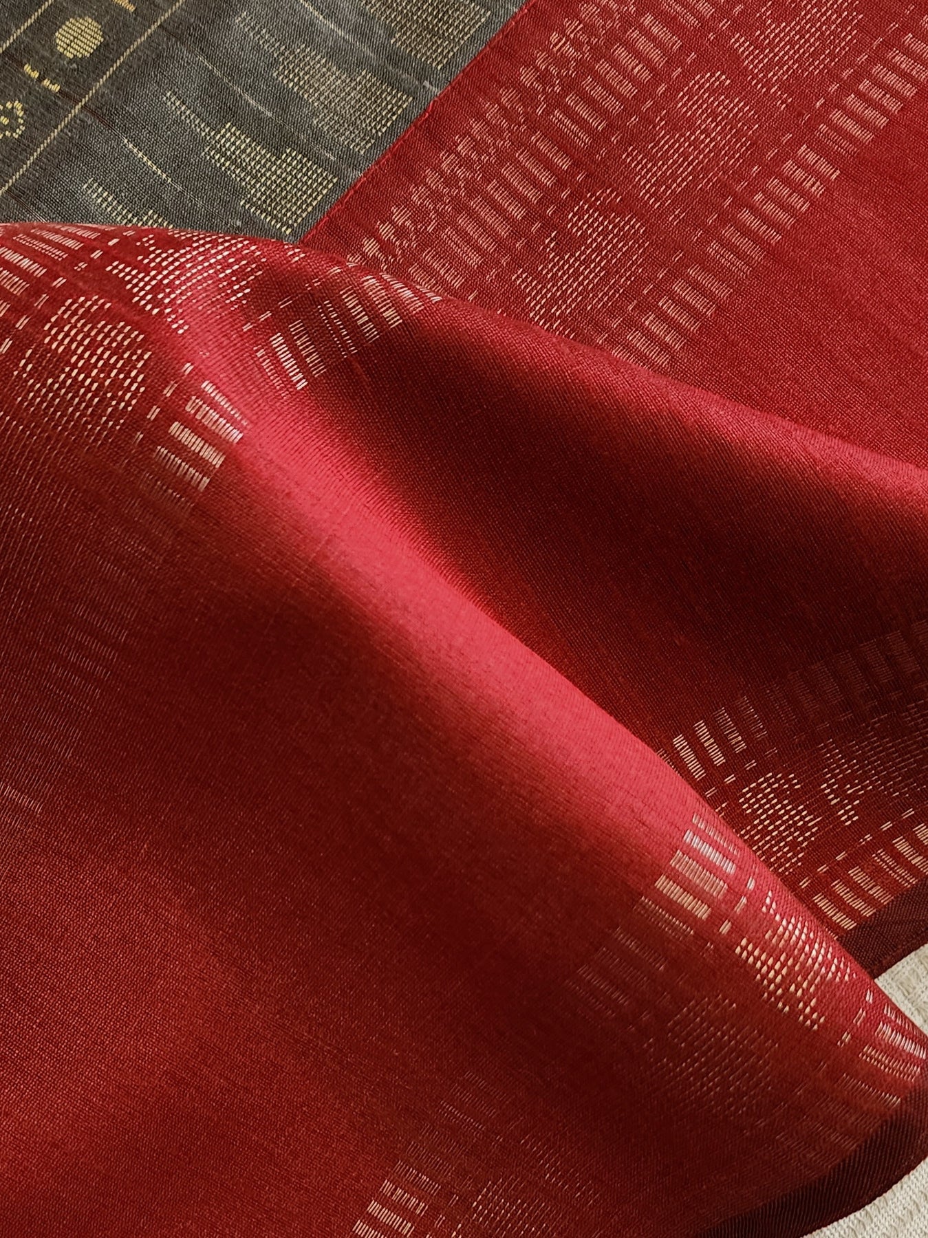 Grey Checked Semi Raw Silk Saree with contrast Red borders and pallu, beautifully finished with tassels