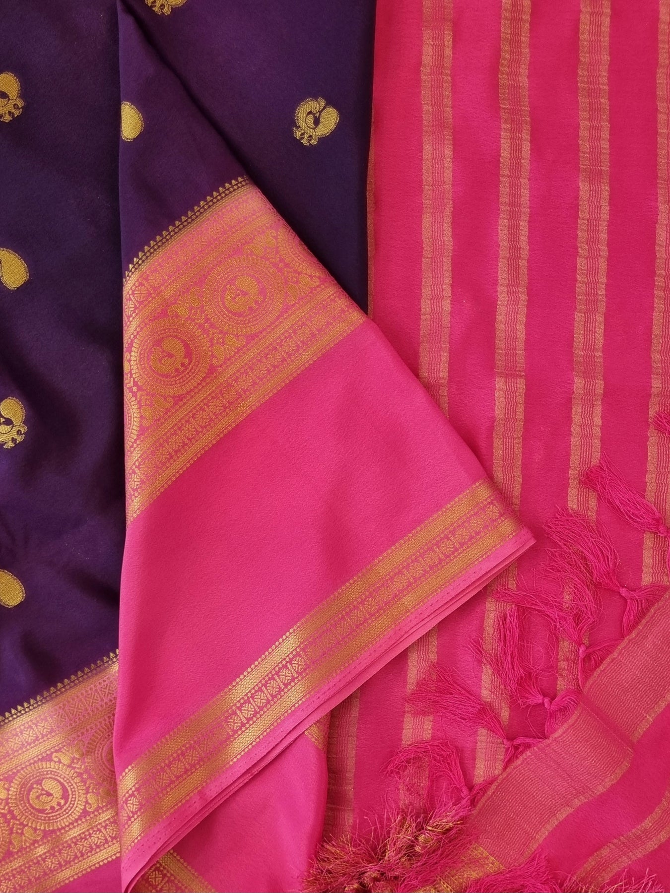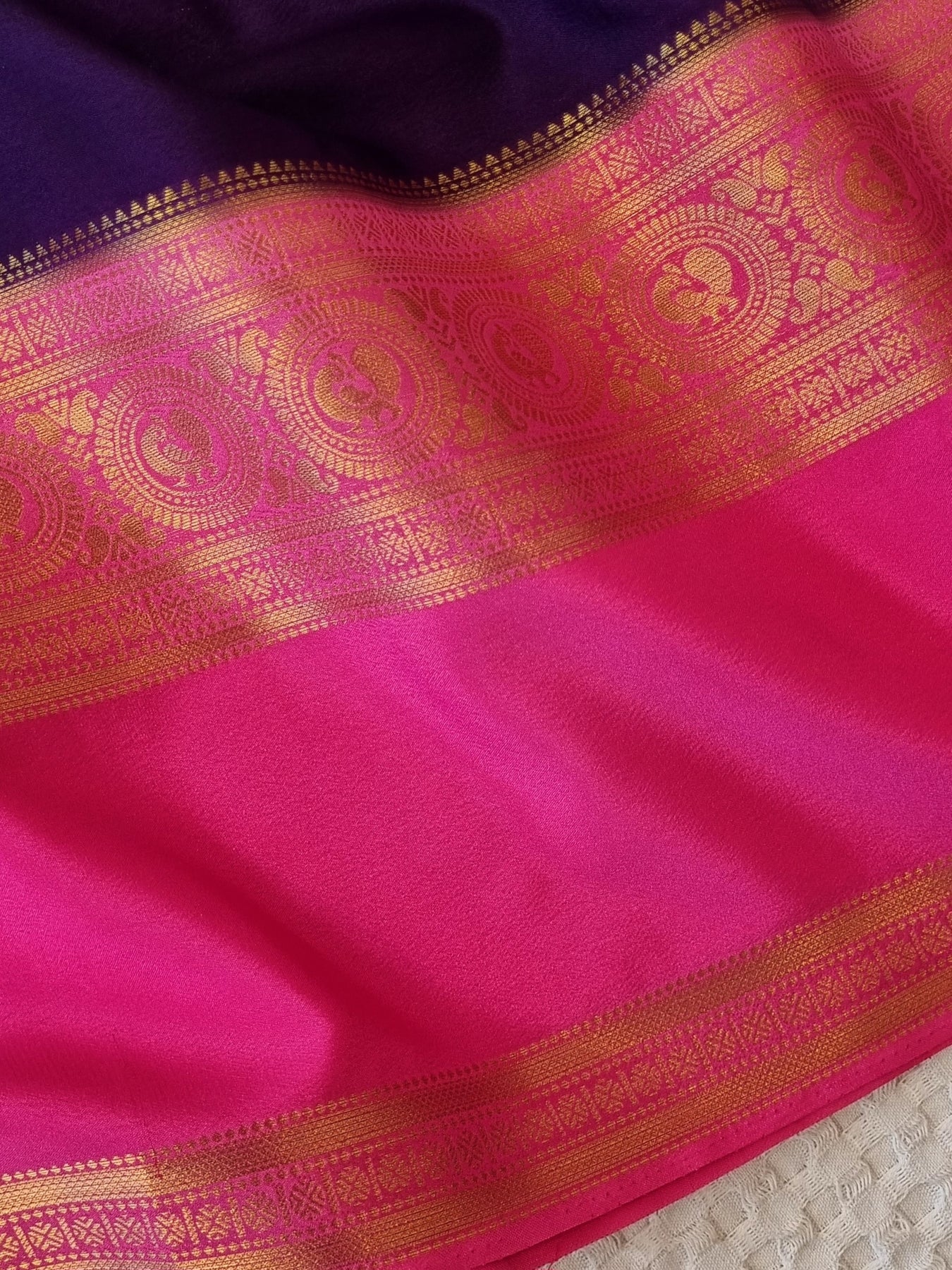 An elegant Purple Semi Georgette Silk Saree with Pink Contrast borders