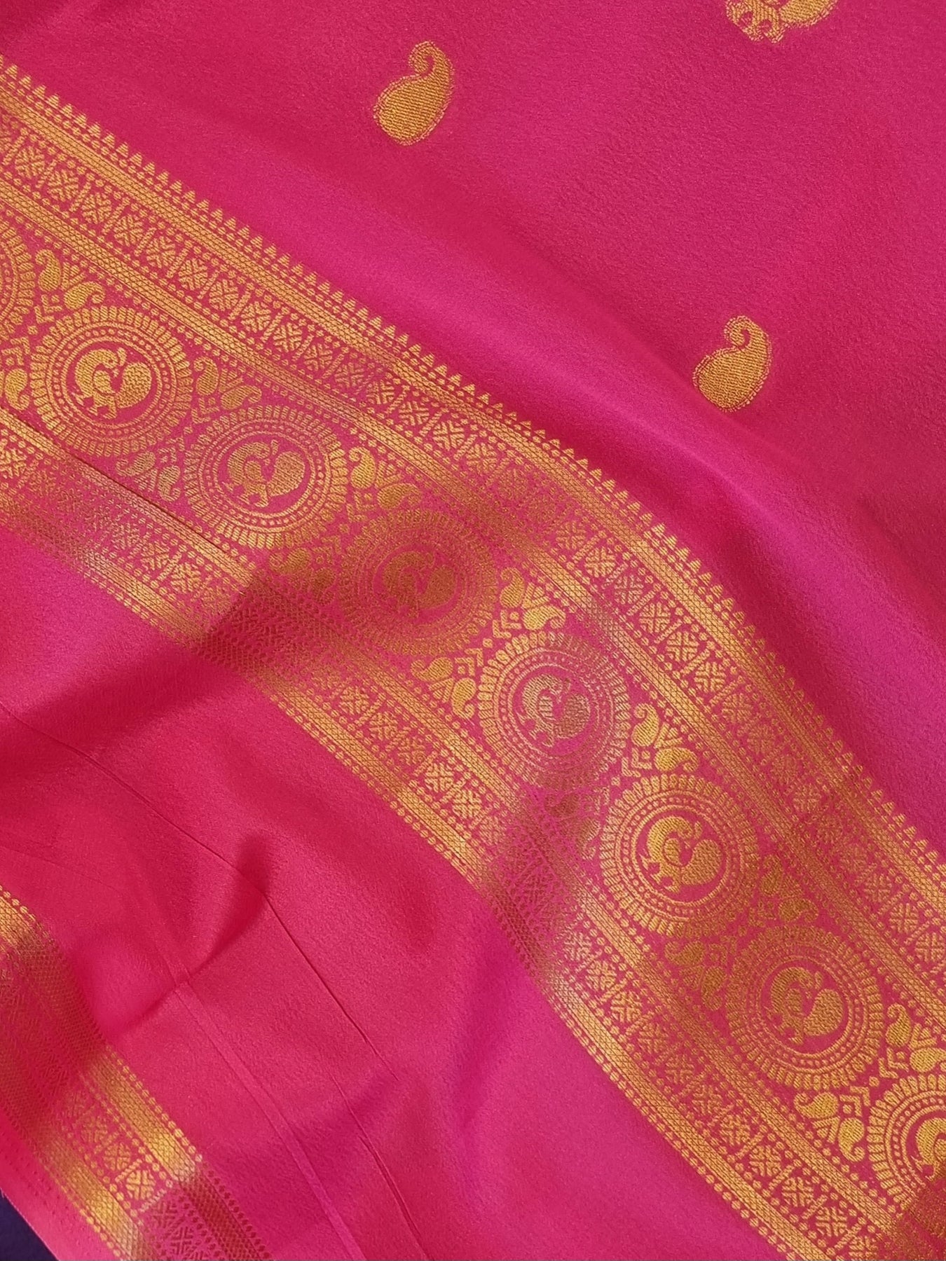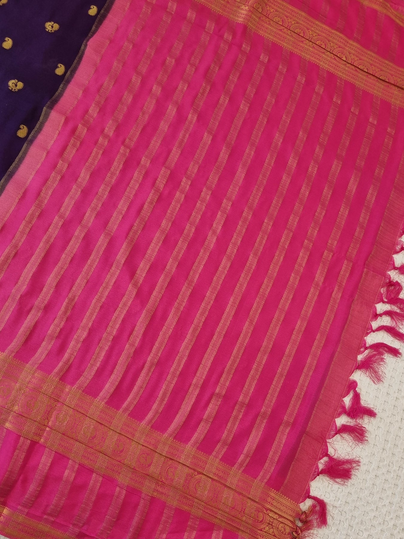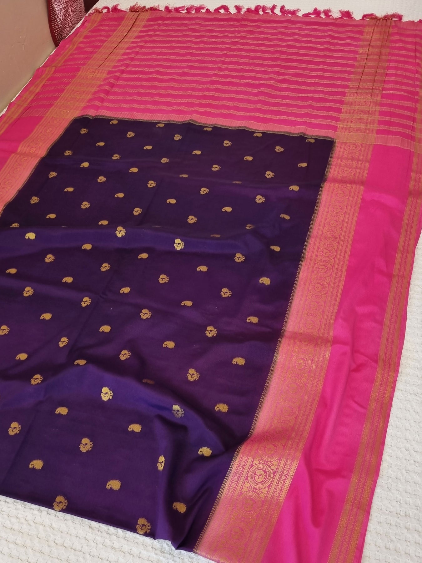 The beautiful Gold Zari Motifs on the body and pallu elevates the style quotient