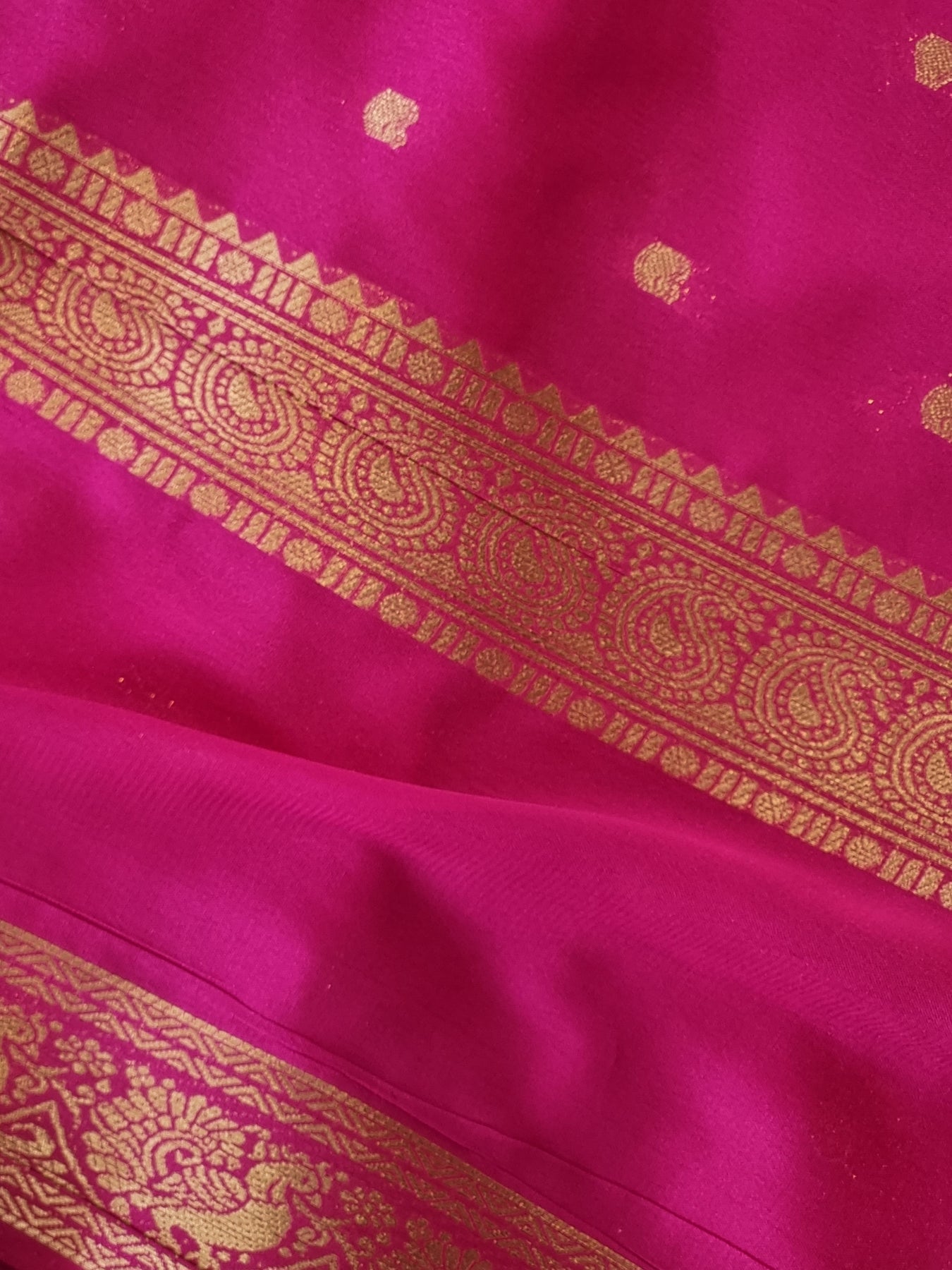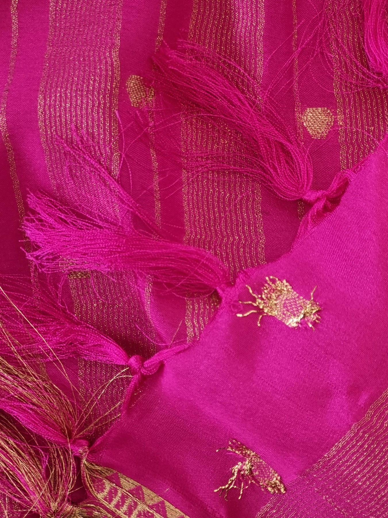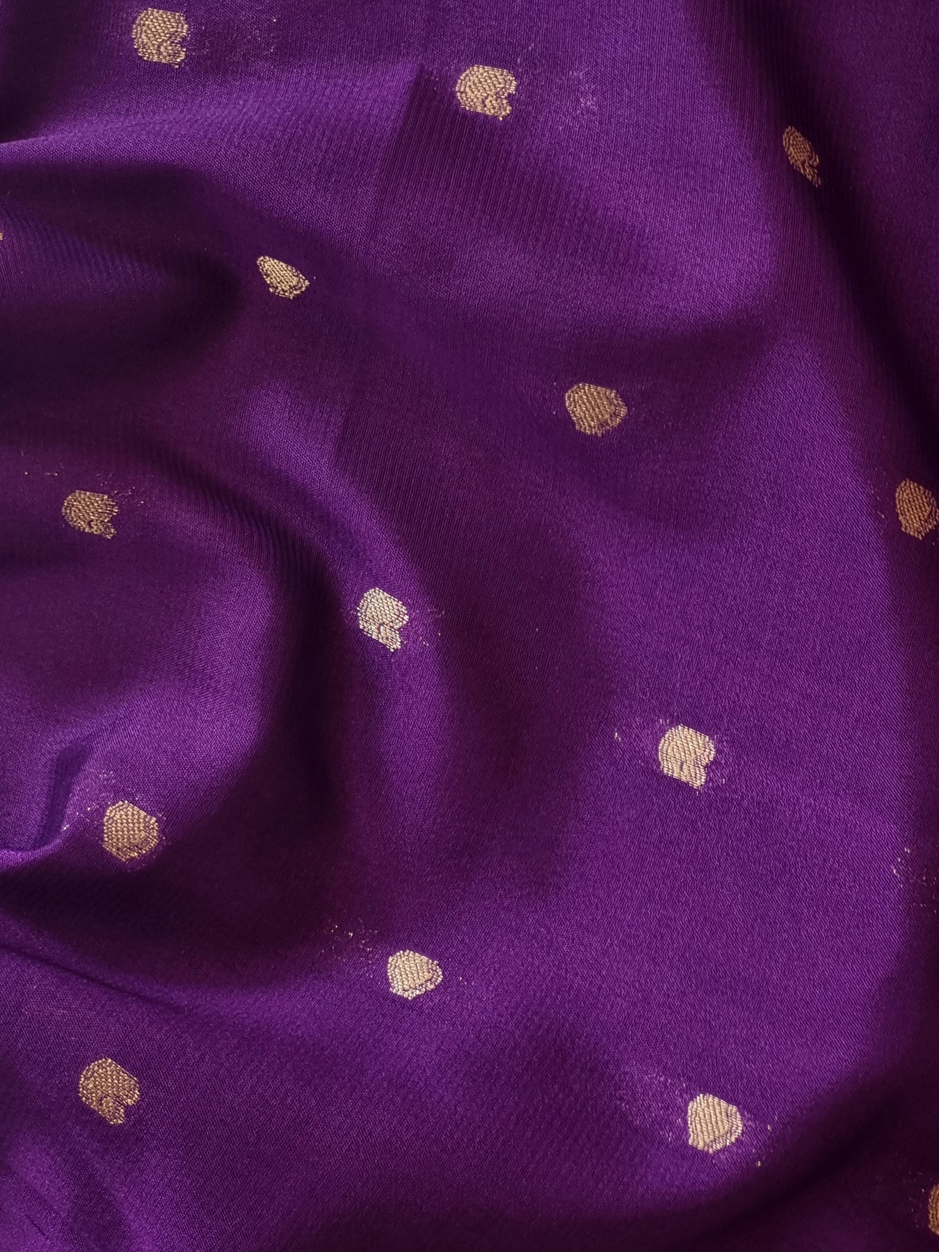 • The beautiful Gold Zari Motifs on the body and pallu elevates the style quotient