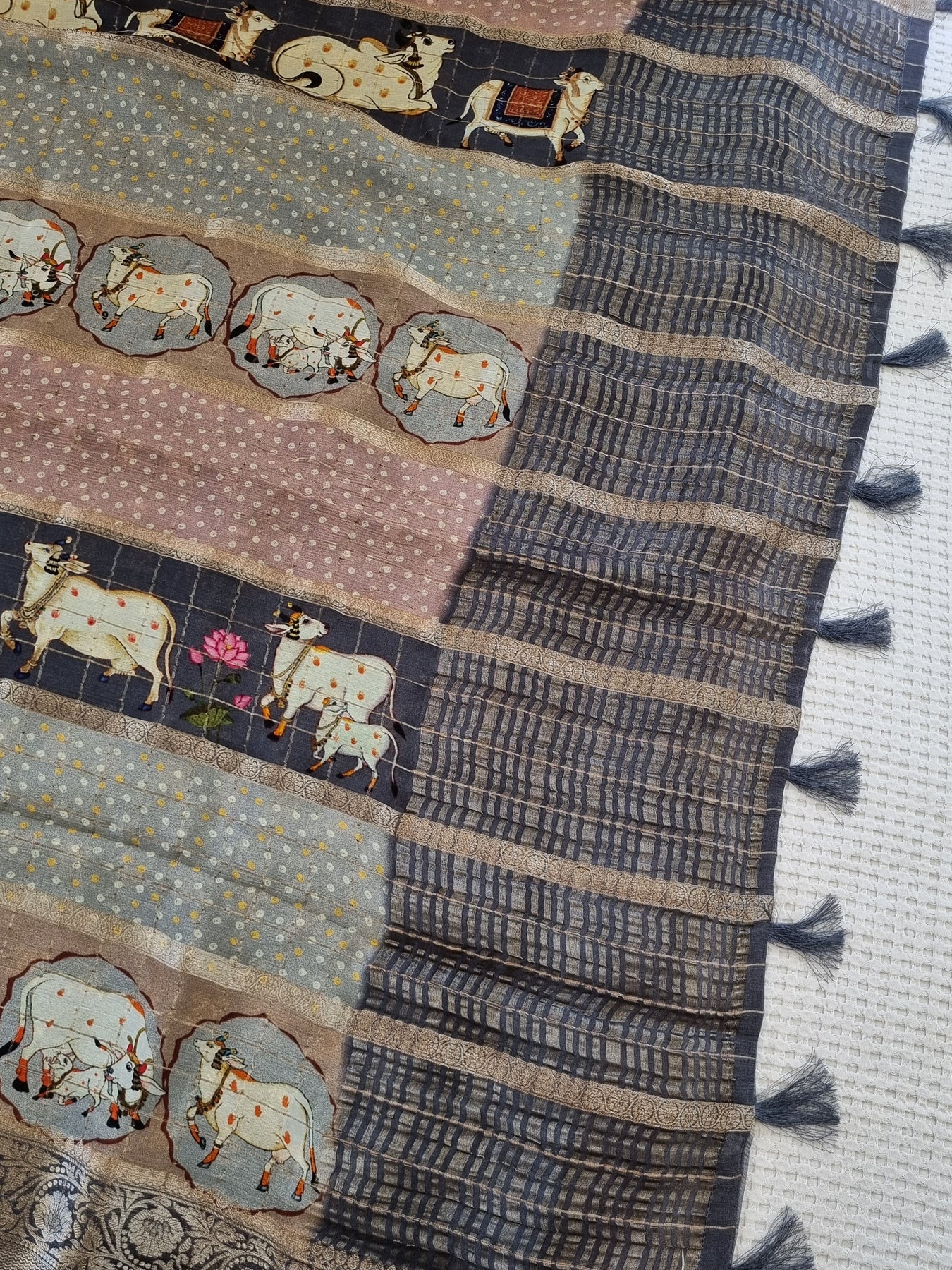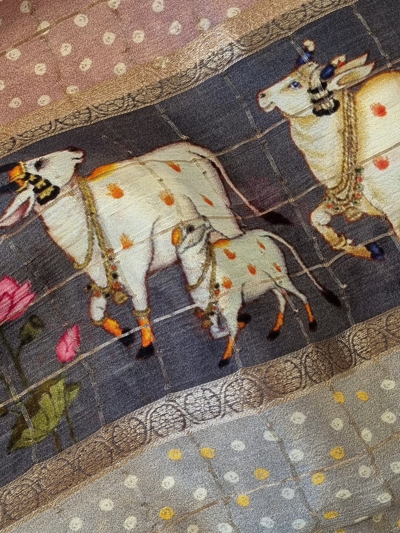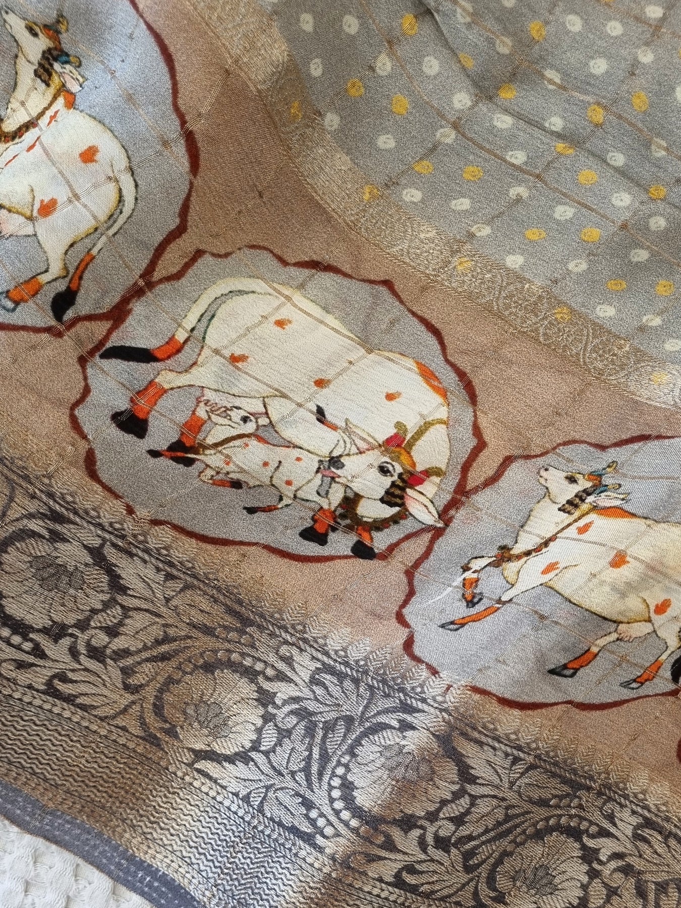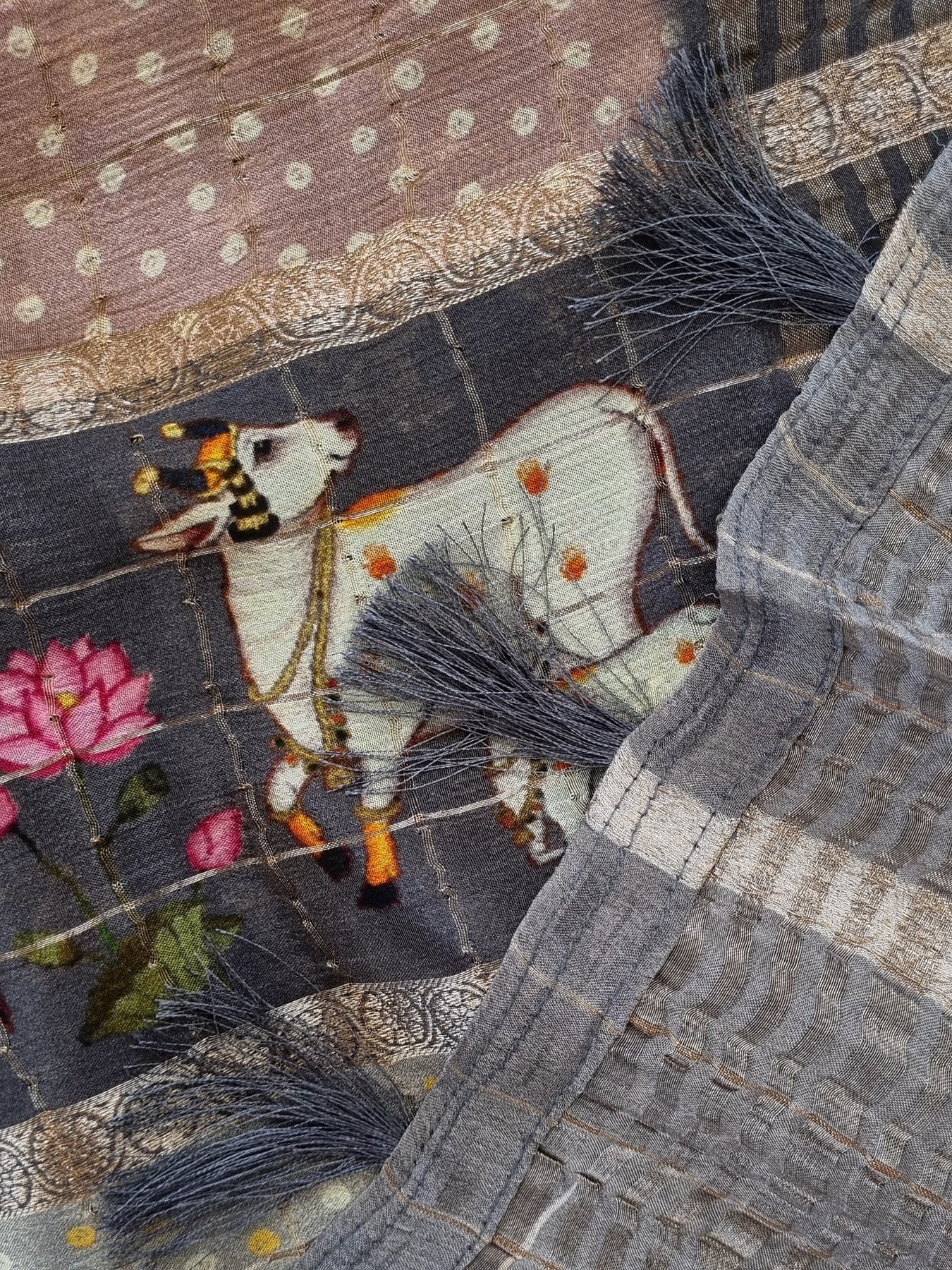The elegant Pichwai Prints on the body and pallu elevate the style quotient