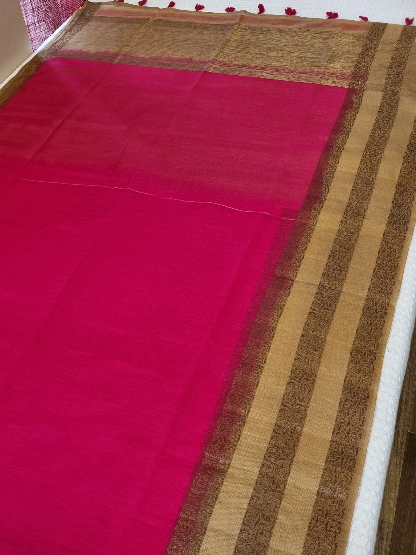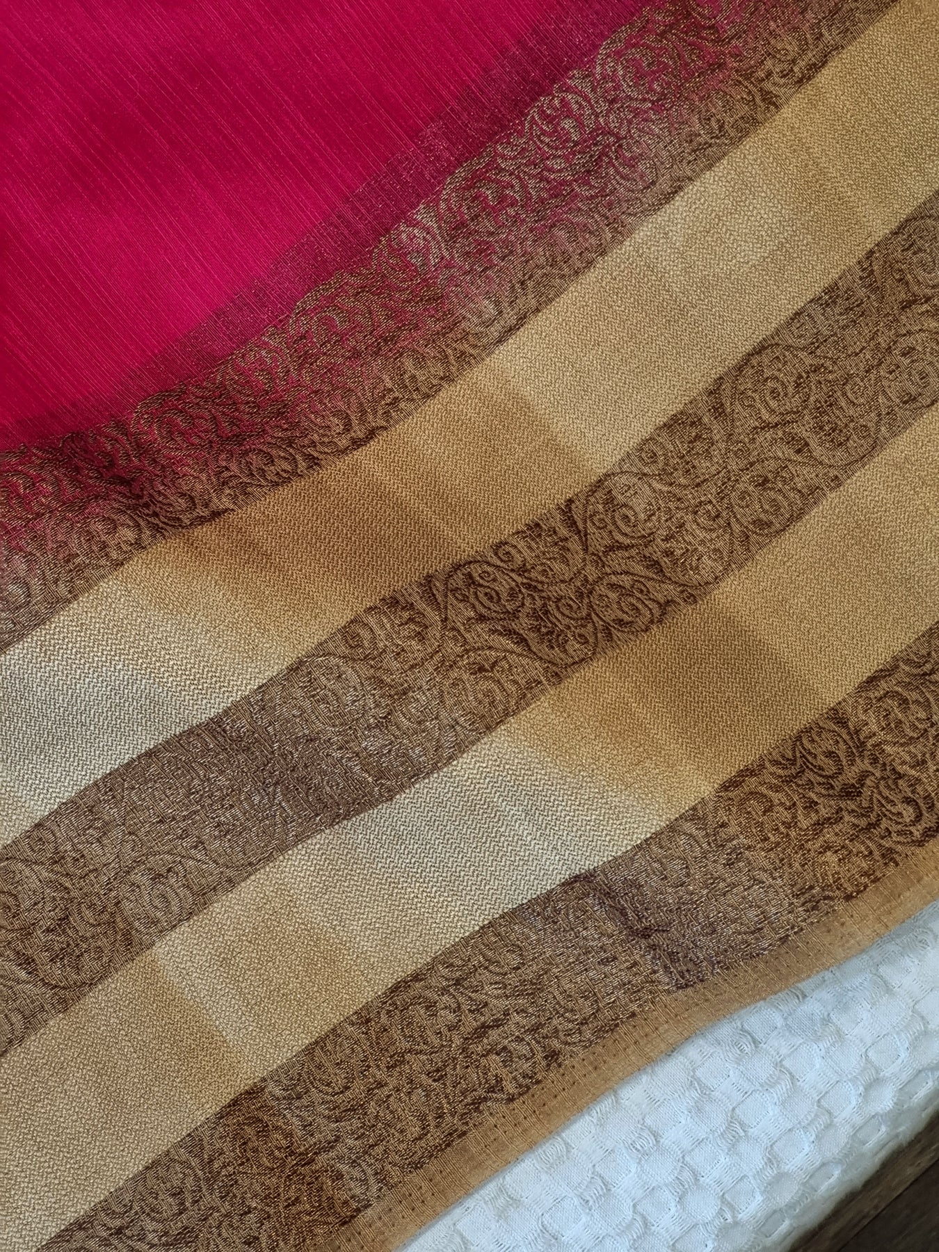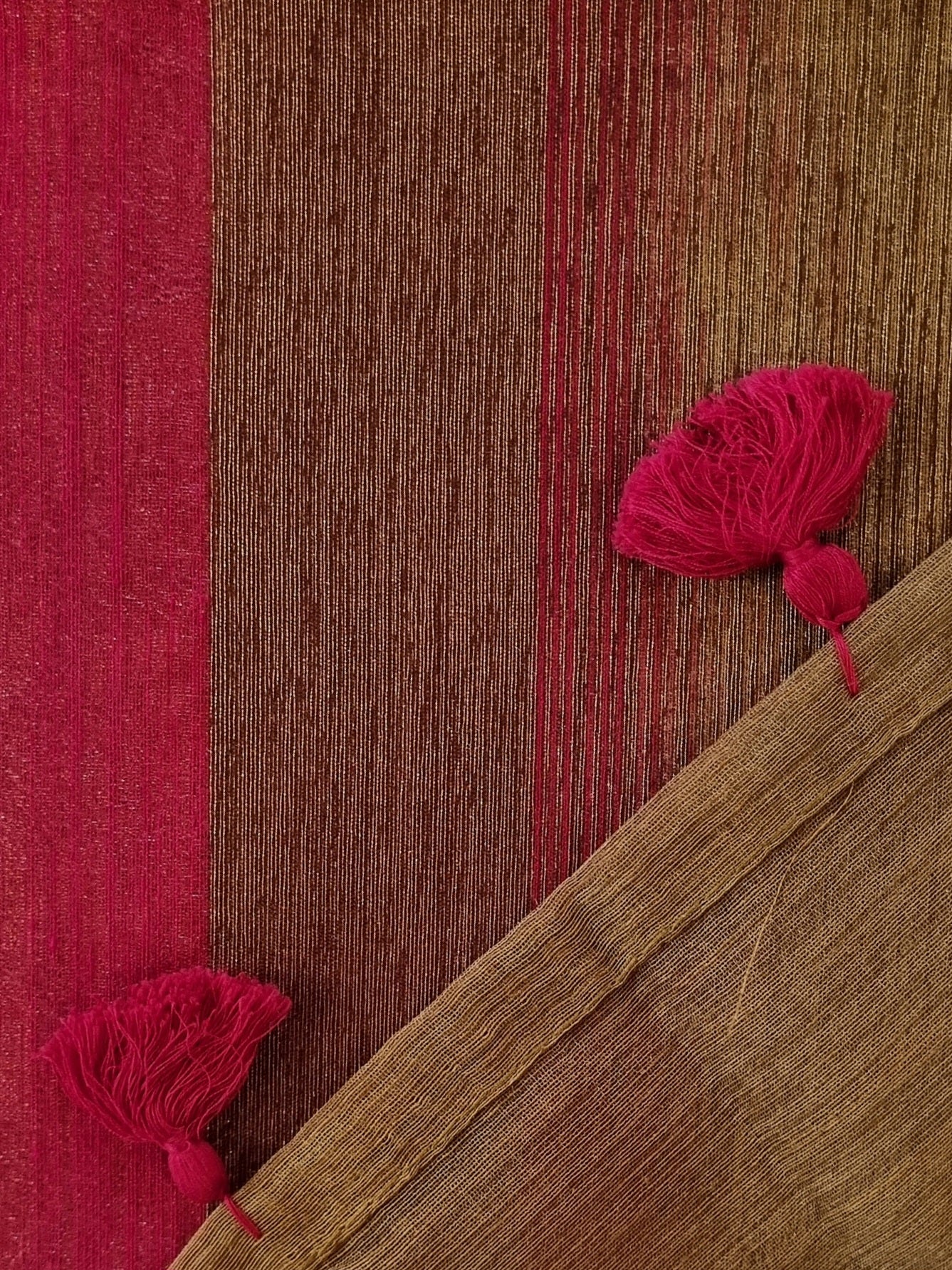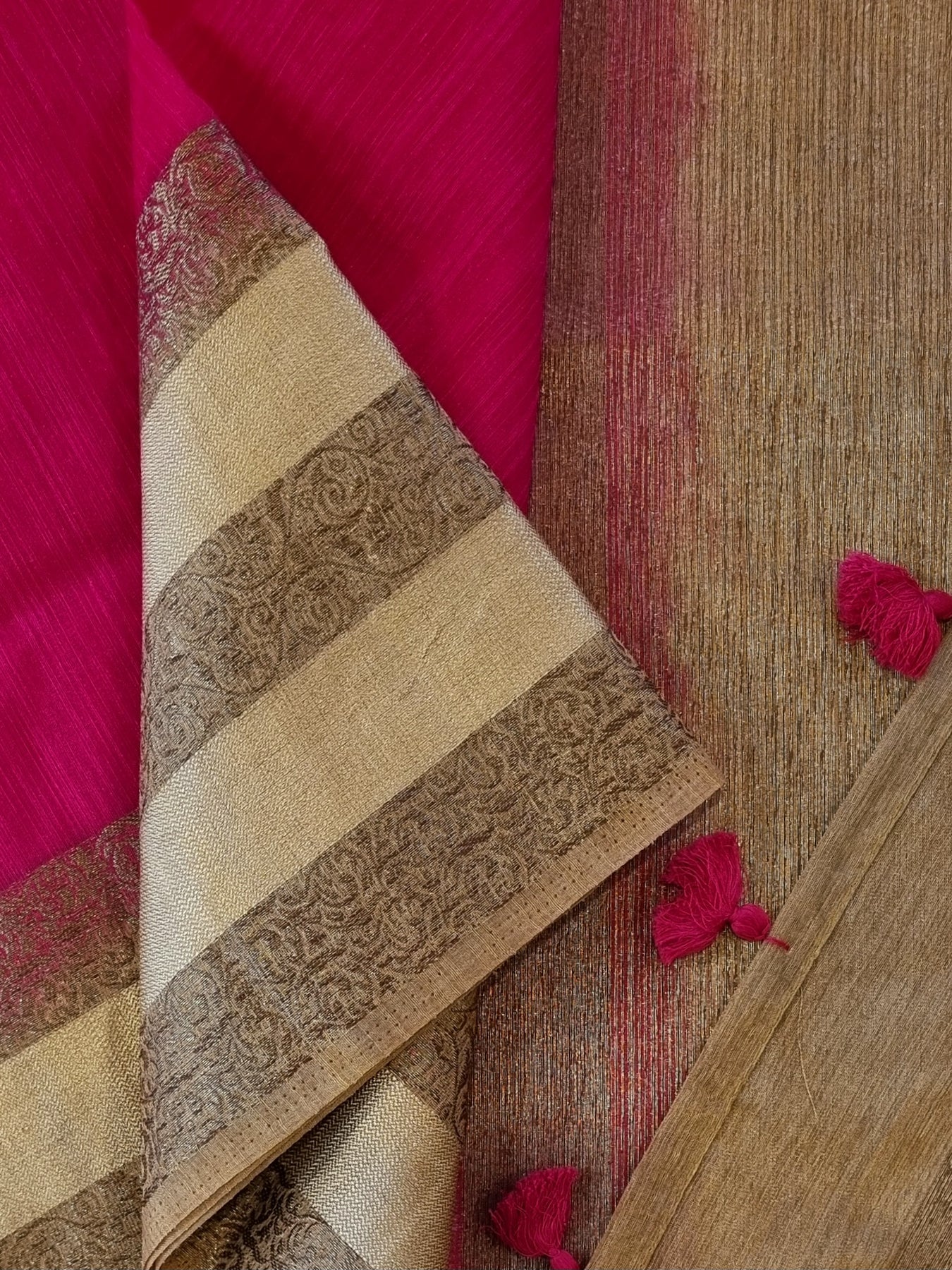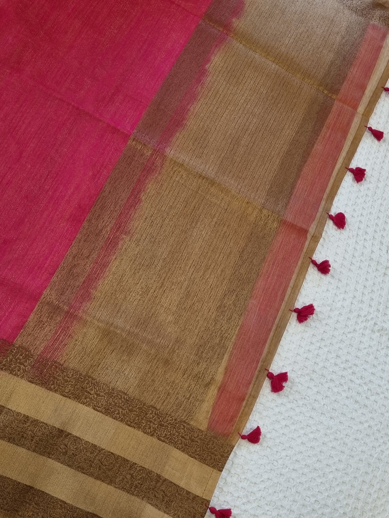 • Pink Semi Raw Silk Saree with striped woven borders and pallu, beautifully finished with tassels
