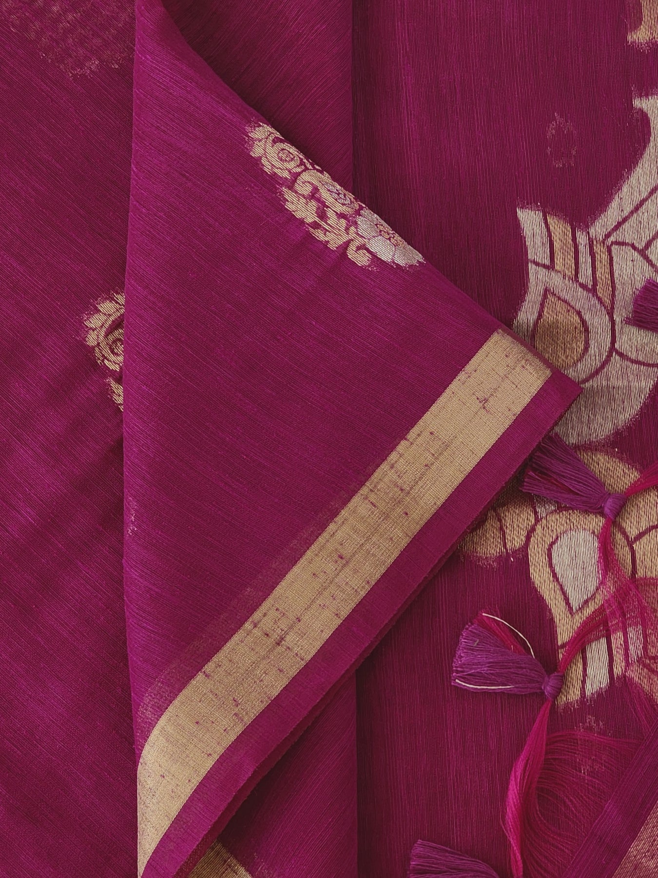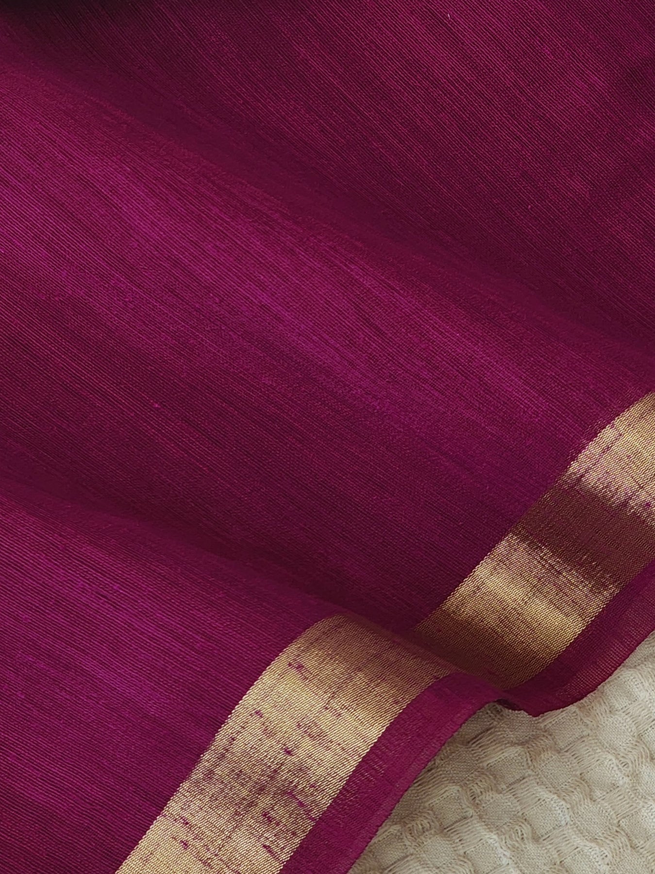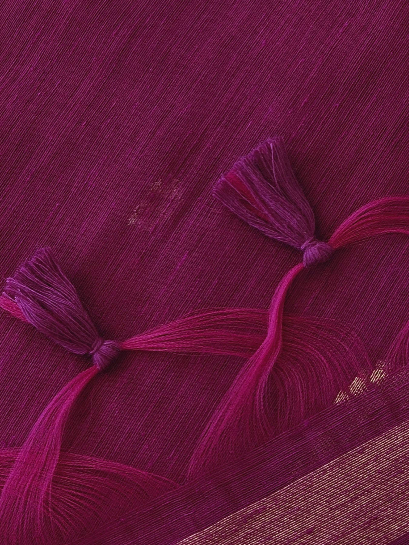 • Semi Raw Silk Saree with gold borders and pallu, beautifully finished with tassels