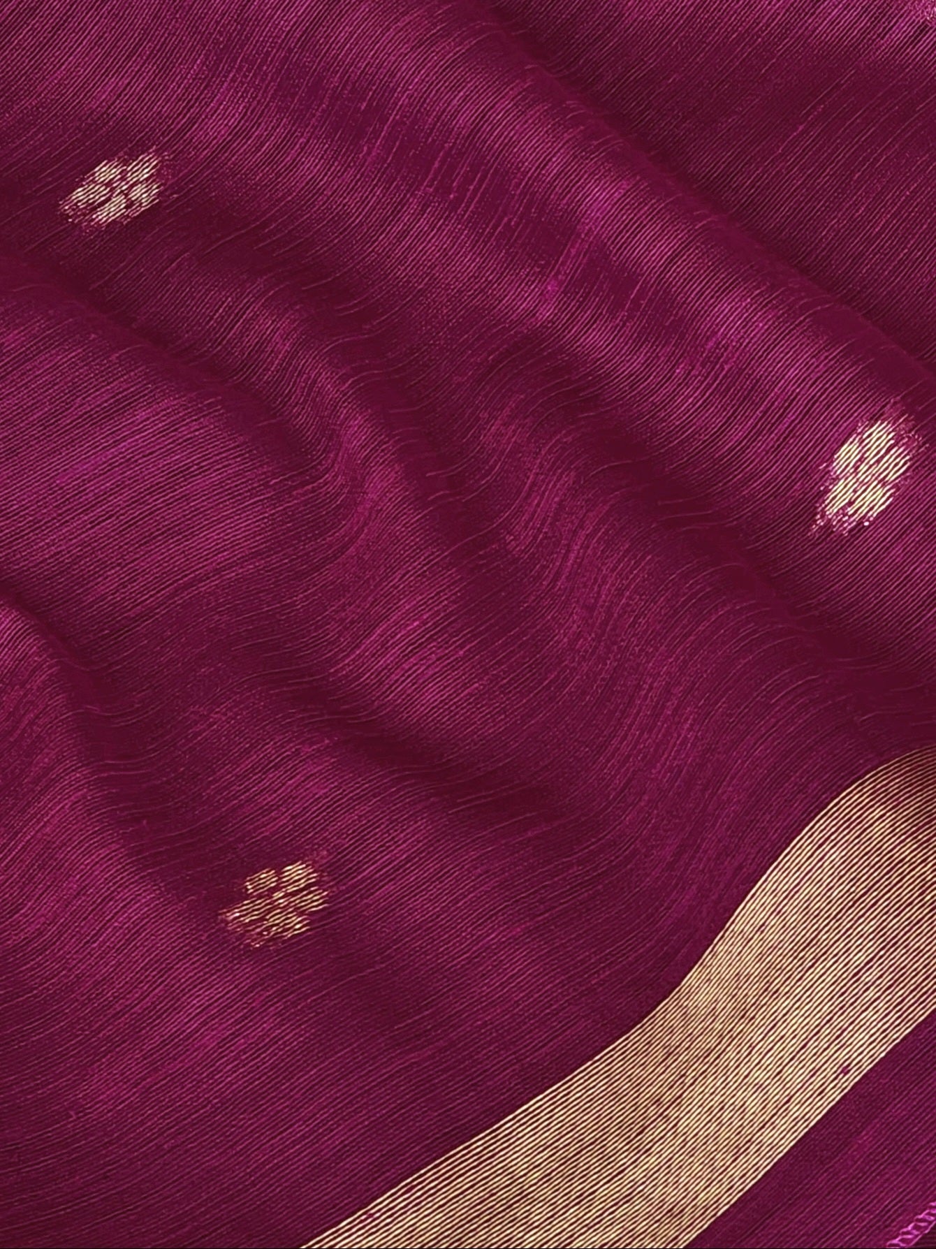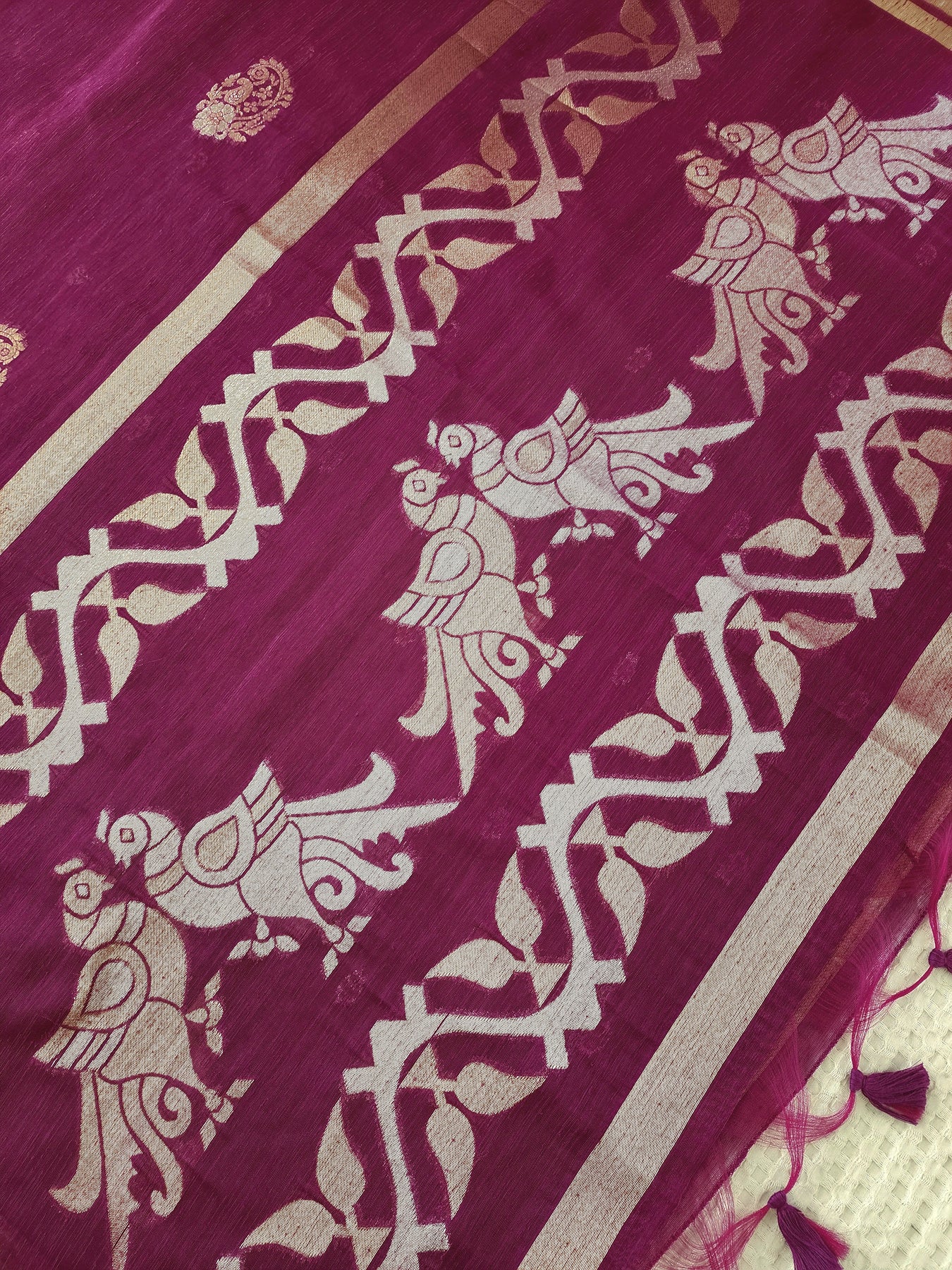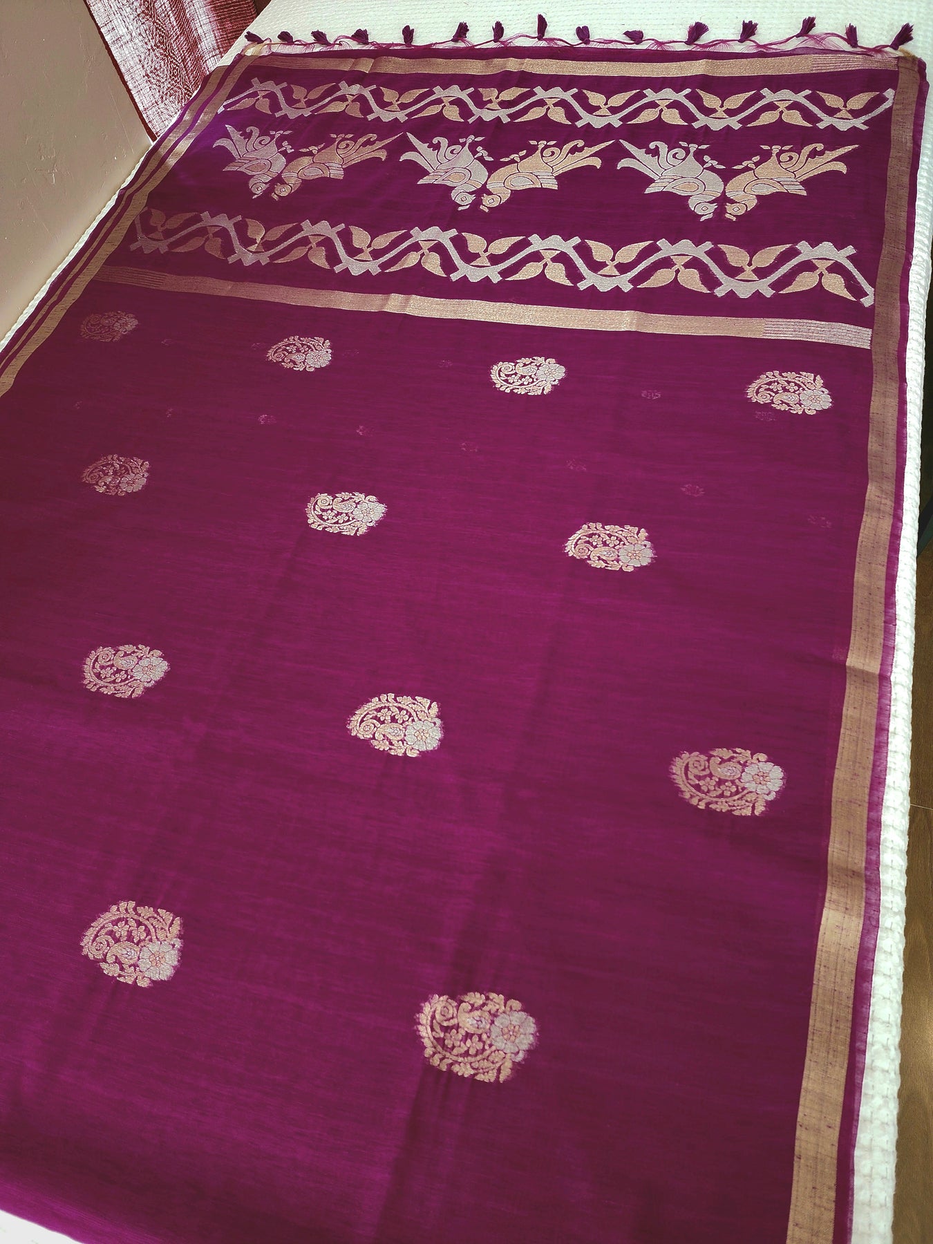 • Semi Raw Silk Saree with gold borders and pallu, beautifully finished with tassels