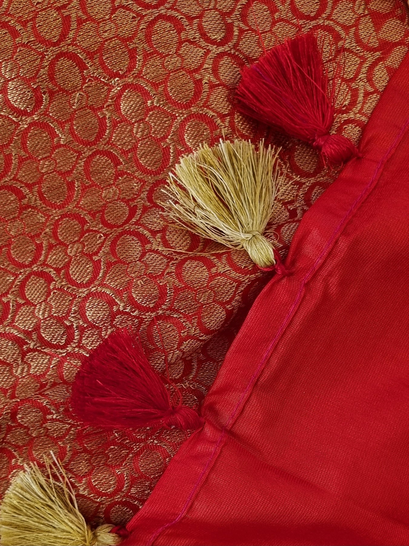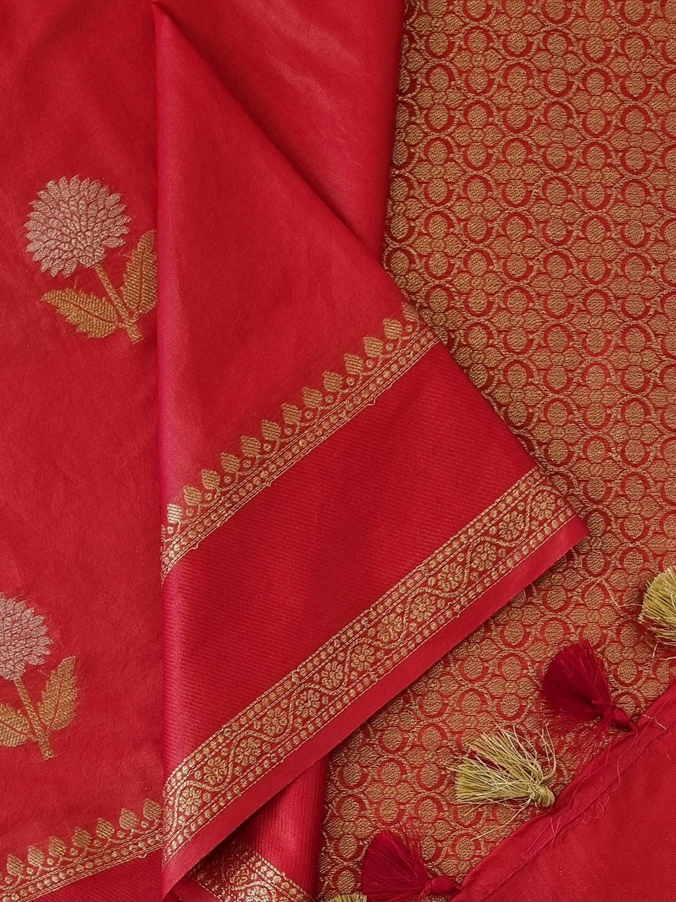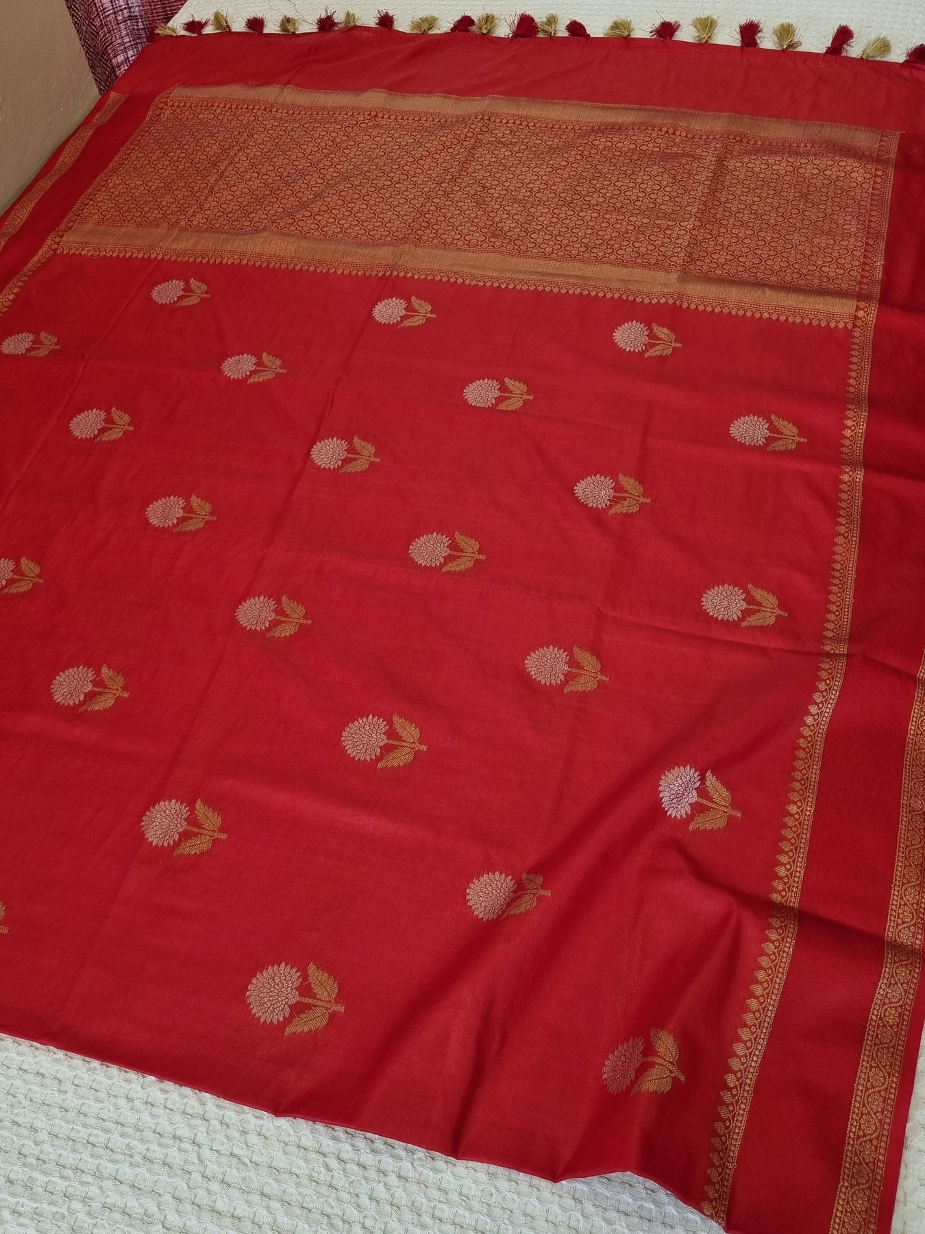 • Red Semi Silk Saree with woven borders and pallu, beautifully finished with tassels