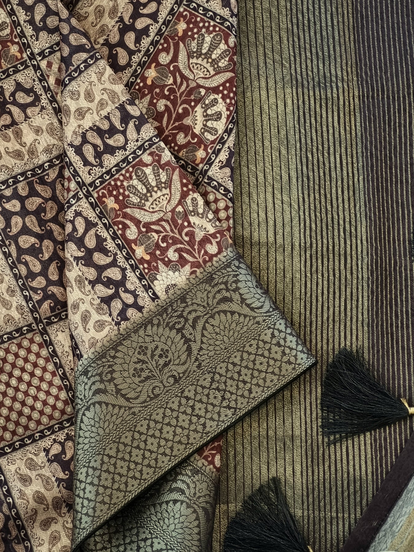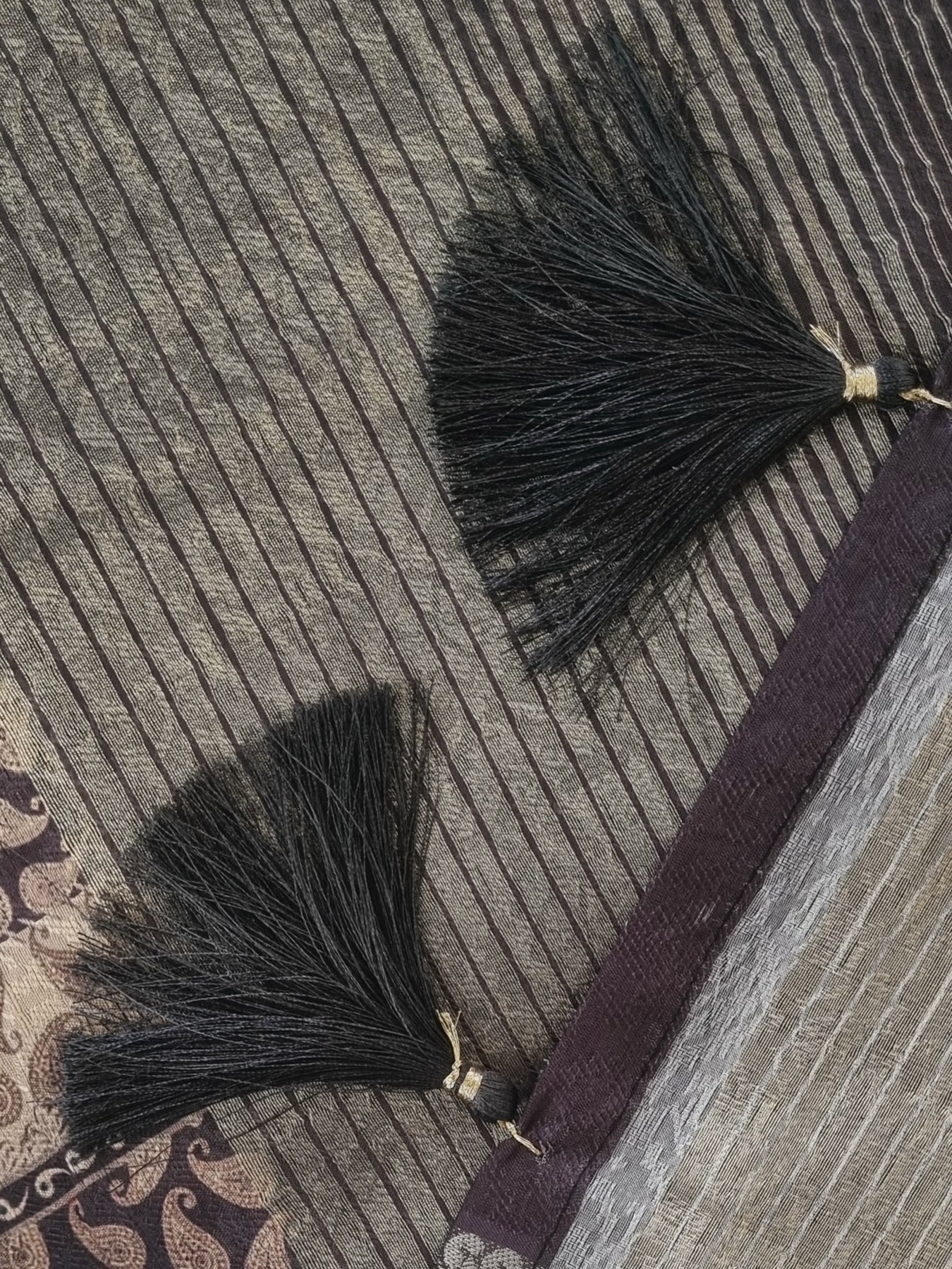 Black Semi-Silk Saree with intricately woven motifs on the body and a contrast pallu, beautifully finished with tassels